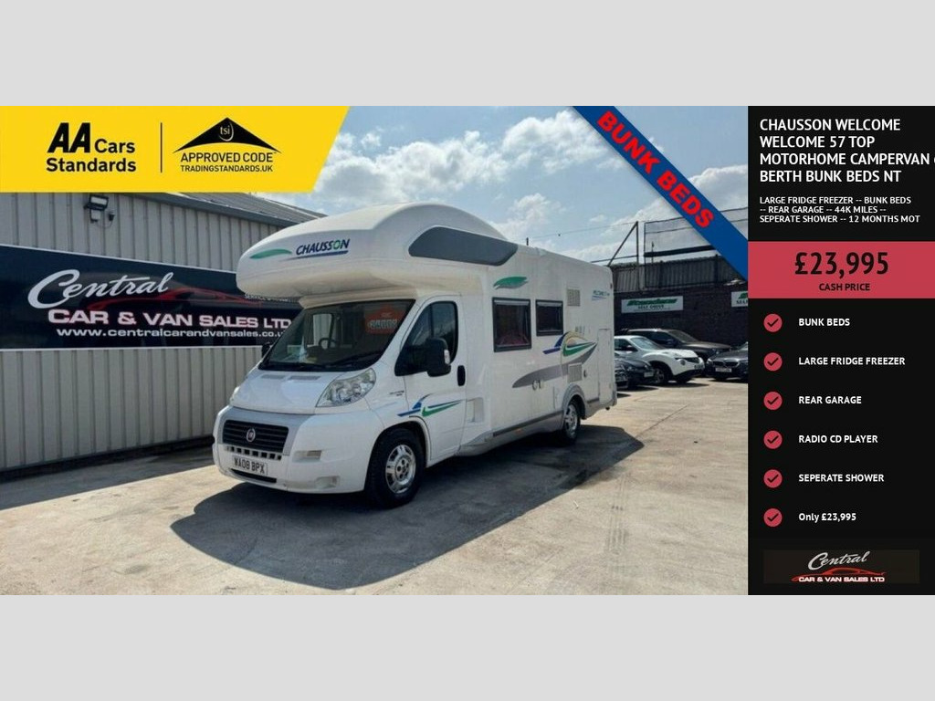 Chausson Welcome 57 Top 6 Berth Motorhome With Bunk Beds End Bedroom & Double Over Head Bunk, This Example is 4200KG And Comes With a Large Fridge Freezer, 5 Travel Seat Belts, Garage Area, Central Kitchen Dinette Area, Separate Shower, Swivel Captain Chairs, Perfect Family Tourer! All vehicles are HPI & Mileage checked. Test drives welcome. Nationwide delivery available. Video walk rounds and extra pictures are available please call to arrange., We are open Monday to Saturday 9am until 6pm out of hours appointments are available please contact to arrange! We have over 50 Finance Lenders on our panel to help you get the finance deal that best suits your needs! 12 Months MOT on every motorhome we sell, Fresh Service on motorhome we sell, Nationwide extendable warranty on every motorhome we sell. ABS, Airbags, Alarm, Central Locking, Immobiliser, PAS, Remote Central Locking, Remote Locking , Electric Mirrors, Cruise Control, Power Steering, Stereo, CD Player , Cloth Trim, Electric Windows, Single Passenger Seat, Grp Body, Medium Hightop, Service History