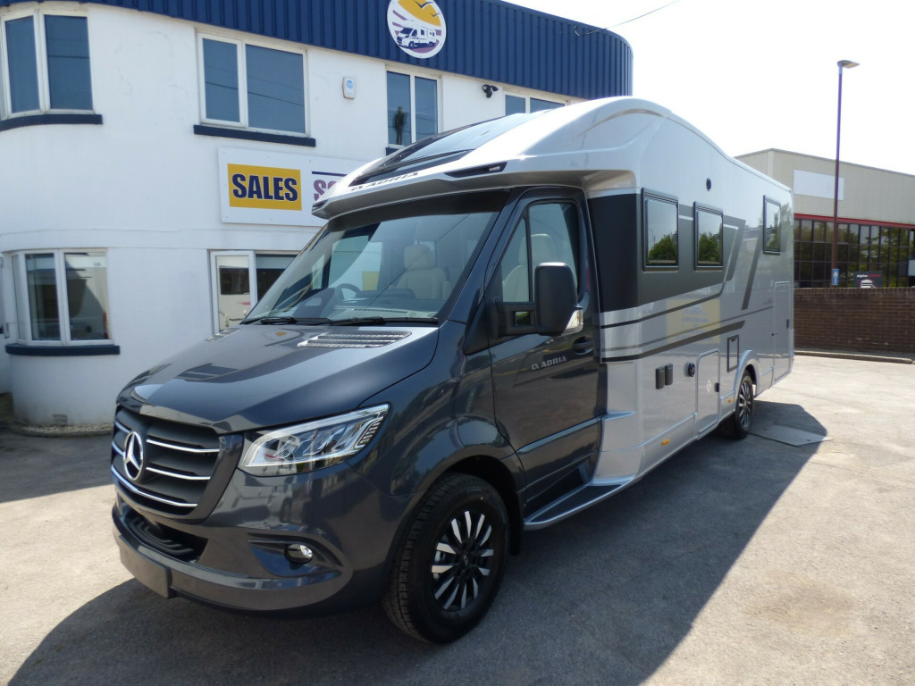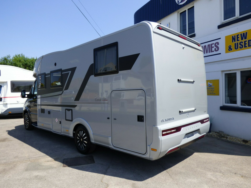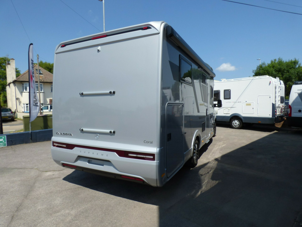 Special Offer - Free Solent Prestige Pack worth £1655 included with this motorhome comprising: Scorpion Defender S5+ Alarm & Tracker, Falcon 22'' Smart TV, WiFi and Soundbar.In Stock Now! New 2025 Model Adria Coral Supreme 670 DC., this is the highest spec available in the UK! Ready to drive away! The stunning Adria Coral Supreme 670 DC is based on the Mercedes-Benz chassis with 170bhp engine and automatic transmission. The front seats swivel to face opposing sofas making a dinette that can seat five and turns into a single bed for night time use. Trimmed in Beige ''Charles'' Leather, it is a luxurious motorhome with a very light and airy feel thanks to the very large sun roof panel. The kitchen is fitted with a 3 burner gas hob, gas oven and grill along with a fridge/freezer and coffee machine. The central bathroom has a separate shower cubicle and opposite, there is a cassette type toilet and wash hand basin all separated by a Jack & Jill door to provide privacy to the bedroom and lounge areas. The rear bedroom has a large Island bed with a tilt mechanism to allow day time use. Lots of cupboard space can be found throughout and there is a large rear garage too. Heating and hot water are provided via an Alde system and other features for this Adria Coral Supreme 670 DC include: Leather Upholstery, MB Lux Pack, Thule awning, Roof mounted Habitation A/C, Nespresso coffee machine, solar panel, corner steadies, Fiat Lux Pack, 2nd Leisure battery, Carpets and Distronic Adaptive Cruise Control. 3 Berth, 4 Seatbelts, L. 7.690m, W. 2.29m, H. 2.905m, 4,500kg. Delivery Miles. This vehicle comes with a Free pack worth £1500 including: Alarm and Tracker, 22'' Falcon Smart TV, WiFi and Soundbar.This motorhome is equipped with £21,100.00 worth of options over and above the standard. Price includes dealer contribution of £5655.00 in addition to the Prestige Pack. aptive cruise control, alde heating system, alloy wheels, automatic transmission, carpets, coffee machine, corner legs, habitation air conditioning, leather upholstery, mercedes-benz lux pack, solar panel, twin leisure battery option, free prestige pack worth £1655!, 16'' Alloys
