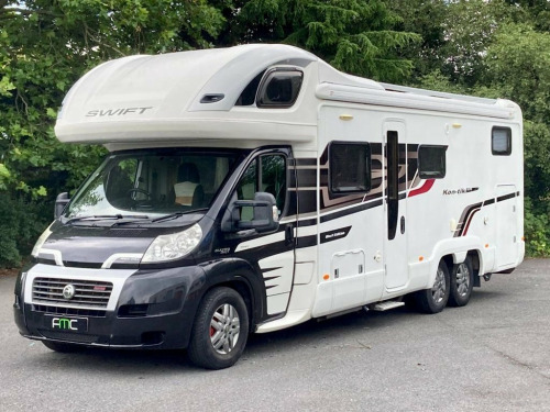Swift Kon-tiki 679 6 berth motorhome Layout is over-cab double bed, central lounge and dining area which converts to double bed, central kitchen, central washroom and fixed bed over rear garage. The kitchen area has a hob with 3x gas and 1x electric ring, sink, oven, grill, microwave, extractor fan and fridge with separate freezer compartment which operate on gas or electric. Heating and hot water are provided by a Truma system which operates on gas or electric. The washroom has electric flush cassette toilet, sink and shower enclosure. The rear bedroom has an access hatch to the large rear garage and is fitted with a TV DVD. The motorhome has a directional TV aerial, electric hook up, a further TV DVD player in the lounge, 230v and 12v power points, full dining table and an additional occasional table. Outside the motorhome has a retractable electric step, reversing camera, detachable tow bar with 13 pin electrics, an awning canopy and a large garage with storage racks. The motorhome has cruise control, cab air-con, alarm and swivel seats. Base vehicle is Fiat Ducato 180 Multi-jet 2999cc with 6 speed manual gearbox. Approx vehicle dimension are Length 8.67m, Width 2.33m, Height 3.09m, Weight 5000kg.