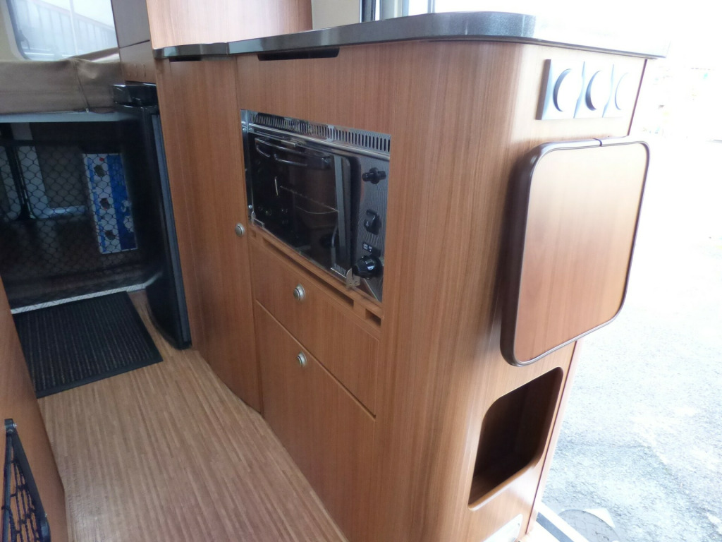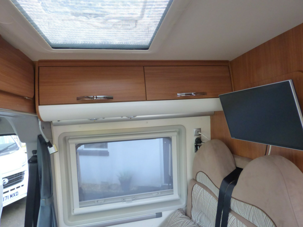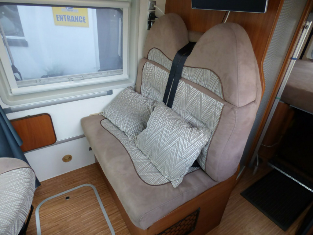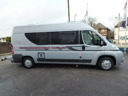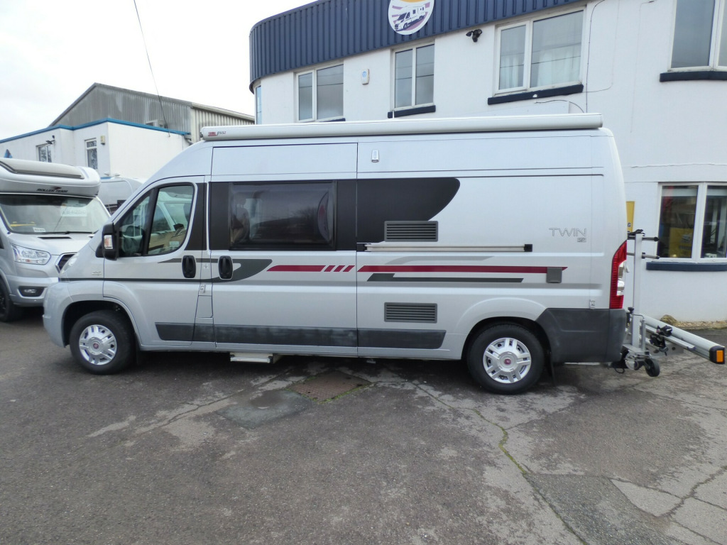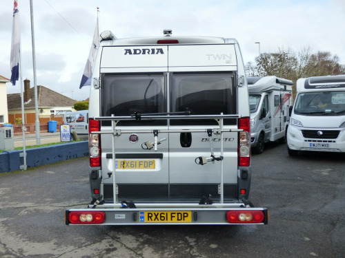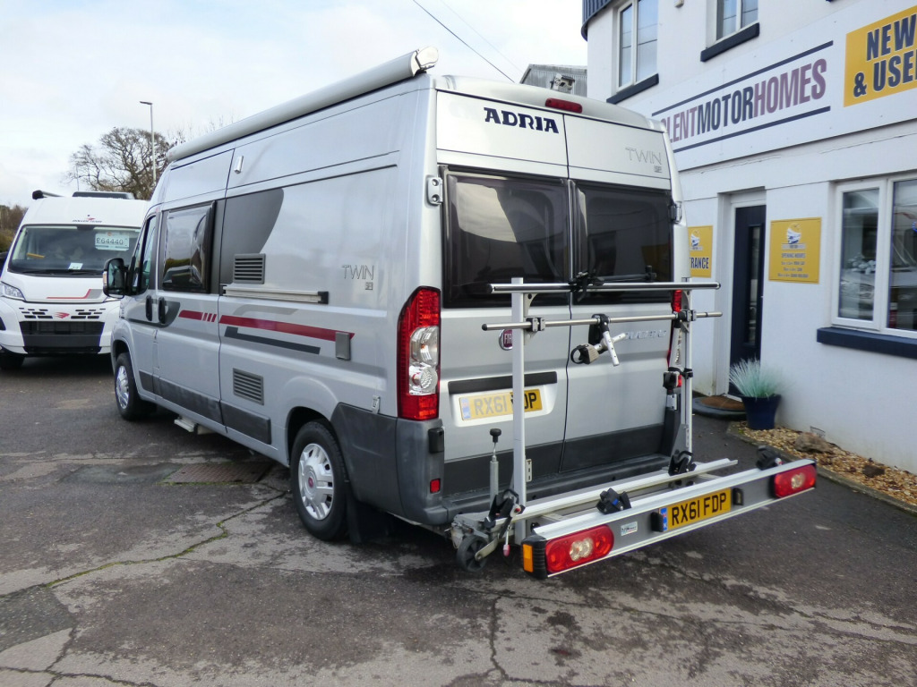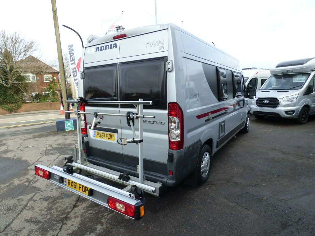 A really lovely one owner Adria Twin, clearly very well cared for throughout it's life. Based on the Fiat Ducato chassis with 2.2l engine and 5 speed manual transmission, the accommodation is laid out with a ,front dinette where the front seats swivel to face the rear two travelling seats, a side kitchen with 2 burner gas hob, gas oven/grill and a Thetford 3 way fridge/freezer. Opposite the kitchen via a tambour door is the wet room style bathroom with shower, wash hand basin and cassette type toilet with SOG extractor. The large double bed at the rear can be folded away to provide a huge storage area. Lots of cupboard and wardrobe space throughout and it is fitted with a Truma combi hot water and heating system. Other features for this Adria Twin SP include: Electric step, Pleated front screen blind, Avtex TV, Vision Plus antenna, solar panel, rear parking sensors and two way reversing camera, Fiamma F65S wind out awning and a substantial Sawico bike carrier for 2 bikes. 2 Berth, 4 seatbelts. L. 5.98m, W. 2.05m, H 2.58m, 3,500kg, 39,679 miles. ke rack, cab a/c, electric step, free 3 year autoguard warranty!, reversing camera, solar panel, tv & antenna, wind out awning, 15'' Steel