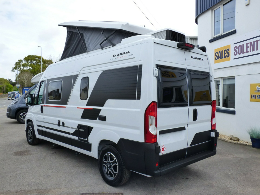 Special Offer - Free Solent Prestige Pack worth £1655 included with this motorhome comprising: Scorpion Defender S5+ Alarm & Tracker, Falcon 22'' Smart TV, WiFi and Soundbar.The stunning new 2025 model Adria Twin Sports 600 SPB is in stock now at Solent. One of the most sought after van conversions on the market, the Twin Sports is a superbly designed and built motorhome at home off the beaten track or travelling on adventures in foreign lands. The thoughtful design means there is a lot of storage space and every inch of the 5.99m is used well. The Twin is Fiat Ducato based featuring the new 2.2l 140bhp engine and 8 speed automatic transmission. Also fitted with the optional Lux pack, it boasts LED headlamps and a full LCD driving display. Behind the swivel seats is a dinette that seats 4 in comfort. A ladder accesses the pop-top roof with a comfortable, large double bed. To the side, the kitchen is fitted with a gas oven/grill, a 2 burner gas hob and a fridge/freezer. Opposite, behind a tambour door is the bathroom with cassette type toilet, wash hand basin and a clever partition for the shower. The bedroom has a large transverse double bed which can be moved out of the way to provide a huge storage area, ideal for transporting bikes. Heating is provided by a diesel heater with hot water by a Truma Combi unit. Other features for this Adria Twin Sports 600 SPB include: Truma Habitation Air Conditioning, Pleated Cab Blinds, Navigation, Carpets, Thule Omnistor wind out awning, Pop-Top roof, Solar Panel, Flyscreen for sliding door, Larger 138l Fridge/freezer, Twin Leisure Batteries and Fiat Lux Pack. L. 5.99m, W. 2.05m, H. 2.60m, 3,500kg. 4 Berth, 4 Seatbelts, Delivery Mileage. loy wheels, automatic transmission, carpets, fiat lux pack, habitation air conditioning, pleated cab blinds, pop top, reversing camera, solar panel, thule awning, free prestige pack worth £1655!, 16'' Alloys