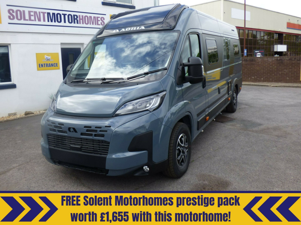 Special Offer - Free Solent Prestige Pack worth £1655 included with this motorhome comprising: Scorpion Defender S5+ Alarm & Tracker, Falcon 22'' Smart TV, WiFi and Soundbar.The stunning new 2025 model Adria Twin Supreme SGX is in stock at Solent now. One of the most sought after van conversions on the market, the Twin Supreme is a superbly designed and built motorhome at home off the beaten track or travelling on adventures in foreign lands. The thoughtful design means there is a lot of storage space and every inch of the 6.36m is used well. The Twin is Fiat Ducato based featuring the new 2.2l 180bhp engine and 8 speed automatic transmission. Also fitted with the optional Lux pack, it boasts LED headlamps and a full LCD driving display. Behind the swivel seats is a dinette that seats 4 in comfort. To the side, the kitchen is fitted with a gas oven/grill, a 2 burner gas hob and a fridge/freezer. Opposite, behind a tambour door is the bathroom with cassette type toilet, wash hand basin and a clever partition for the shower. The bedroom is arranged with large double electrically elevating bed which can be moved out of the way to provide a huge storage area, ideal for transporting bikes. Heating is provided by a diesel heater with hot water by a Truma Combi unit. Other features for this Adria Twin Supreme 640 SLB include: Truma Habitation Air Conditioning, Larger 138l fridge/freezer, Twin Leisure Batteries, Pleated Cab Blinds, Navigation, Carpets, Thule Omnistor wind out awning, Lanzarote Grey Solid Paint, Solar Panel, Flyscreen for sliding door, AddOn Airbed and Fiat Lux Pack. L. 6.36m, W. 2.05m, H. 2.60m, 3,500kg. 2 Berth, 4 Seatbelts, Delivery Mileage. loy wheels, automatic transmission, carpets, electric step, fiat lux pack, habitation air conditioning, larger fridge option, solar panel, thule awning, twin leisure battery option, free prestige pack worth £1655!, 16'' Alloys