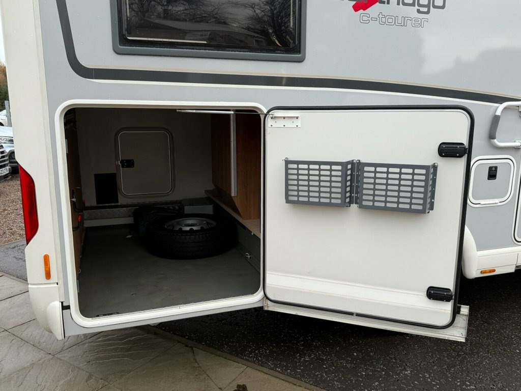 FIAT CARTHAGO C-Tourer T148 LE 2.3 Automatic 2 berth ( END BEDROOM WITH TWO BEDS THAT CAN MAKE LARGE DOUBLE, FRONT L-SHAPED LOUNGE/DINETTE, ADJACENT CENTRAL WASHROOM WITH SHOWER AND TOILET, 4 BELTED SEATS, LARGE END GARAGE, CENTRAL KITCHEN, UPGRADE SELF LEVELLING JACKS, ) Motorhome comes in a Fiat white body and Carthago C-tourer T148 LE grey body decals, Upgrade 16 inch diamond cut and gloss black alloy wheels, Carthago C-tourer T148 LE body kit, Carthago C-tourer T148 LE exterior features, Side door light, Reversing camera, Upgrade garage shower, Roof solar panel, Power inverter, Daytime lights, Electric windows, Electric adjustable wing mirrors, Automatic gearbox, Central locking, LED trip computer speedometer display, 4 spoke steering wheel, Speed limiter, Cruise control, Climate control, Air conditioning, Upgrade Pioneer touch screen media unit, Smartphone compatible satellite navigation, Bluetooth, DAB radio, Aux/usb port, Various APPS, Eye catching Beige cloth Carthago C-tourer T148 LE front swivel captain chairs, Carthago C-tourer T148 LE half white beige cloth interior seats through out, Front L-shaped lounge / dinette, Pop up fixed lounge TV, Dining table, Truma blown air heating and water system, Large waste and fresh water tanks, On board blinds and fly screen, Skylights throughout, Carthago C-tourer T148 LE laminate flooring throughout, Central kitchen with 3 burner gas hob, Dometic microwave and oven combine unit, Large fixed on board fridge and freezer, Upgra