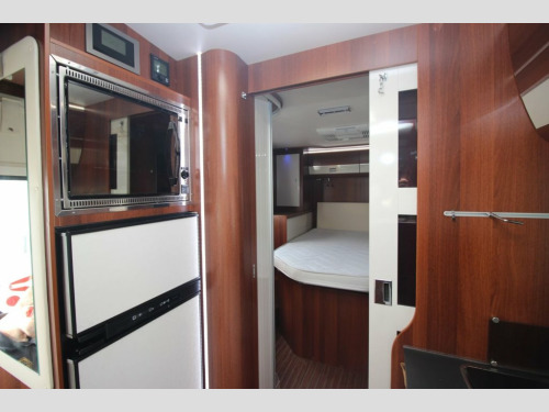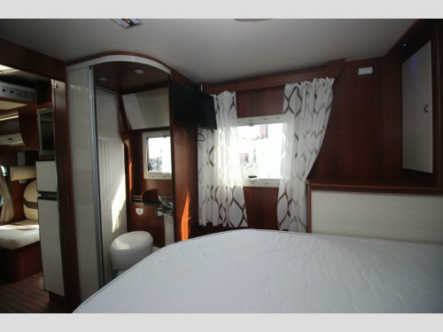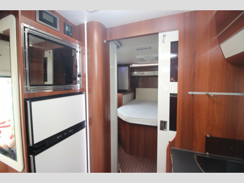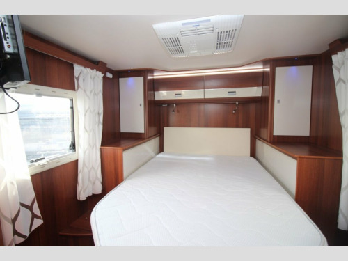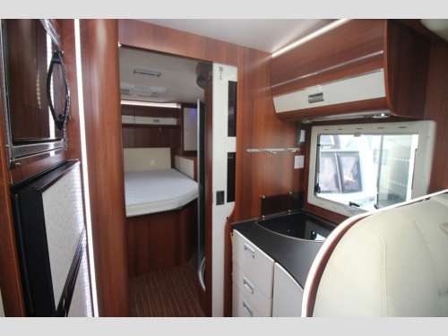 A 5-berth motorhome. Rear fixed island double bed. Front electric drop-down double bed. The front dinette converts to a small bed. Kitchen equipped with 3 burner hob, Dometic grill, fridge freezer, and sink. Separate shower cubicle. Vanity washbasin and Thetford cassette toilet