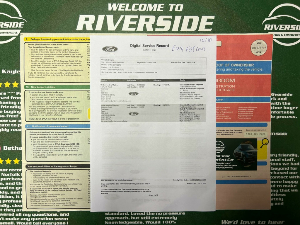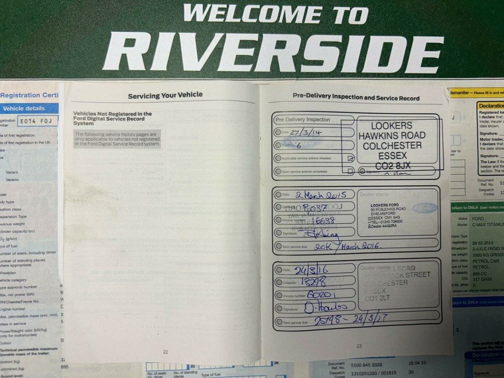 This 2014 Ford C-Max T Titanium presents an exceptional ownership proposition with only two previous owners and a remarkably low mileage of 60,000 miles for its age. This well maintained example is equipped with a responsive 1.0L petrol engine and benefits from a host of desirable features. Inside, you'll find dual zone electronic automatic climate control for personalised comfort, and the convenience of Bluetooth hands-free phone connectivity. The Sony DAB audio system with its branded sound quality ensures an enjoyable listening experience on every journey, while automatic headlights provide added visibility and ease of use.Finished In Metallic Blue This Ford C-Max Titanium Has Unbelievable Service History. Only 1 Former Keeper from new with full Ford main dealer service history, complete with a fully stamped service booklet along with a full digital service record print out, they don't get better than this. With its impressive fuel economy, achieving a highlight of 55 miles per gallon, which indicates it is more economical than many similar vehicles. Furthermore, its low CO2 emissions highlight its environmental consideration. Practicality is also a key strength, boasting a large boot space that offers ample room for shopping, luggage, or equipment, making it a versatile choice for families and individuals alike., v power socket - additional rear, 12v power socket - front, 17in alloy wheels - 15 spoke, 2nd row airvents, 4.2in tft display, abs - anti-lock braking system, aux input socket, air conditioning - dual zone electronic automatic temperature control, airbag - front passenger, airbags - driver, airbags - front and 2nd row curtain, airbags - side impact, alarm - thatcham category 1 with volume sensing and perimeter, anti-roll protection, automatic dimming rear view mirror, automatic rain sensing wipers, bluetooth hands-free phone, brake warning lights - automatic flashing of brake lights under heavy braking, branded integrated control panel, cd storage, centre console - premium with sliding armrest stowage bins and 12v front and rear sockets, centre console - bright finish cup holder surrounds, child observation mirror, courtesy light - footwell illumination, courtesy light - front and rear reading lights, courtesy light - led overhead and load compartment, cruise control with adjustable speed limiter, dds - deflation detection system, door lever - satin chrome finish, drivers seat lumbar support, eba - emergency brake assist, ebd - electronic brakeforce distribution, esp - electronic stability programme, electric windows - front and rear with one touch, electric windows - global opening-closing, emergency assistance, floor mats - front velour with ford logo, ford easy fuel system, ford easy-fuel capless refuelling system, ford power engine start-stop button, ford sync, front fog lights, front seat - passenger manual height fore-aft adjustment, front seat - passengers manual lumbar support adjustment, front suspension - independent with macpherson struts, fuel computer, gearshift knob - leather, headlights - automatic, headlights - courtesy delay, headliner - luxury woven, heated front windscreen, hill start assist, ips - intelligent protection system, led ambient courtesy lighting, locking wheel nuts, outside temperature thermometer, overhead console - map reading lights and sunglasses holder, overhead console - mood lighting, overhead console - a5 stowage, power steering, rear seats - three 2nd row individual fold flat seats with height adjustable head restraints, remote central locking, remote multifunction display controls, scuff plates - front aluminium-finish with ford logo, seats - drivers manual height and fore-aft adjustment, sony dab audio system, sony radio-cd, speakers - x9, speed limiter - adjustable, steering column - rake and reach adjustment, steering wheel - 4 spoke leather trimmed, steering wheel - multifunction, stowage boxes - two underneath rear passengers foot area, traction control - tc, tyre repair kit, usb connection - ipod connectivity, variable dimming of instrument cluster and radio screen display, voice control - audio, z-shape handbrake