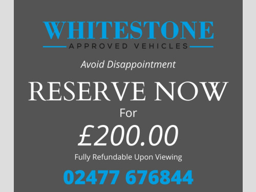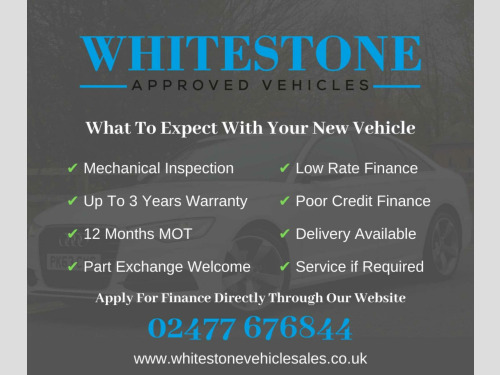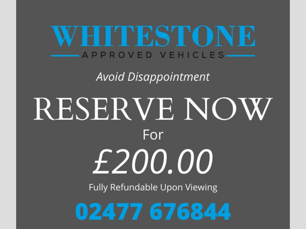 Supplied With 12 Months MOT, A Service if Required and 3 Months Extendable Nationwide Warranty. Free 12 Months Road Side Assistance Available. Extended Warranties Available. ***Established for 15 years, we are an FCA regulated, VAT registered business specialising in purveying highly prepared vehicles to satisfy the most discerning of customers***, VIEWINGS BY APPOINTMENT*** To ensure the vehicle you are enquiring on is available and so we can offer you the attention you require***, Every retail vehicle is supplied with a new MOT, mechanical inspection, full valet, paint correction and a service if required***, For finance applications, please visit WWW.WHITESTONEVEHICLESALES.CO.UK. For a full walk around video, please give us a call and we will be happy to oblige. ....RESERVE THIS VEHICLE WITH A FULLY REFUNDABLE DEPOSIT....ZERO DEPOSIT FINANCE AVAILABLE....2 MINUTE APPLICATION AVAILABLE DIRECTLY THROUGH OUR WEBSITE, REGARDLESS OF YOUR CREDIT HISTORY.... EXTENDED WARRANTIES AVAILABLE.... FULLY MOTORCHECK AND EXPERIAN CLEAR.... BUY WITH CONFIDENCE WITH OUR 5 STAR REVIEWS....VIEWINGS BY APPOINTMENT- PLEASE CALL THE OFFICE ON 02477 676844