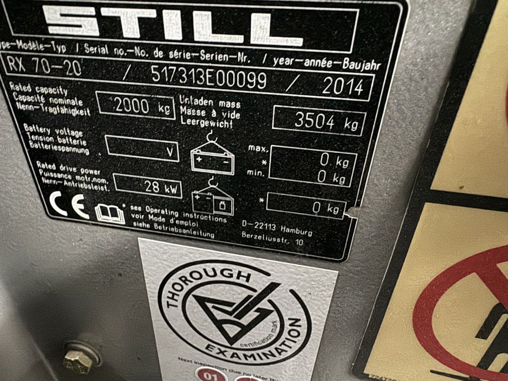 **The Price is Plus V.A.T**, Still Forklift RX 70-20 DIESEL, Low Hours ( Only 1,883 Hours ), One Owner From new,, Regularly Serviced, , Full Cab,, Diesel Hybrid Technology,, More Eco-Friendly, , Front Load Backrest,, Electric Brakes,, Working Lights, , Counterbalanced,, Protective Grill Roof,, Reduced Emissions, , Heated Rear Screen,, Beacon & Bleeper Override,, Drivers Seat Belt, , Front & Rear Wash Wipe,, Rear View Mirror, , Sliding Glass Windows,, Adjustable Drivers Seat, , 2 Ton Lifting Capacity,, Sun Visor, , x 1 Key, Adjustable Hydraulic Fork Width,, Well Maintained & a Clean Example, Ready to go to work. , Call David on 07767 404900