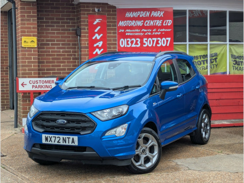 24 Month PARTS & LABOUR WARRANTY. Hampden Park Motoring Centre is pleased to be offering this ULEZ compliant 2022 Ford Ecosport 1.0 EcoBoost 125 ST-Line 5dr hatchback for sale, with ONLY ONE OWNER FROM NEW and 44,100 miles. This car comes with FULL-SERVICE HISTORY. The car will leave with an interim service, new MOT and a PDI. Finished in metallic Desert Island Blue with charcoal alcantara sports trim which adds a touch of sophistication. **WHY BUY FROM US****Established In 1980****24 Month Warranty On All Cars Over £4500, & Those Not Covered By A Manufactures Warranty** ** All Our Cars Are Hpi Clear So You Can Buy With Confidence****Competitive Finance Rates Subject To Status****Multi Branches****Open 7 Days a Week Inc Bank Holidays****Monday - Friday - 8.30am to 6pm****Saturday - 9.00am to 5pm****Sunday - 10am to 4pm****Bank holidays 10am to 4pm**For more pictures and a walk around video please go to https://www.hailshammotoringcentre.co.uk/Please call to arrange viewing and a test drive on 01323 507307.Here at Hampden Park Motoring Centre, we have up to 50 cars on show, also at our Hailsham branch we have up to 50 further cars available for viewing, please call 01323 449900 for more info.For more information on our Ecosport please see the benefits below as stated, uise control, e-call (emergency call), easy fuel capless refuelling system, ford sync 3 nav system with dab radio,8'' screen, emergency assistance,apple car play/android auto, 2x usb, 6 speakers, ford pass connect, intelligent speed limiter, pas, rear parking sensors, rear view camera, traffic sign recognition, trip computer, sports suspension, steering wheel mounted audio controls, auto dimming rear view mirror, automatic front wipers, automatic headlights, black roof rails, body colour door handles, body coloured bumpers, chrome lower window surround, electrically adjustable and heated door mirrors, front fog lights, front grille bars and surround in black, headlight levelling control, large rear roof spoiler, led day running lights, led third brake light, power front and rear windows, puddle lights, quick-clear heated windscreen, rear side wing doors, rear wiper, st line body styling kit - black headlamp bezel, front and rear sport bumpers, body colour lower door claddings, 12v socket in front and rear, 3 seat bench in 2nd row, 60/40 split rear seats, ambient lighting, centre console with sliding front armrest, cooled glovebox, courtesy lights with map reading light, driver seat height/lumbar adjust, driver's side glovebox, driver/passenger sunvisors and lidded vanity mirrors, eatc - electronic auto temperature control, folding grab handles, front head restraints, front seat back map pockets, illuminated glovebox, illuminated luggage compartment, isofix system on outer rear seats, luggage compartment carpet, neosuede/partial sensico leather upholstery, overhead console with sunglasses holder, rake adjustable rear seats, reach + rake adjustable steering column, rear headrests, sensico trimmed steering wheel, handbrake and gearshift gaiter with red stitching, single front passenger seat, st-line front floor mats with red stitching, stainless steel sports pedals, storage drawers under front seats, tie down hooks, variable boot floor, 3x3 point rear seatbelts, abs, autonomous emergency braking, child locks on rear doors, curtain airbags, driver airbag, drivers knee airbag, electronic stability programme with hill launch assist, front passenger airbag deactivation, front side airbags, passenger airbag, pre collision assist system with aeb, seatbelt reminder for driver and front passenger, traction control, tyre pressure monitoring system, immobiliser, mykey system, remote central locking, thatcham 1 volume sensing alarm, low rolling resistance tyres, tyre inflation kit, 24 months warranty free, 17'' Alloys