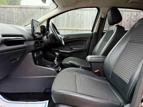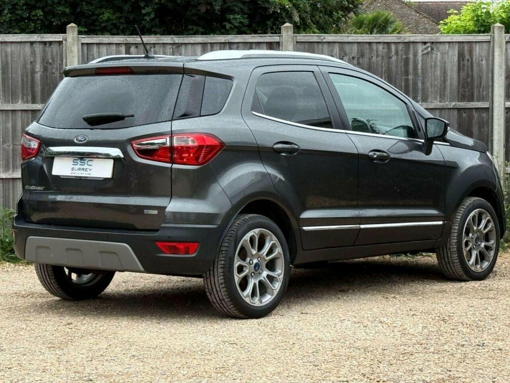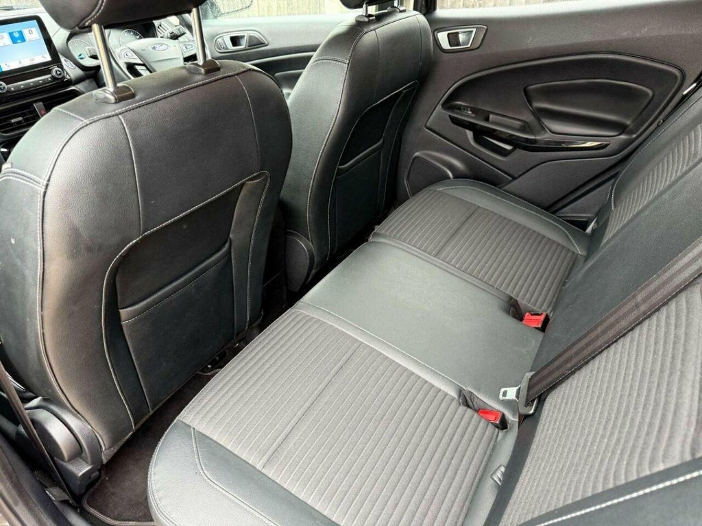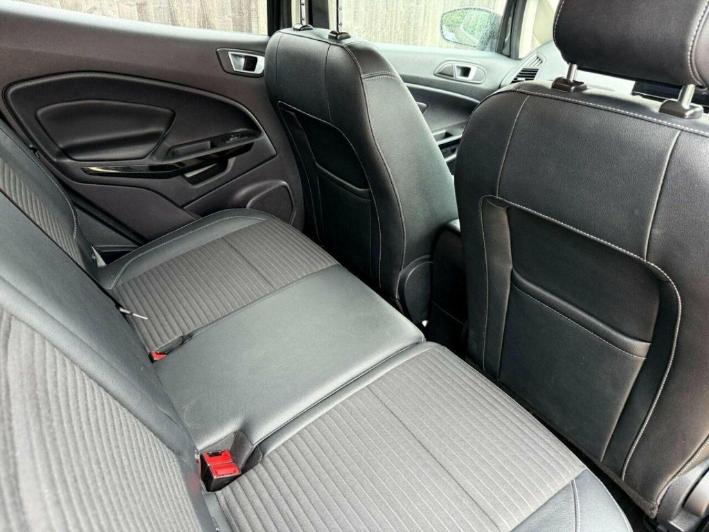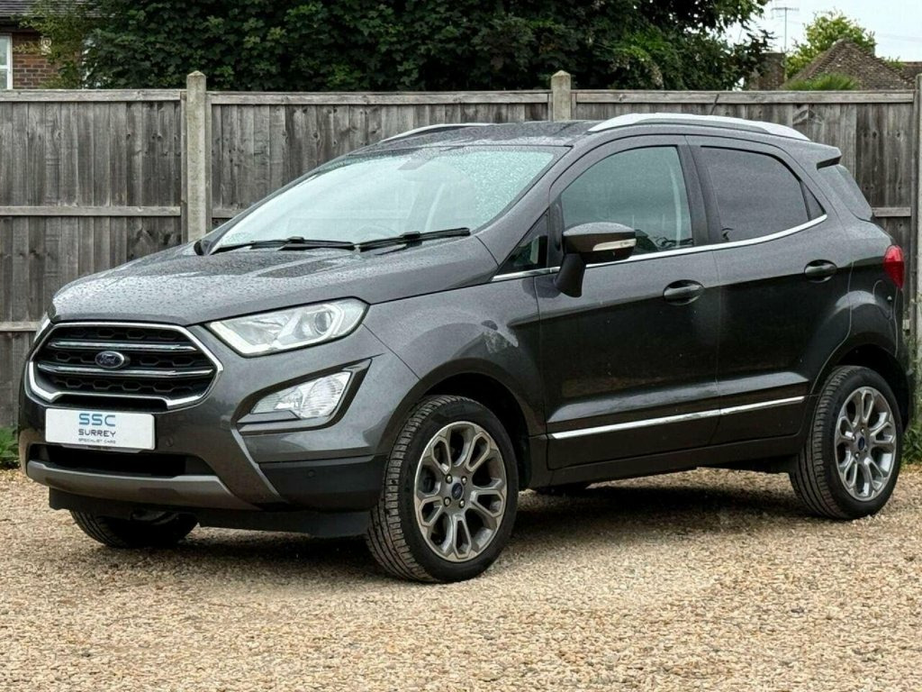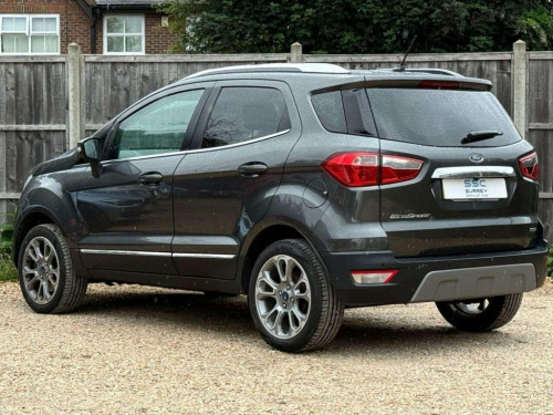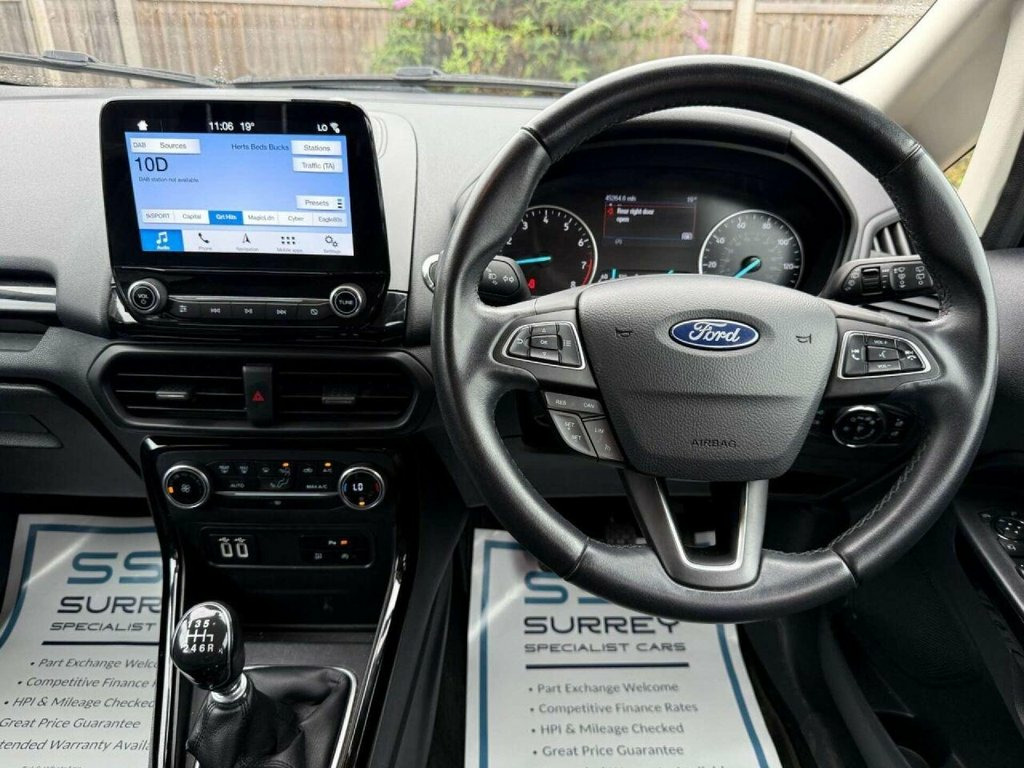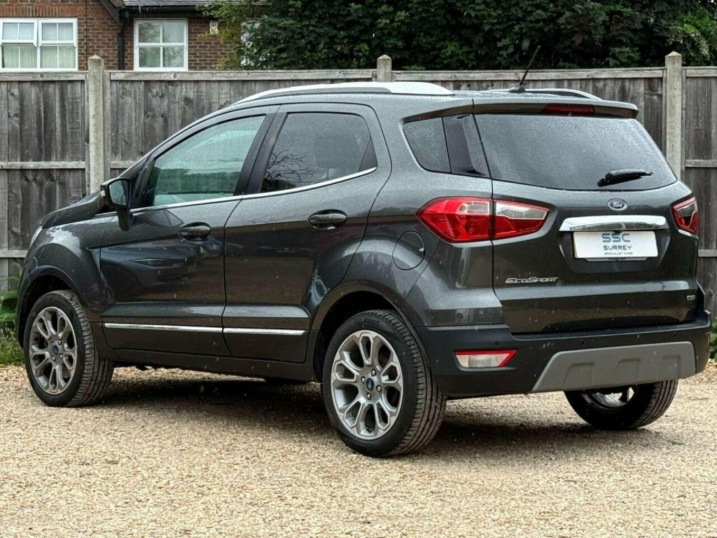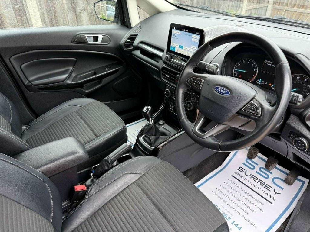 Surrey Specialist Cars are proud to present our lovely Ford Ecosport Titanium. This amazing car comes with Service History, finished in stunning metallic grey with leather seats. The car will come with a fresh MOT so it will be ready to go. The 1L Petrol engine offers superb economy at over 53 MPG on combined cycle. Features Include Multifunction Steering Wheel, Trip Computer, Satellite Navigation, Parking Camera, Heated Windscreen, Cruise Control, Stereo/Phone Control, Bluetooth Audio, AUX Input, USB Input, FM Radio, CD Player, Climate Control, 12V Charging Socket, 6 Speed Manual Gearbox, Electric Windows, Fog Lights, 17 Inch Alloy Wheels and two Remote Control Keys to name a few. We are open 7 days a week, and prepare all of our cars to the highest standards. We have a Click & Collect option available, and can also arrange delivery on request. All cars are HPI clear and a full history report is provided with every car. We welcome any inspection and viewing is highly recommended. All cars are available with our AA warranty starting from just ?150 for 3 months. Debit and credit card facilities are available and we offer competitive finance packages. If you have any questions or would like to view any of our cars give us a call or drop us a message on whatsapp 01483 363 144 to arrange an appointment with one of our team. We also offer full bespoke walkaround videos on request. We are always on the lookout for high quality stock, if you have a car we are interested in we guar 17in Alloy Wheels - 10 Spoke Flash Grey , Adjustable Boot Load Floor, Airbags - Curtain, Airbags - Driver and Front Passenger, Airbags - Drivers Knee, Airbags - Front Passenger De-Activation , Alarm - Thatcham Category 1 with Volume , Ambient Lighting - Instrument Panel and , Analogue Instrument Cluster, Anti-Lock Braking System - ABS with Elec, Automatic Dimming Rear View Mirror, Automatic Headlights, Centre Console Cup Holder with Chrome Ac, Centre Console with Sliding Armrest, Child Locks, Chrome Headlight Bezel, Courtesy Light - Front with Two Map Ligh, Courtesy Light - Rear, Cruise Control, Door Frame Beltline - Chrome, Door Handles - Body Colour, Door Mirrors - Power-Foldable Heated wi