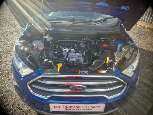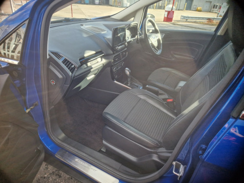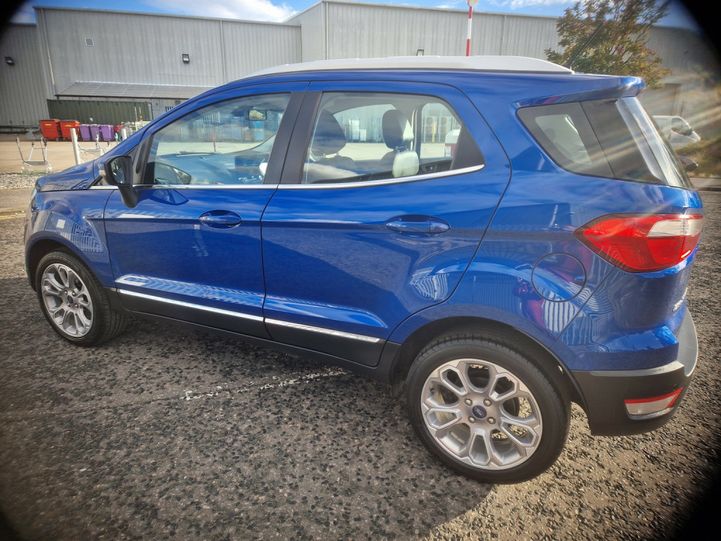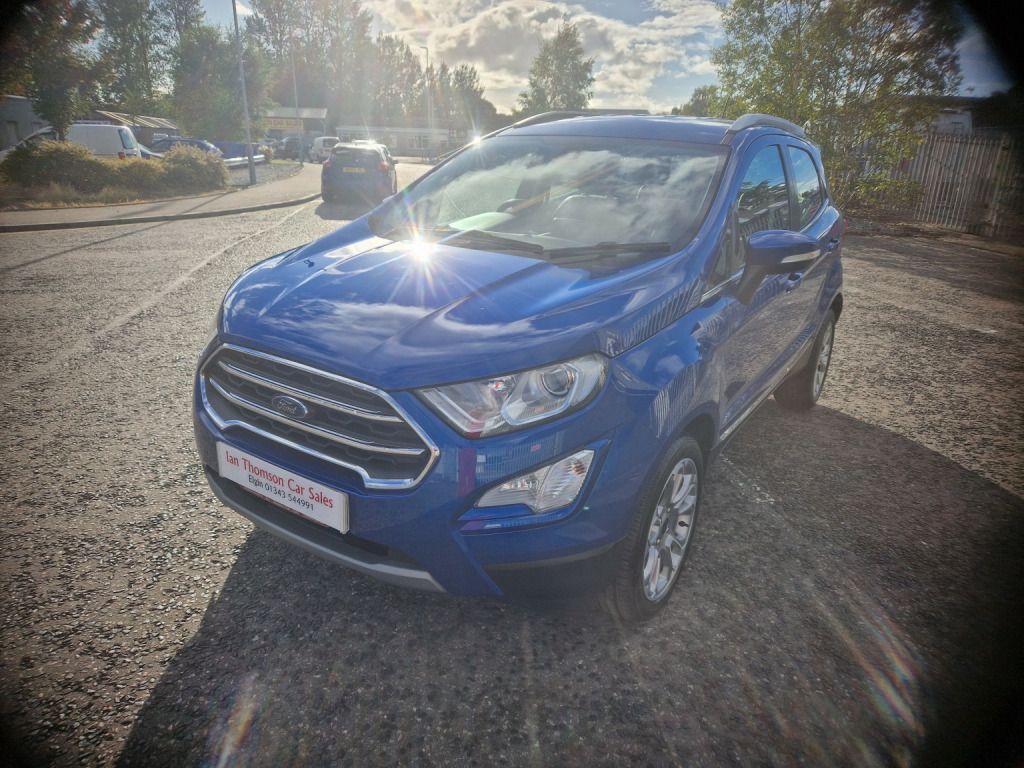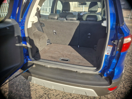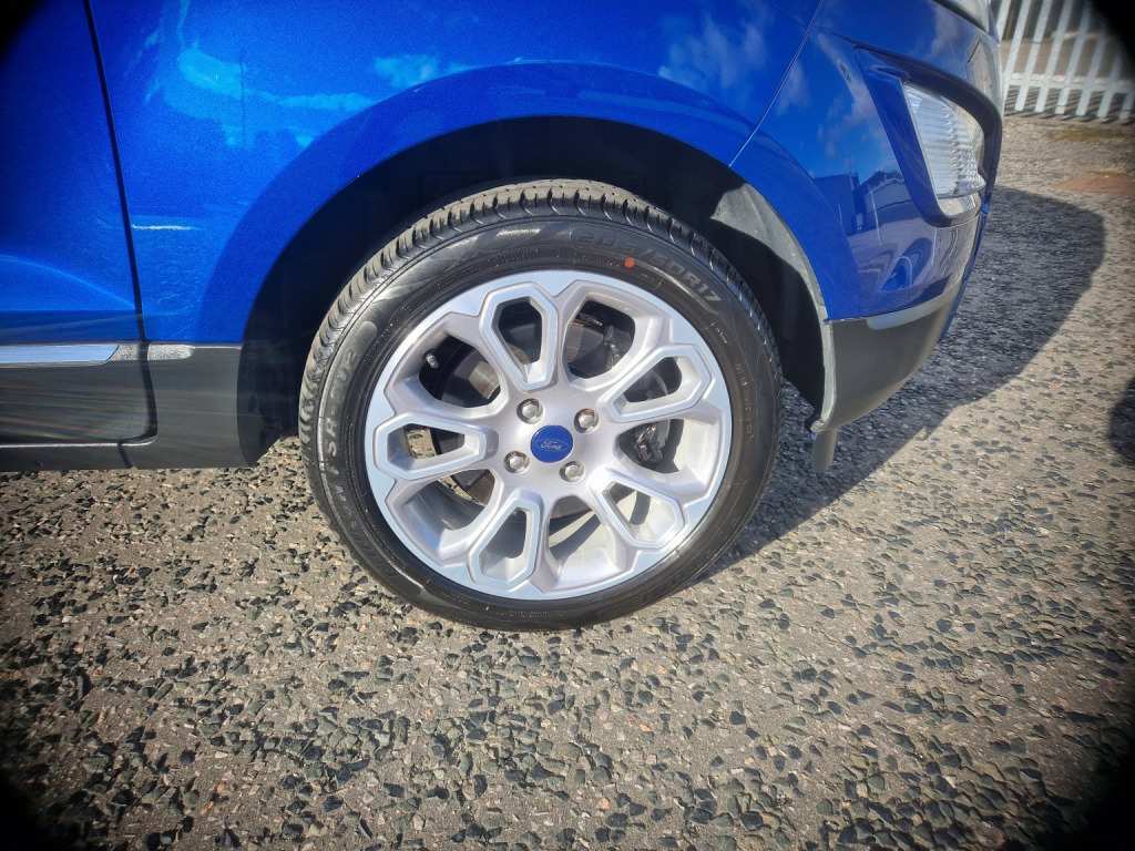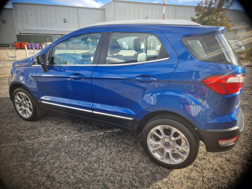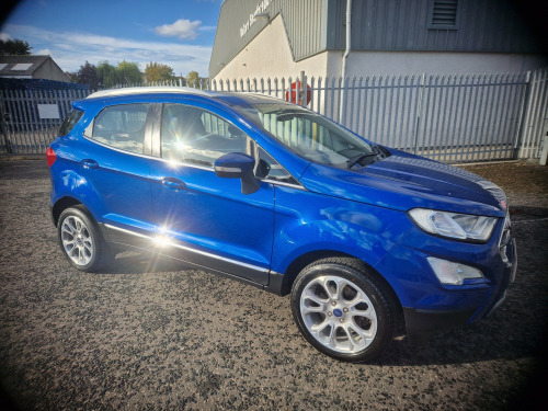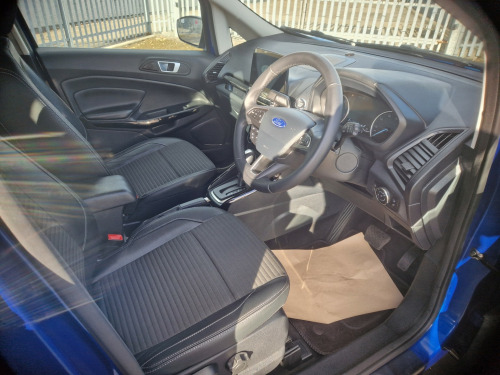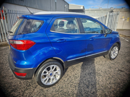 FORD ECOSPORT TITANIUM AUTOMATIC FINISHED IN BLUEJEANS METALLIC PAINT WORK WITH BLACK HALF LEATHER INTERIOR FULL CLIMATE CONTROL FACTORY FIT OVER MATS RADIO MULTIMEDIA SYSTEM WITH REVERSE CAMERA ALSO REAR PARKING SENSORS 17 ALLOYS ELECTRIC MIRRORS REMOTE CENTRAL LOCKING WITH TWO KEYS CRUISE CONTROL ON BOARD SATELLITE NAVIGATION VERY LOW MILEAGE AUTOMATIC ECOSPORT PREVIOUS LADY OWNER JUST FULLY SERVICED A SCARCE ONE