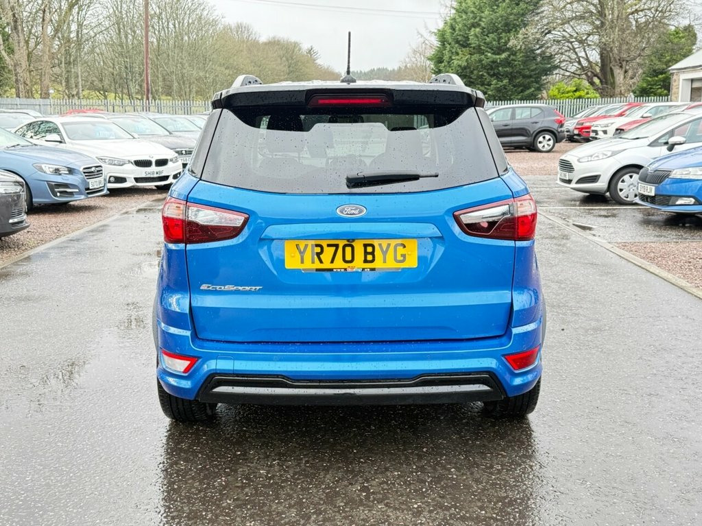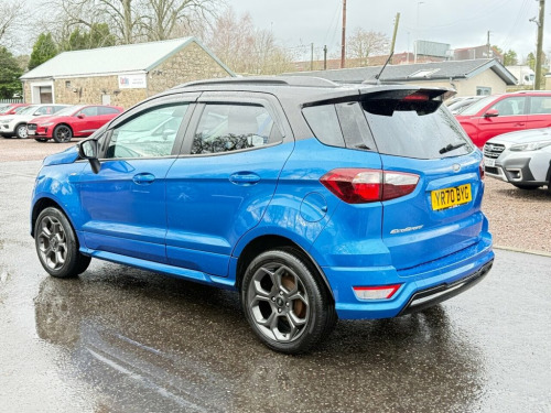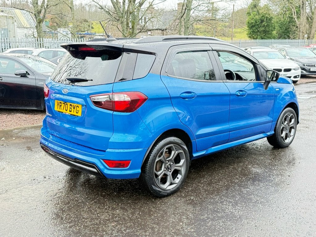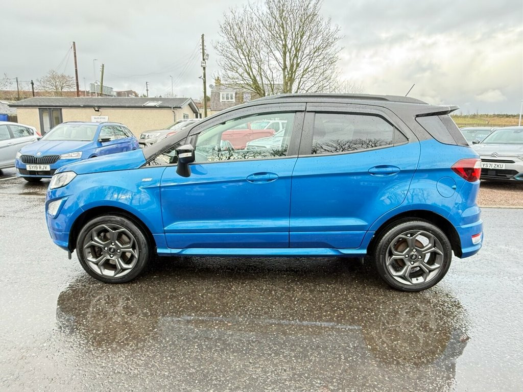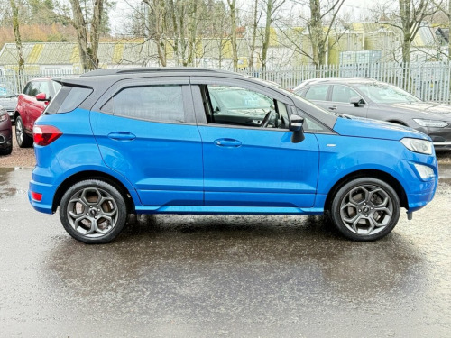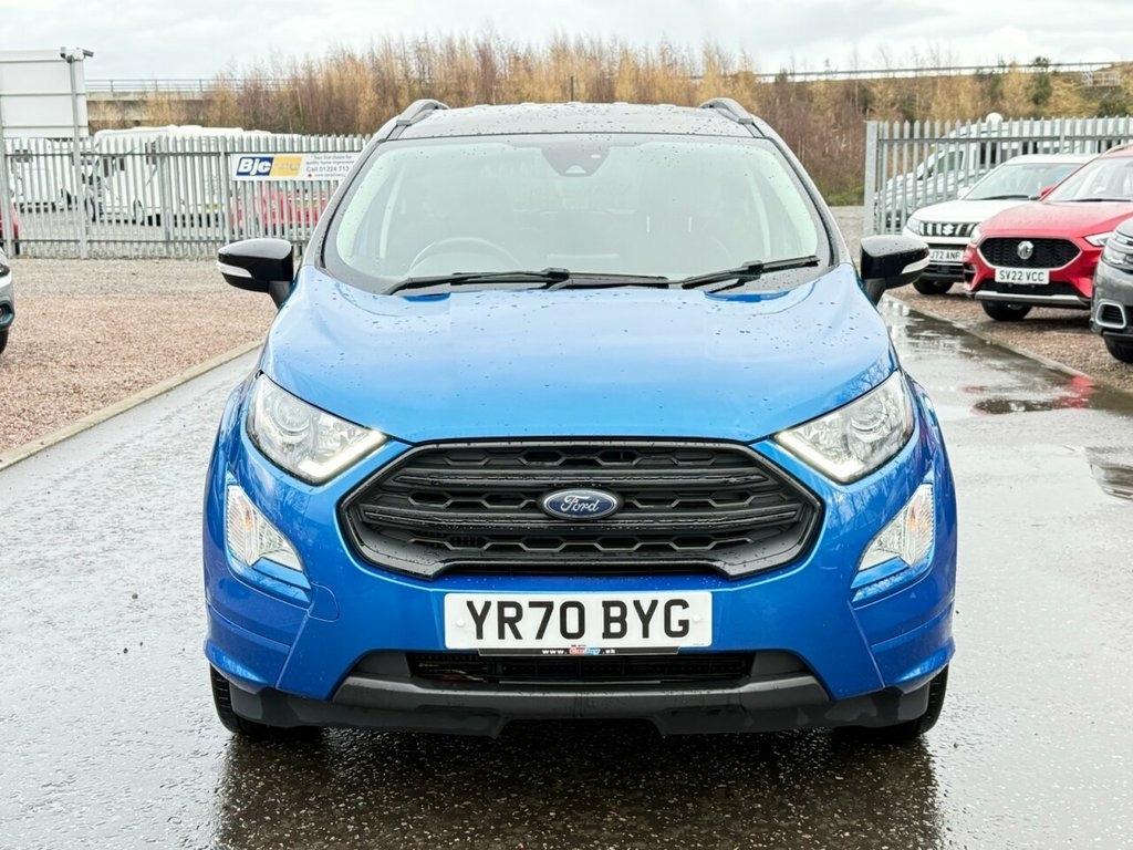 The 2020 Ford EcoSport 1.0T EcoBoost ST-Line is a compact SUV that blends sporty styling with efficient performance and everyday practicality. Powered by a 1.0-litre EcoBoost petrol engine producing 125 bhp, paired with a manual gearbox, it delivers lively acceleration, good fuel economy and a responsive driving experience that suits both town and motorway driving. Finished in the sporty ST-Line specification, this EcoSport stands out with enhanced exterior styling and a more dynamic look, while the interior offers a comfortable and driver-focused layout with a modern feel. The raised driving position provides good visibility, and the cabin is designed to be easy and intuitive to use. Compact dimensions make the EcoSport simple to manoeuvre and park, yet it still offers practical seating and a useful boot for everyday needs. Its balance of efficiency, comfort and sporty character makes it an appealing choice for a wide range of drivers. A smart, economical and stylish compact SUV that's easy to live with and enjoyable to drive. Upgrade B&O speakers , Partial Sensico - Neosuede - Ebony with , Desert Island Blue, Painted Contrast Roof and Mirrors - Agat, Winter Pack, 17in Alloy Wheels - 5 Spoke Dark Tarnish, Adjustable Boot Load Floor, Air Conditioning - Electronic Automatic , Airbags - Curtain, Airbags - Driver and Front Passenger, Airbags - Drivers Knee, Airbags - Front Passenger De-Activation , Alarm - Thatcham Category 1 with Volume , Ambient Lighting - Instrument Panel and , Analogue Instrument Cluster, Anti-Lock Braking System - ABS with Elec, Auto-Dimming Electrochromic Rear-View Mi, Automatic Headlights, Black Headlight Bezel, Black Roof Rails, Centre Console - Sliding Armrest, Centre Console Cup Holder w
