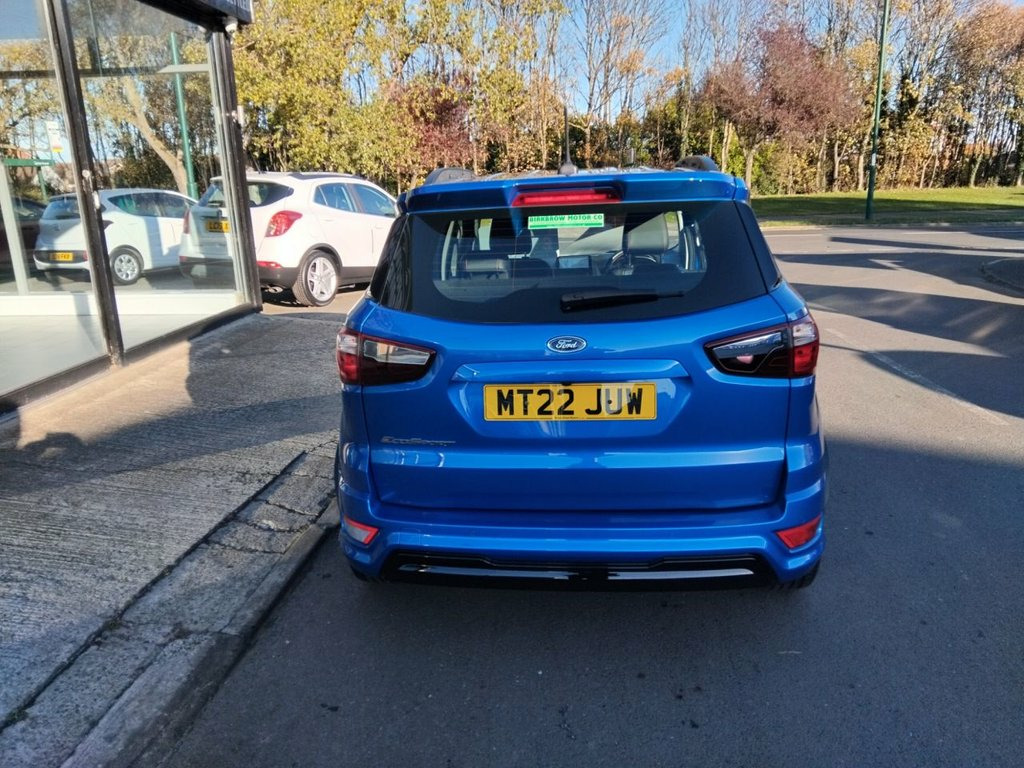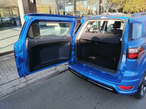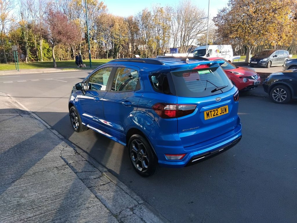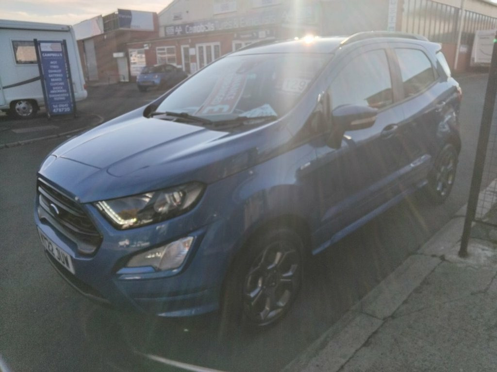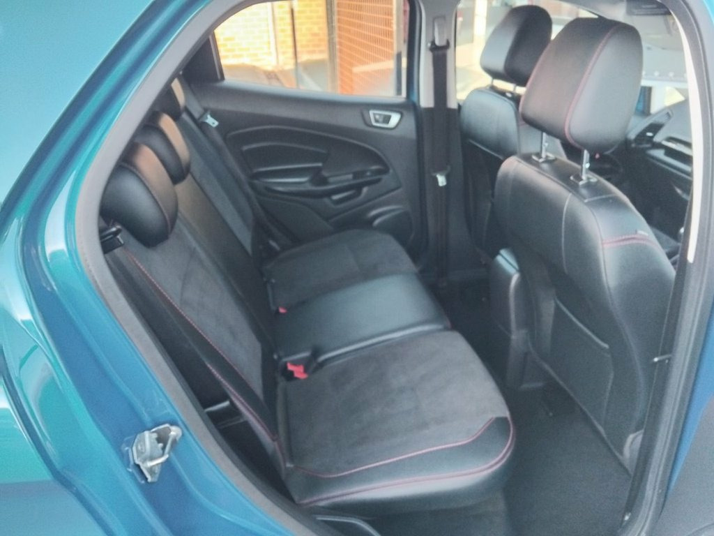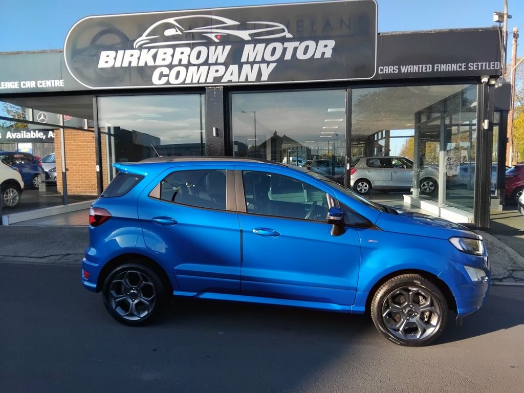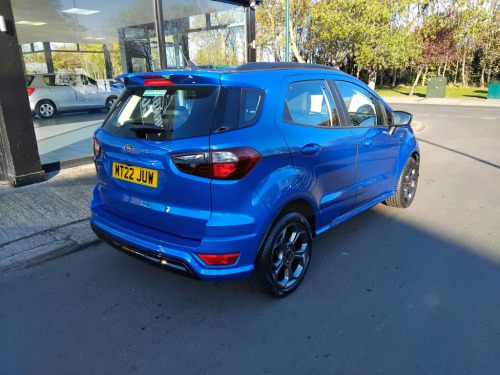 AVAILABLE AT OUR MARSKE SITE, THE SHOWROOM, 105 REDCAR ROAD, MARSKE TS11 6HU BIRKBROW MOTOR COMPANY AT MARSKE IS DELIGHTED TO OFFER THIS BEAUTIFULLY PRESENTED 2022/22 PLATE FORD ECOSPORT 1.0T ECOBOOST ST-LINE 5 DOOR SUV IN DESERT ISLAND BLUE METALLIC, ONE OWNER FROM NEW AND ONLY 14,375 MILES COVERED, SPEC INCLUDES 17" ALLOY WHEELS, FRONT FOG LIGHTS, LED DAYTIME RUNNING LIGHTS AND LOW BEAM HEADLIGHTS, AUTOMATIC HEADLIGHTS AND FRONT WIPERS, FRONT AND REAR ELECTRIC WINDOWS, ELECTRIC DOOR MIRRORS, REMOTE CENTRAL LOCKING WITH KEYLESS ENTRY AND START, AIR CONDITIONING, 8" TOUCHSCREEN DAB DIGITAL RADIO WITH BLUETOOTH, APPLE CARPLAY AND ANDROID AUTO, SATELLITE NAVIGATION, REVERSING CAMERA, CRUISE CONTROL WITH SPEED LIMITER, REVERSE PARKING SENSORS, QUICKCLEAR WINDSCREEN, PART LEATHER AND SUEDE SPORTS INTERIOR TRIM WITH RED STITCHING, FRONT CENTRE ARMREST, 6 SPEED GEARBOX, ROOF RAILS, EXCELLENT MPG, HIGHER SEATING POSITION FOR EASY ACCESS, SPACIOUS BOOT, IDEAL FAMILY HATCHBACK, STUNNING LOOKING CAR, FINANCE ARRANGED Emergency Assistance, Ford SYNC 3 Navigation with 8in Touchscr, Front and Rear Power Points - 12V, 17in Alloy Wheels - 5 Spoke Dark Tarnish, Black Roof Rails, Door Handles - Body Colour, Door Mirrors - Body Colour Housing, Door Mirrors - Electrically Operated and, Electric Windows - Front, Electric Windows - Rear, Front and Rear Bumper - Body Colour with, Front Fog Lights and Turn Indication Lig, Front Grille Bars and Surround - Ebony B, Large Rear Spoiler, Lower Body Side - Door Claddings - Body , Quickclear Heated Front Windscreen, Rocker Panel and Side Cladding - Body Co, Roof - Body Colour, ST-Line Bodystyling Kit, ST-Line Front Grille, ST-Line Styled Rear Lights, Tyre Repair Kit, Adjust