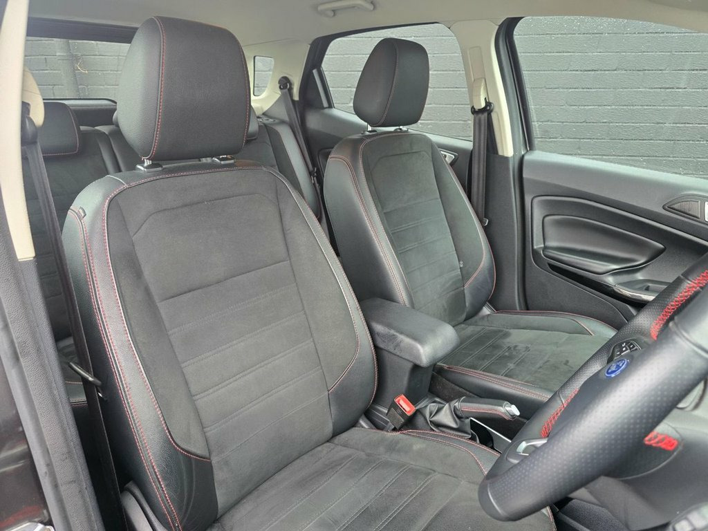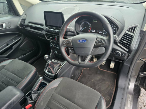 2019 Ford EcoSport 1.0T EcoBoost GPF ST-Line SUV 5dr Petrol Manual Euro 6 (s/s) (125 ps) Discover the perfect blend of sporty design, practicality, and efficiency with this outstanding 2019 Ford EcoSport ST-Line. Powered by Ford's award-winning 1.0-litre EcoBoost petrol engine, this SUV delivers an impressive 125 PS while maintaining exceptional fuel economy and low emissions compliant with Euro 6 standards. The ST-Line trim enhances the EcoSport's dynamic appeal, featuring striking 17-inch alloy wheels, a sports body styling kit that create a bold, confident road presence. Inside, the cabin combines comfort and sophistication with red-stitched sports seats, leather-trimmed steering wheel, and carbon-fibre-effect detailing, ensuring every journey feels premium. Enjoy a wealth of modern technology including SYNC 3 infotainment with an 8-inch touchscreen, Apple CarPlay and Android Auto compatibility, Bluetooth connectivity, and satellite navigation. Practicality is equally impressive, with a versatile 5-door layout, height-adjustable boot floor, and split-folding rear seats for flexible storage solutions. Safety is a top priority, featuring rear parking sensors, cruise control with speed limiter, lane-keeping assist, and multiple airbags for total peace of mind. With its engaging manual transmission, sporty handling, and compact yet commanding design, the 2019 Ford EcoSport ST-Line is the ideal SUV for those who value efficiency, comfort, and style in equal measu 17in Alloy Wheels - 5 Spoke Dark Tarnish, Adjustable Boot Load Floor, Air Conditioning - Electronic Automatic , Airbags - Curtain, Airbags - Driver and Front Passenger, Airbags - Drivers Knee, Airbags - Front Passenger De-Activation , Alarm - Thatcham Category 1 with Volume , Ambient Lighting - Instrument Panel and , Analogue Instrument Cluster, Anti-Lock Braking System - ABS with Elec, Auto-Dimming Electrochromic Rear-View Mi, Automatic Headlights, Autonomous Emergency Braking, Black Headlight Bezel, Black Roof Rails, Centre Console Cup Holder with Chrome Ac, Centre Console with Covered Bin and Slid, Child Locks, Courtesy Light - Front with Two Map Ligh, Courtesy Light - Rear, Cruise Contro