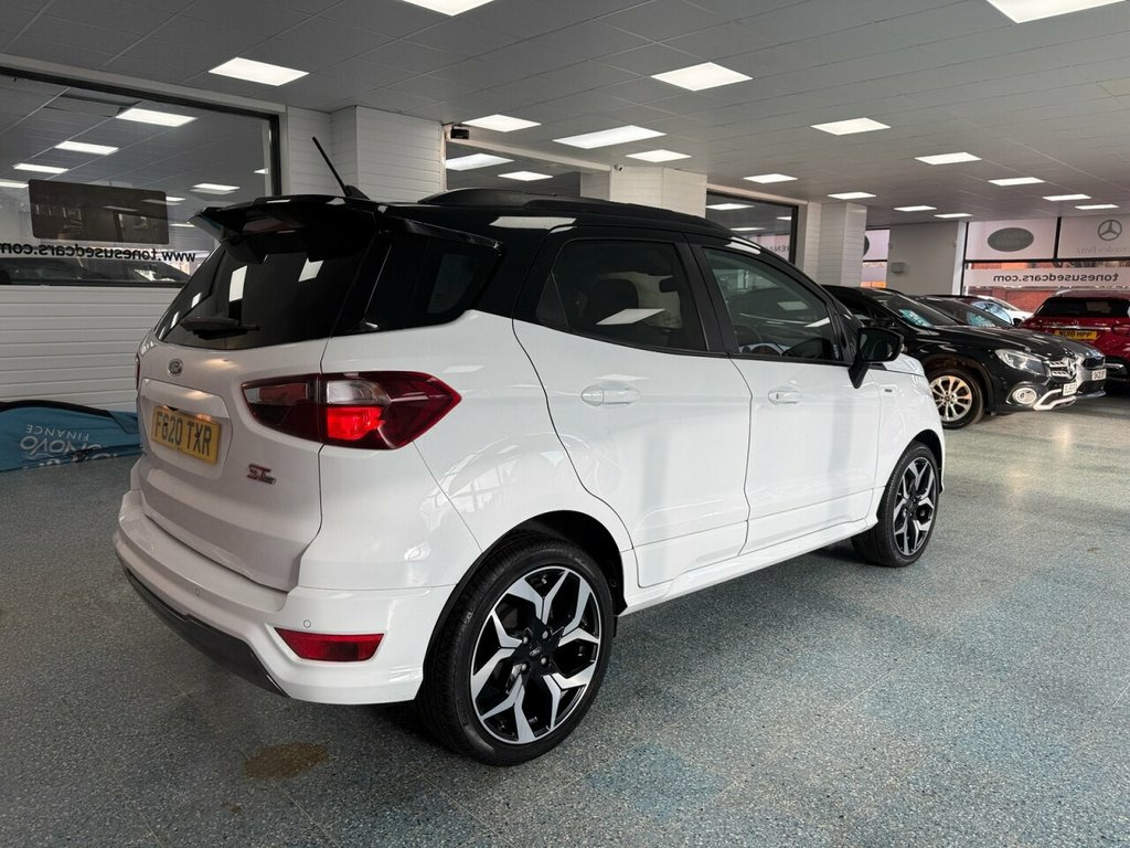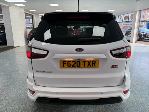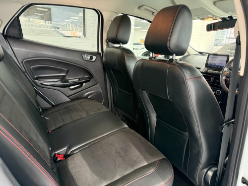 This 2020 Ford EcoSport ST Line boasts exceptionally low mileage for its age, having covered just 30,323 miles. This particular model is the T ST Line variant, powered by an efficient 1.0 litre petrol engine and meeting Euro 6 emissions standards. Its low mileage suggests it has been well cared for and offers a great opportunity for a discerning buyer. The EcoSport ST Line is designed to offer a compelling blend of style and practicality. With an impressive fuel economy of 46 miles per gallon, it represents a cost effective choice for everyday driving. This combination of a strong fuel efficiency rating and minimal mileage makes this Ford EcoSport a standout option compared to other vehicles in its class. Frozen White, 17in Alloy Wheels - 5 Spoke Dark Tarnish, Adjustable Boot Load Floor, Air Conditioning - Electronic Automatic , Airbags - Curtain, Airbags - Driver and Front Passenger, Airbags - Drivers Knee, Airbags - Front Passenger De-Activation , Alarm - Thatcham Category 1 with Volume , Ambient Lighting - Instrument Panel and , Analogue Instrument Cluster, Anti-Lock Braking System - ABS with Elec, Auto-Dimming Electrochromic Rear-View Mi, Automatic Headlights, Black Headlight Bezel, Black Roof Rails, Centre Console Cup Holder with Chrome Ac, Centre Console with Covered Bin and Slid, Child Locks, Courtesy Light - Front with Two Map Ligh, Courtesy Light - Rear, Cruise Control, Door Frame Be
