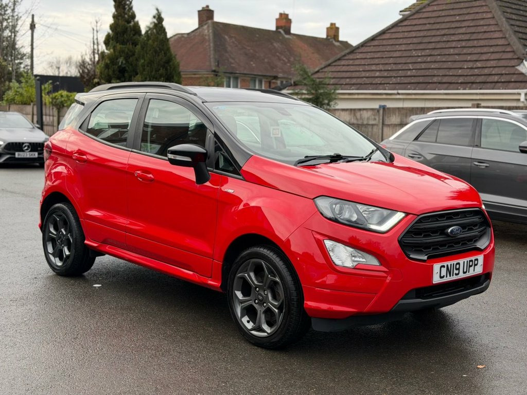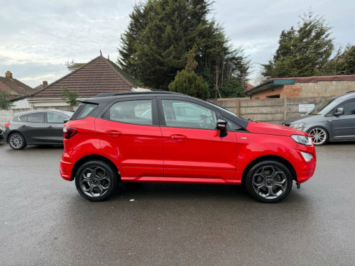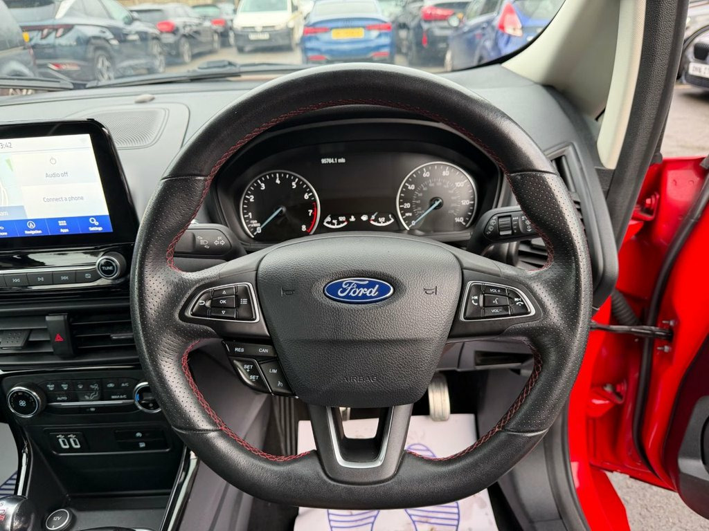 Here we have a Ford EcoSport ST-Line 1.0 Petrol finished in Metallic Red having only done 95k miles from new with a recent service, also comes with a long MOT until December 2026 with no advisories. The interior and exterior of the car have been looked after very well, it starts and drives perfectly with no issues at all. Being the ST-Line top of the range spec, this vehicle benefits from Navigation, Apple Car Play, ST-Line Body Kit, Rear Camera, Cruise Control, Reverse Parking Sensors, Bluetooth phone connectivity, Heated seats, Leather Seats, Upgraded Alloy Wheels, USB-C and aux capability too. Fully HPI clear. The car will be sold with extendable Warranty. We also offer Part Exchange / Delivery / Finance, HPI report available on request. Please call us on 07900066267 for further enquiries. =============================================================================== Why not read our Auto Trader reviews to see what our customers think about their experience here and why they choose to buy from us? =============================================================================== Please contact our sales department for the latest finance offers on this vehicle. We have a dedicated team researching our used car prices daily to make sure we offer the best value cars in the market, =============================================================================== To arrange a personal viewing of this amazing car, or if you would like a tailored video to be emailed to you 17in Alloy Wheels - 5 Spoke Dark Tarnish, Adjustable Boot Load Floor, Air Conditioning - Electronic Automatic , Airbags - Curtain, Airbags - Driver and Front Passenger, Airbags - Drivers Knee, Airbags - Front Passenger De-Activation , Alarm - Thatcham Category 1 with Volume , Ambient Lighting - Instrument Panel and , Analogue Instrument Cluster, Anti-Lock Braking System - ABS with Elec, Auto-Dimming Electrochromic Rear-View Mi, Automatic Headlights, Black Headlight Bezel, Black Roof Rails, Centre Console Cup Holder with Chrome Ac, Centre Console with Covered Bin and Slid, Child Locks, Courtesy Light - Front with Two Map Ligh, Courtesy Light - Rear, Cruise Control, Door Frame Beltline - Black