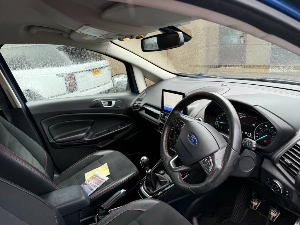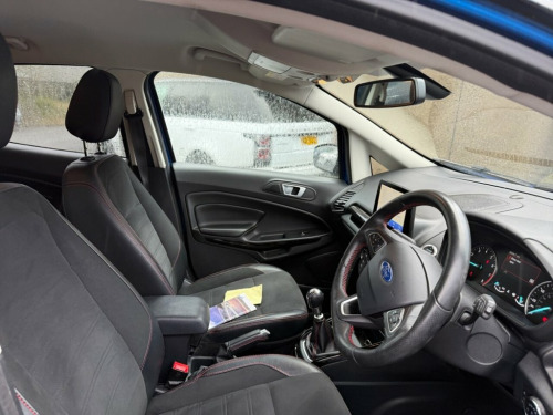 Here we have a Stunning Ford Ecosport ST-Line, The car has done only 59,099 Miles from new with a full service history showing 5 stamps and has had only 2 owners , The car comes supplied with a fresh Service and Mot, 2 keys and Ford book pack. The car also comes with a warranty included, This can be extended upto 3 years please ask us for more details and we will be happy to discuss . We can also offer G-Techniq Crystal ceramic coating for £399 please let us know if you would like this applied on your car. 17in Alloy Wheels , Air Conditioning - Electronic Automatic , Ambient Lighting - Instrument Panel and , Automatic Headlights, Cruise Control, Desert Island Blue, Ford SYNC 3 Navigation with 8in Touchscr, Rear View Camera Pack, ST-Line Bodystyling Kit, ST-Line Front Grille