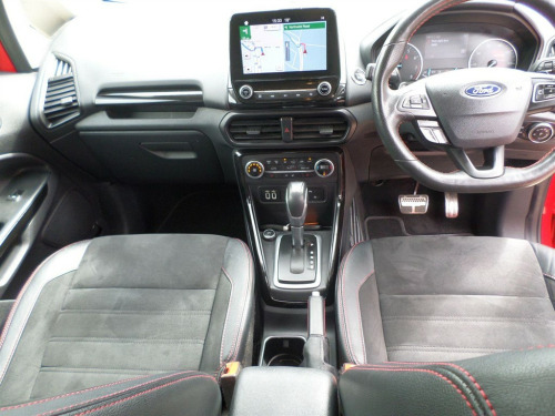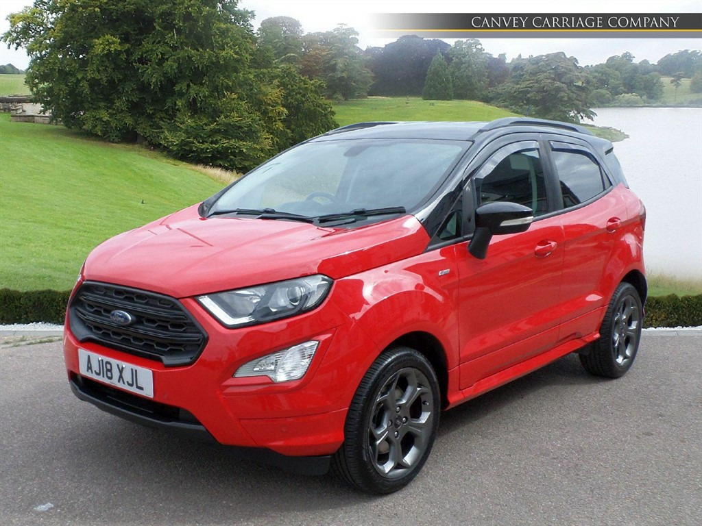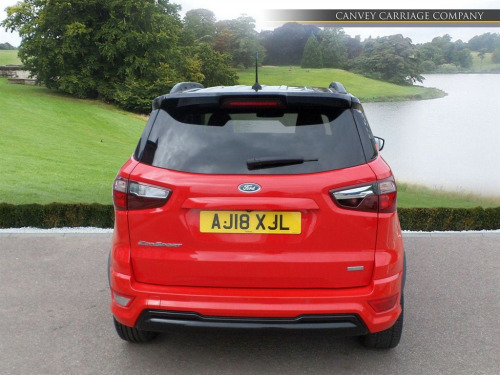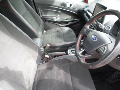 This 2018 Ford EcoSport is a stylish and practical choice. As a ST-Line trim, this EcoSport boasts sporty ST-Line bumpers and side skirts, setting it apart from the standard model. Equipped with a 1.0L petrol engine and meeting Euro 6 emission standards, this EcoSport T ST-Line offers a blend of performance and environmental consciousness. The interior features Electronic Automatic Temperature Control (EATC), ensuring a comfortable climate, and a centre console with a sliding armrest for added convenience. Stay connected and entertained with the Ford DAB Navigation System with Ford SYNC3, offering Android Auto, Apple CarPlay, and Bluetooth connectivity. The Ford EcoSport stands out with its impressive fuel economy of 46 mpg, meaning fewer trips to the petrol station. The inclusion of a rear view camera with rear parking sensors, complete with parking assistance, makes maneuvering in tight spots a breeze. This feature enhances safety and convenience, making the EcoSport a smart choice for urban driving and beyond. 17in Alloy Wheels - 5 Spoke Dark Tarnish,Adjustable Boot Load Floor,Airbags - Curtain,Airbags - Driver and Front Passenger,Airbags - Drivers Knee,Airbags - Front Passenger De-Activation Switch,Alarm - Thatcham Category 1 with Volume Sensing and Perimeter,Ambient Lighting - Instrument Panel and Footwell,Analogue Instrument Cluster,Anti-Lock Braking System - ABS with Electronic Stability Control - ESC,Automatic Dimming Rear View Mirror,Automatic Headlights,Black Headlight Bezel,Black Roof Rails,Centre Console Cup Holder with Chrome Accent,Centre Console with Sliding Armrest,Child Locks,Courtesy Light - Front with Two Map Lights,Courtesy Light - Rear,Cruise Control,Door Frame Beltline - Black,Door Handles - Body Colour,Door Mirrors - Power-Foldable Heated with Integrated Side Indicator and Puddle Lights,Driver Seat Manual Height- Fore/Aft and Seatback Angle Adjustment and Recliner,Driver Seat Manual Rotary Knob Lumbar Support Adjustment,Driver and Passengers Sun Visor with Covered Vanity Mirror and Ticket Strip on Drivers Side,Drivers Stowage Glovebox,EPAS - Electric Power Assisted Steering,Electronic Automatic Temperature Control - EATC,Emergency Assistance,Engine Immobiliser,Ford DAB Navigation System with Ford SYNC3,Ford Easy Fuel - Capless Refuelling System,Front 2-Way Head Restraints,Front Fog Lights,Front Seat - Passenger Manual - Fore-Aft and Recline Adjustment,Front Seats - 3 Point Seat Belts with Load Limiter and Seatbelt Height Adjust,Front Seats - Seat-Back Map Pockets,Front Suspension - Independent with MacPherson Struts and Anti-Roll Bar,Front and Rear Bumper - Body Colour with Dark Sport Insert,Front and Rear Floor Mats with Red Stitching,Front and Rear Folding Grab Handles,Front and Rear Power Points - 12V,Full Length Overhead Console with Sunglasses Holder,Gear Shift Indicator,Gearshift Knob - Leather-Trimmed with Black Insert and Aluminium-Finish Ring and Red Stitching,Glovebox with Cool Bin - Lid and Illumination,Halogen Headlamps with LED Day Running Lights,Halogen Rear Lights,Handbrake Grip - Leather-Trimmed with Red Stitching,Headlights - Courtesy Delay,Headlights - Levelling Control,High Mounted Brake Light,IPS - Intelligent Protection System,Keyless Start with Ford Power Start Button,Large Rear Spoiler,Load Compartment - Lights,Load Compartment Carpet,Load Compartment Side Trim Incorporating Shopping Hooks,Lower Body Side - Door Claddings - Body Colour,Manual Parking Brake,MyKey,Power Front and Rear Windows with Global Opening-Closing,Quickclear Heated Front Windscreen with Heated Washer Jets,Rain Sensing Wipers,Rear Seat - Fold and Tumble 60-40 Split - Split Back,Rear Seats - Centre Head Restraint - Up-Down,Rear Seats - Retractable Rear Seat Belt - 3-Point All Positions,Rear Suspension - Semi-Independent Twist Beam with Twin Gas and Oil-Filled Shock Absorbers,Rear View Camera with Rear Parking Sensors,Remote Central Locking,Rocker Panel and Side Cladding - Body Colour ST-Line Design,ST-Line Bumpers and Side Skirts,ST-Line Front Grille,Seat Belt Reminder System - Drivers and Front Passengers,Seats - ISOFIX Mounting Provision for Child Seats - Outer Seats Only,Select Shift Sports Mode Technology,Side Impact Door Beams,Soft Instrument Panel Cover,Sports Suspension,Steering Column - Rake and Reach Adjustment,Steering Wheel - Paddle Shift,Steering Wheel - Perforated Leather-Trimmed with Chrome Inserts and Red Stitching,Storage - Front Passenger Underseat Area,Suspension - Front Stabiliser Bar,Threshold Plates - Front Stainless Steel with ST Logo,Tie-Down Hooks,Trip Computer,Tyre Pressure Monitoring System,Tyre Repair Kit,Wiper - Intermittent Rear Wash-Wipe