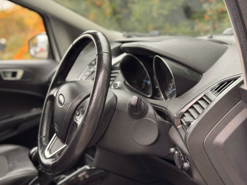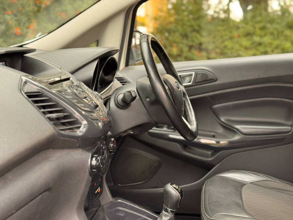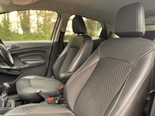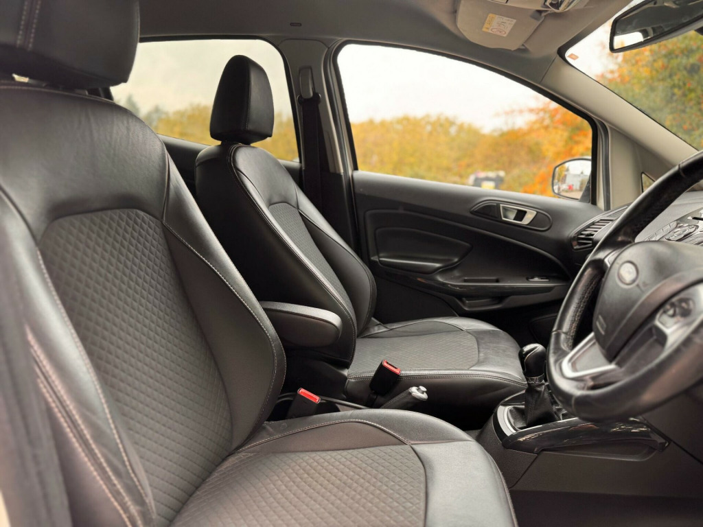 2 FORMER KEEPERS FROM NEW - SERVICE HISTORY - MOT TILL JANUARY 2026 - REAR PARKING SENSORS - HEATED SEATS - BLUETOOTH - FINANCE AVAILABLE - JUST BEEN SERVICED - ALL PART EXCHANGES ARE WELCOME - OVER 200 CARS IN STOCK - CALL FOR MORE INFORMATION Discover this Ford EcoSport T Titanium, a stylish and practical compact SUV. Powered by an efficient 1.0L petrol engine, this model offers a compelling blend of performance and economy. It features EATC Electronic Automatic Temperature Control for effortless climate management and Keyless Entry for convenient access.This Ford EcoSport stands out with its impressive fuel economy, achieving up to 53 miles per gallon, which indicates it is more economical than many similar vehicles. Furthermore, its low insurance group and low CO2 emissions highlight its cost effectiveness and environmental consideration, making it an attractive choice for a wide range of drivers. in alloy wheels - 6 spoke, abs - anti-lock braking system, aux connection, airbag - front passenger, airbags - curtain, airbags - passenger deactivation, airbags - side impact, card holder, central locking - keyless entry, chrome grille - large, dds - deflation detection system, daytime running lamps, door handle integrated in rear light, drivers airbag, eatc - electronic automatic temperature control - climate control, electric windows - front and rear, floor mats - carpet - front and rear, ford power starter button, front fog lights, front skid plates, glovebox - cooled, handbrake cover - leather, power assisted steering, radio cd player mp3 compatible, rake adjustable rear seat, rake and reach steering adjustable, rear skid plates, seats - drivers lumbar support, seats - drivers manual height and tilt adjustment, silver roof rails, slide out drawer under the front seat, spare wheel with cover - alloy, steering wheel - audio controls, steering wheel - leather, stowage pockets - front seatback, sunglasses holder, thatcham category 1 alarm, trip computer, tyre pressure monitoring system, usb connection