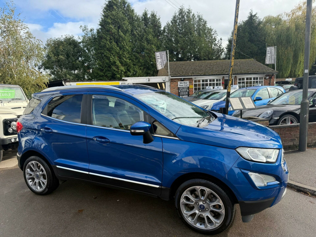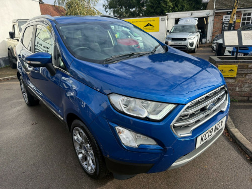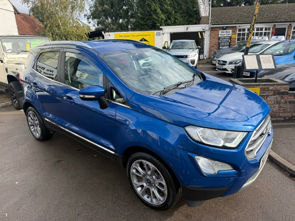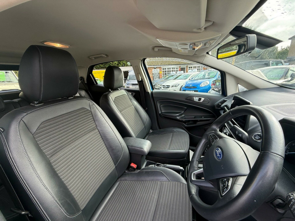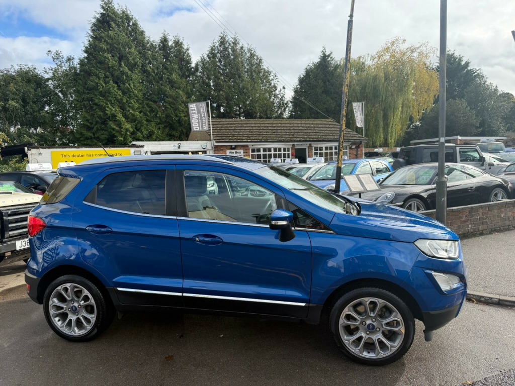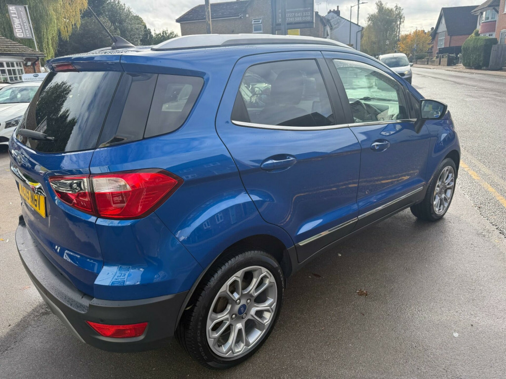 Allwood of Sandridge are pleased to be able to bring to market this lovely condition throughout and full service history with a wet belt replacement via Ford main dealer at 60,000 miles. In stunning lightning blue metallic paintwork this  Ford EcoSport 1.0T EcoBoost range topping Titanium edition has a lovely service record accompanying it. With full ford main dealer history for its first 4 service visits then followed by specialist independent with the last service at 55000 miles then a wet belt belt change at 60000 where the oil was changed again at the same time giving you  a lovely full history of 6 services. For further peace of mind the current MOT runs right through till 20/08/2026. Fully HPI verified with confirmation of the cars miles and 2 owners from new. 2 keys are also equipped with the car. A tremendous level of spec comes with the Titanium edition and highlights include features such as a full wide screen entertainment system with full navigation and reverse camera system, half leather interior, folding electric mirrors, dual USB inputs, keyless go, ambient lighting, leather multi functional steering wheel and cruise control with the exterior of the vehicle trimmed with gloss grey alloy wheels and privacy glass to complete the overall look. Ready to drive away! We offer our clients full dealership facilities, part exchange valuations with up to the minute market pricing. FCA regulated with access to some of the best funding options in the market (subject to status and vehicle choice). Our Staff are fully SAF approved. A portfolio of extended warranty options are on offer to suit your needs. Looking for a great driving and condition Ecosport, with wonderful spec and great colour combination with full history and new MOT and service? Our dealerships are fully AA Approved via trading standards and all vehicles come with free AA breakdown cover. We operate via appointments for viewings and test drives in order to give you the best possible service simply contact the friendly team today on 01727 641 333 or what's app and text services on 07741 585000 in alloy wheels - 10 spoke flash grey machined, adjustable boot load floor, air conditioning - electronic automatic temperature control - eatc, airbags - curtain, airbags - driver and front passenger, airbags - drivers knee, airbags - front passenger de-activation switch, alarm - thatcham category 1 with volume sensing and perimeter, ambient lighting - instrument panel and footwell, analogue instrument cluster, anti-lock braking system - abs with electronic stability control - esc, auto-dimming electrochromic rear-view mirror, automatic headlights, centre console cup holder with chrome accent, centre console with covered bin and sliding armrest, child locks, chrome headlight bezel, courtesy light - front with two map lights, courtesy light - rear, cruise control, door frame beltline - chrome, door handles - body colour, door mirrors - body colour housing, door mirrors - power-foldable heated with integrated side indicator and puddle lights, driver seat manual height- fore/aft and seatback angle adjustment and recliner, driver seat manual rotary knob lumbar support adjustment, driver and passengers sun visor with covered vanity mirror and ticket strip on drivers side, drivers stowage glovebox, epas - electric power assisted steering, esp - electronic stability programme with hill launch assist, emergency assistance, engine immobiliser, ford easy fuel - capless refuelling system, ford sync 3 navigation with 8in touchscreen, front fog lights and turn indication light bezel - body colour, front fog lights with combined turn indication light, front grille - chrome, front seat - passenger manual - fore-aft and recline adjustment, front seat - under passenger seat stowage, front seats - 2-way head restraint up-down, front seats - 3 point seat belts with load limiter and seatbelt height adjust, front seats - seat-back map pockets, front suspension - independent with macpherson struts and anti-roll bar, front and rear bumper - body colour with dark insert, front and rear floor mats, front and rear folding grab handles, front and rear power points - 12v, full length overhead console with sunglasses holder, gear shift indicator, glovebox with cool bin - lid and illumination, halogen rear lights, handbrake grip - leather-trimmed, headlights - courtesy delay, headlights - levelling control, headlights - projector beam headlight with led daytime running lights, height lumbar adjustment on drivers seat, high mounted brake light, ips - intelligent protection system, keyless start with ford power start button, leather handbrake and gearknob, load compartment - lights, load compartment carpet, load compartment side trim incorporating shopping hooks, lower body side - door claddings - black with chrome insert, manual parking brake, mykey, power front and rear windows with global opening-closing, quickclear heated front windscreen with heated washer jets, rake adjustable rear seat, rear seat - 60-40 split folding seats, rear seats - 2-way head restraint up-down, rear seats - centre head restraint - up-down, rear seats - retractable rear seat belt - 3-point all positions, rear suspension - semi-independent twist beam with twin gas and oil-filled shock absorbers, rear view camera pack, remote central locking, rocker panel and side cladding - black, seat belt reminder system - drivers and front passengers, seats - isofix mounting provision for child seats - outer seats only, select shift sports mode technology, side impact door beams, silver roof rails, soft instrument panel cover, steering column - rake and reach adjustment, steering wheel - leather-trimmed with chrome inserts, steering wheel - paddle shift, suspension - front stabiliser bar, tailgate handle - chrome, threshold plates - front - stainless steel with ecosport logo, tie-down hooks, trip computer, tyre inflator kit, tyre pressure monitoring system, tyre repair kit, wipers - front - automati