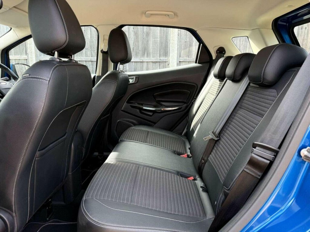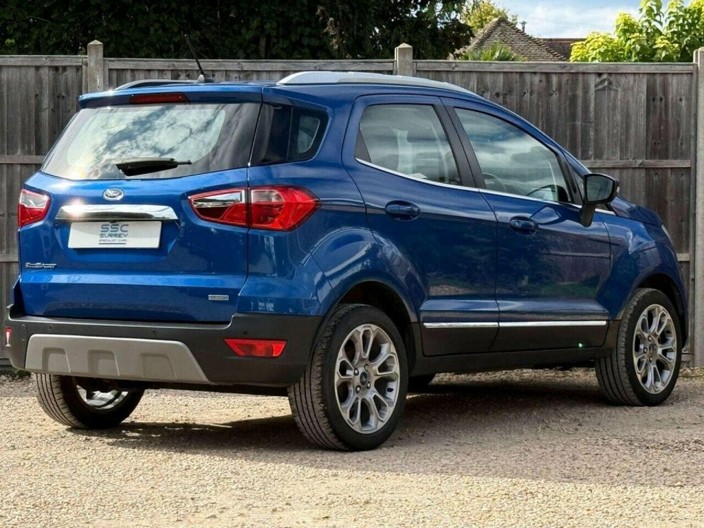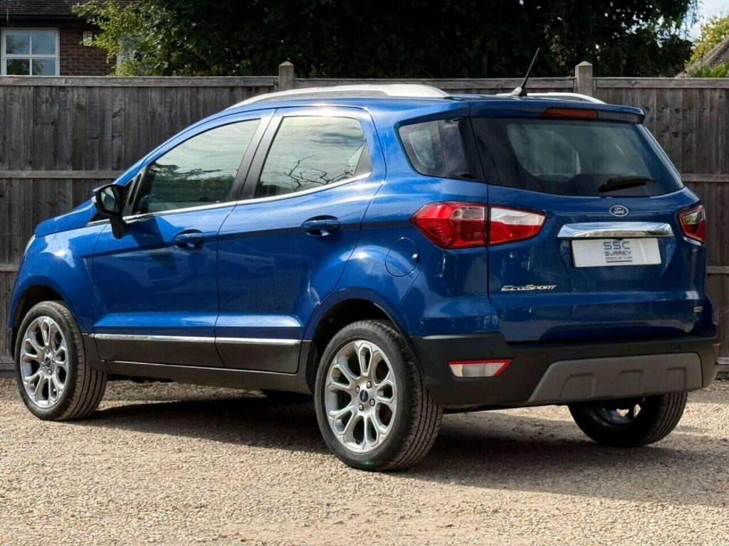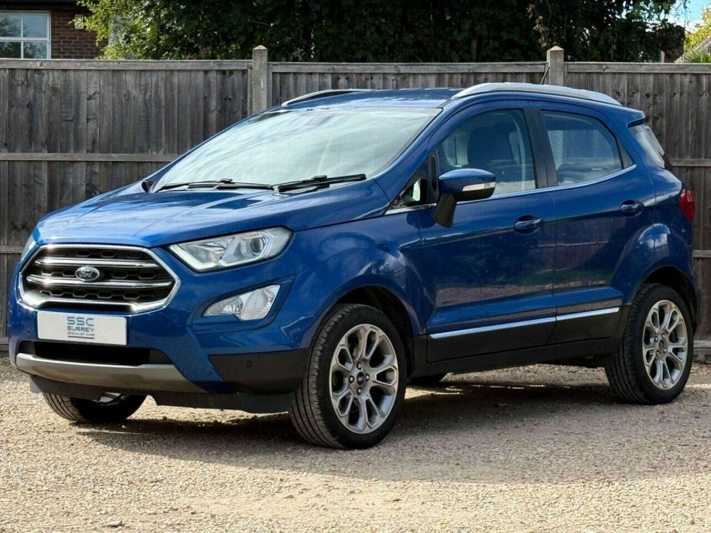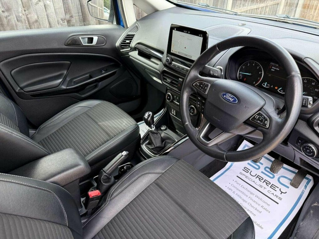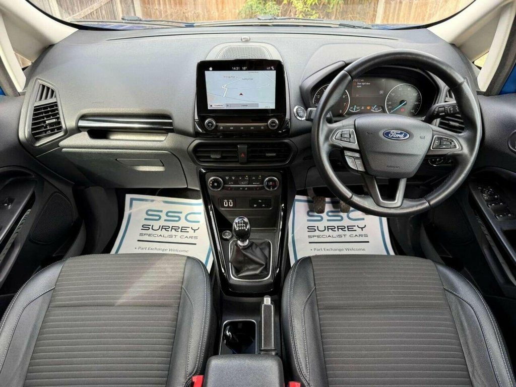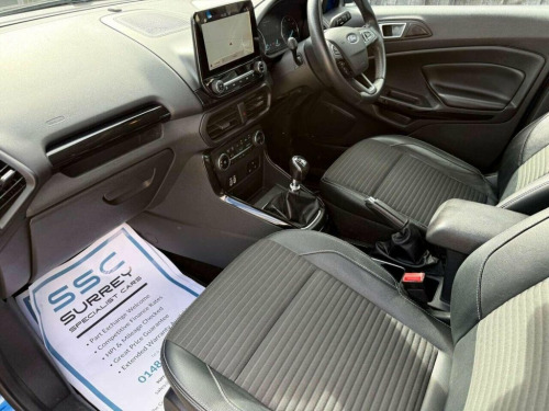 Surrey Specialist Cars are proud to present our lovely Ford Ecosport Titanium. This amazing car comes with Service History from the Main Dealer, finished in stunning metallic blue with grey contrast interior. The car was last serviced in March 2025 at 44,515 miles. The car has a MOT until March 2026 so it is ready to go. The 1L Petrol engine offers superb economy at over 53 MPG on combined cycle. Features Include Multifunction Steering Wheel, Trip Computer, Satellite Navigation, Parking Camera, Heated Seats, Heated Windscreen, Cruise Control, Stereo/Phone Control, Bluetooth Audio, AUX Input, USB Input, FM Radio, CD Player, Climate Control, 12V Charging Socket, 6 Speed Manual Gearbox, Electric Windows, Fog Lights, 17 Inch Alloy Wheels and two Remote Control Keys to name a few. We are open 7 days a week, and prepare all of our cars to the highest standards. We have a Click & Collect option available, and can also arrange delivery on request. All cars are HPI clear and a full history report is provided with every car. We welcome any inspection and viewing is highly recommended. All cars are available with our AA warranty starting from just ?150 for 3 months. Debit and credit card facilities are available and we offer competitive finance packages. If you have any questions or would like to view any of our cars give us a call or drop us a message on whatsapp 01483 363 144 to arrange an appointment with one of our team. We also offer full bespoke walkaround videos on request. We 17in Alloy Wheels - 10 Spoke Flash Grey , Adjustable Boot Load Floor, Air Conditioning - Electronic Automatic , Airbags - Curtain, Airbags - Driver and Front Passenger, Airbags - Drivers Knee, Airbags - Front Passenger De-Activation , Alarm - Thatcham Category 1 with Volume , Ambient Lighting - Instrument Panel and , Analogue Instrument Cluster, Anti-Lock Braking System - ABS with Elec, Auto-Dimming Electrochromic Rear-View Mi, Automatic Headlights, Centre Console Cup Holder with Chrome Ac, Centre Console with Covered Bin and Slid, Child Locks, Chrome Headlight Bezel, Courtesy Light - Front with Two Map Ligh, Courtesy Light - Rear, Cruise Control, Door Frame Beltline - Chrome, Door Handles -
