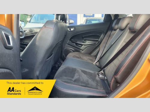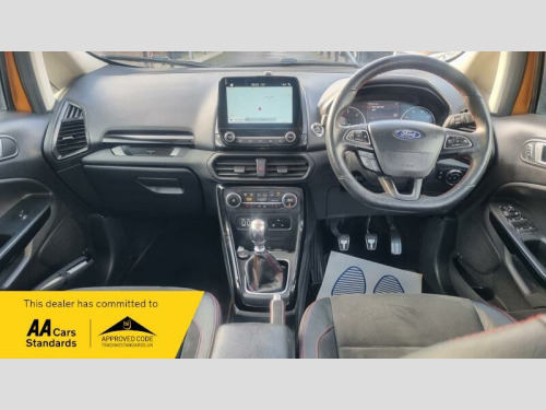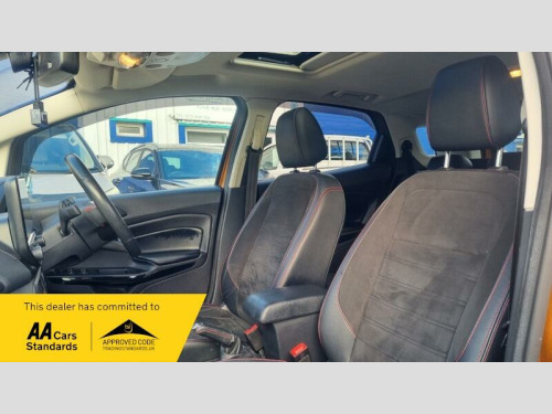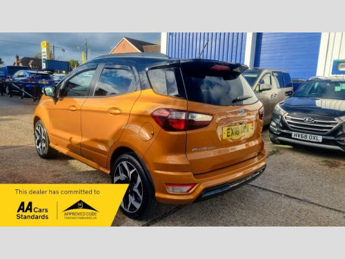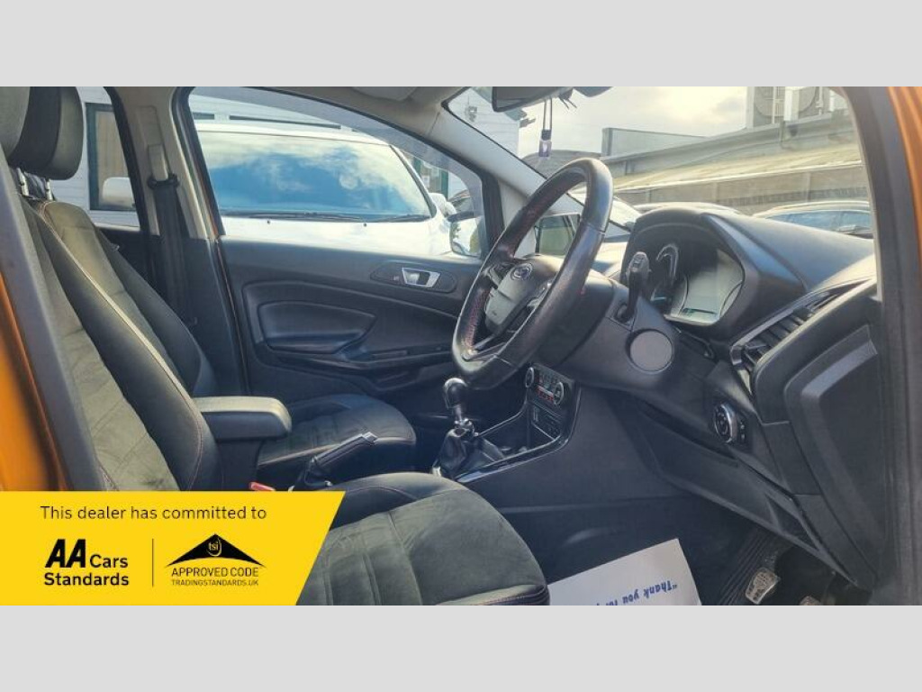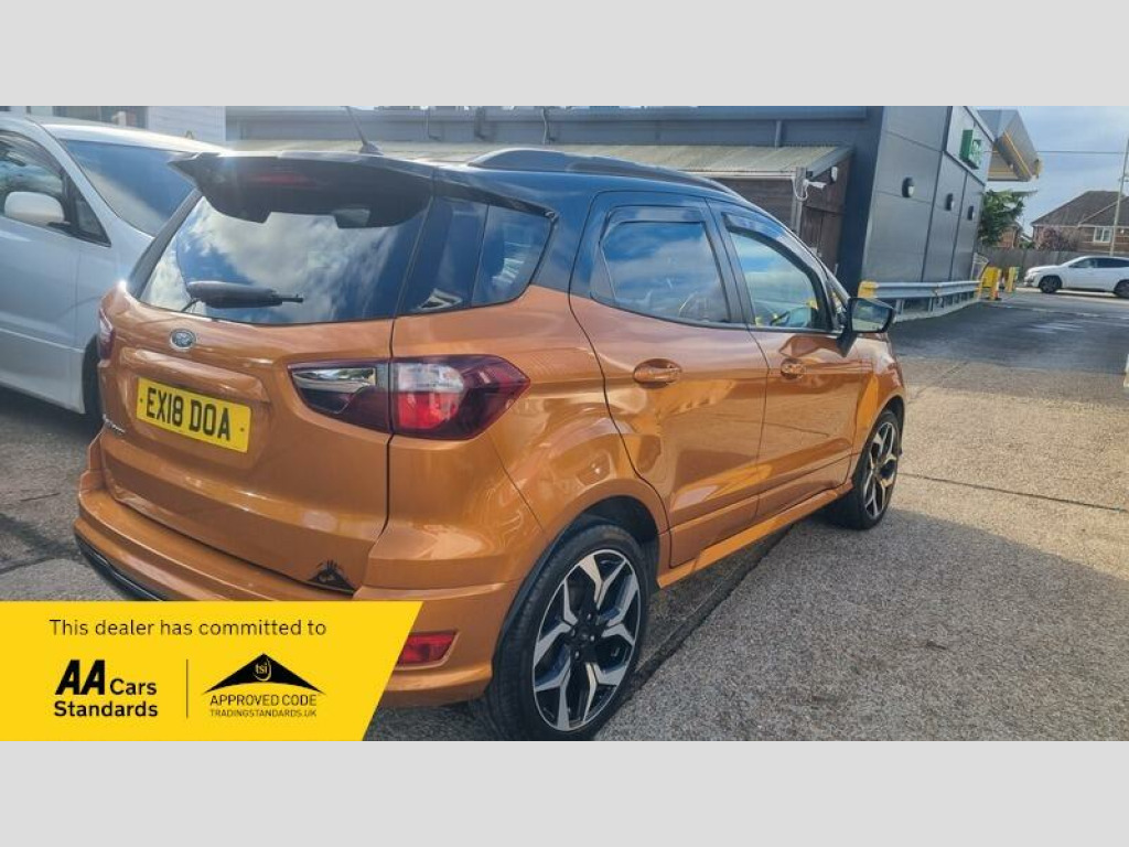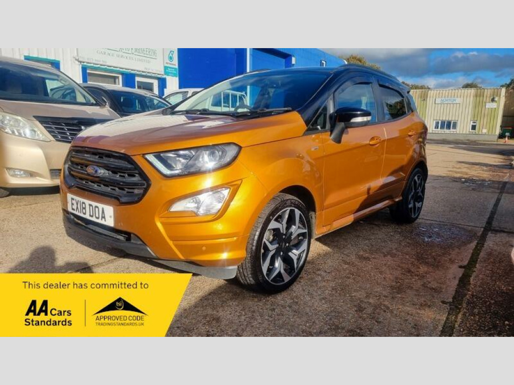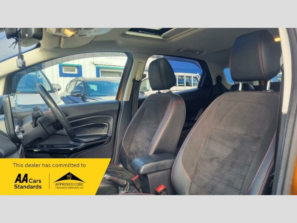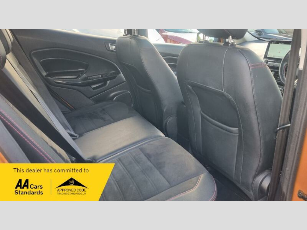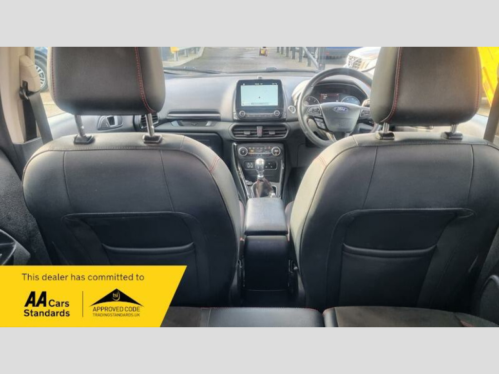 This 2018 Ford EcoSport TDCi ST-Line offers excellent peace of mind with its MOT valid until February 2026 and a clear vehicle history check. This stylish ST-Line model is powered by an efficient 1.5 litre diesel engine, meeting Euro 6 emissions standards.You will appreciate the impressive fuel economy of this EcoSport, achieving up to 69 miles per gallon, which is a significant advantage for your running costs. Furthermore, its low CO2 emissions and low insurance group rating demonstrate how this vehicle is a more economical choice compared to many others in its class. s, alarm, central locking, power assisted steering, 12v power socket, automatic rearview mirror dimming, cruise control, cup holders, engine immobiliser, front airbags, front fog lights, heated door mirrors, heated windscreen, isofix anchor point, parking camera, rain sensor, reading lights, rear spoiler, safety belts, satellite navigation, side impact airbags, sports suspension, start stop system