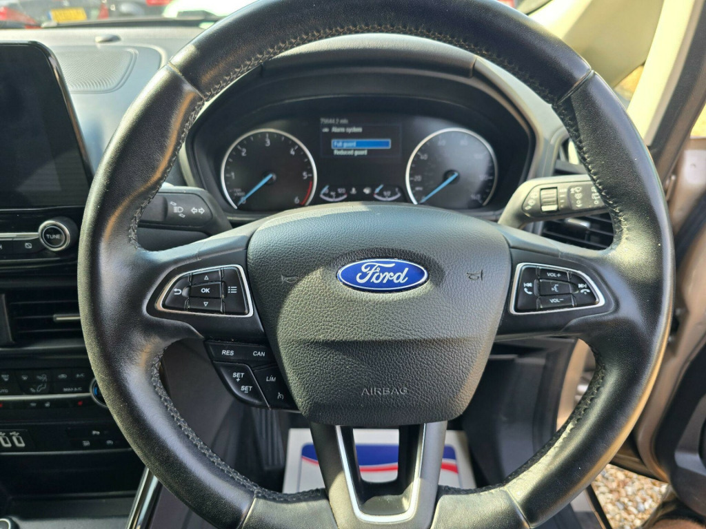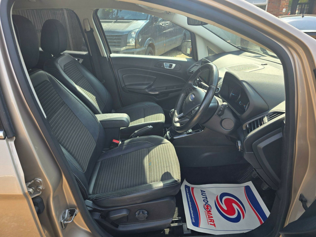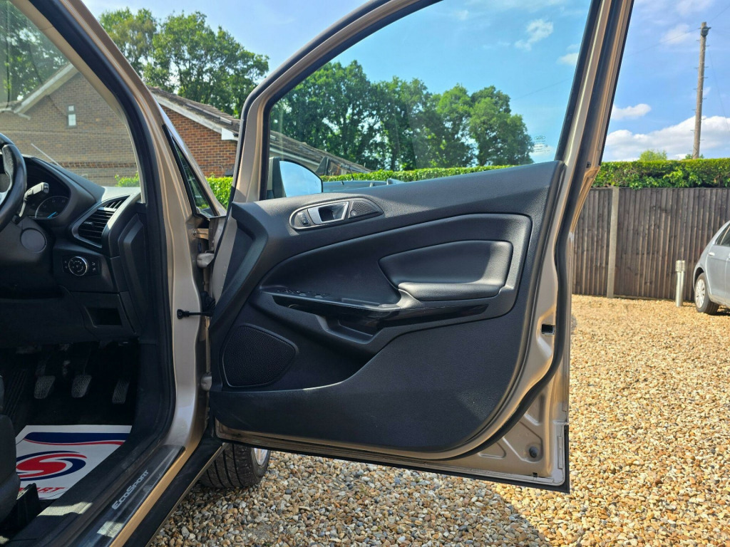 ***REVERSE CAMERA, SAT NAV, HEATED STEERING WHEEL, B&O SOUND SYSTEM POWER FOLD MIRRORS, CRUISE CONTROL***JUST SERVICED***CARD FACILITIES AVAILABLE, NATIONAL DELIVERY AVAILABLE, DRIVES GREAT, COMES WITH 2 SETS OF KEYS***PART EXCHANGE WELCOM*** and o play in-car audio premium sound system, front parking sensors, ford keyless entry and keyless start, 18in alloy wheels - flash grey machined finish, rear privacy glass, 17in alloy wheels - 10 spoke flash grey machined, adjustable boot load floor, airbags - curtain, airbags - driver and front passenger, airbags - drivers knee, airbags - front passenger de-activation switch, alarm - thatcham category 1 with volume sensing and perimeter, ambient lighting - instrument panel and footwell, analogue instrument cluster, anti-lock braking system - abs with electronic stability control - esc, automatic dimming rear view mirror, automatic headlights, centre console cup holder with chrome accent, centre console with sliding armrest, child locks, chrome headlight bezel, courtesy light - front with two map lights, courtesy light - rear, cruise control, door frame beltline - chrome, door handles - body colour, door mirrors - power-foldable heated with integrated side indicator and puddle lights, driver seat manual height- fore/aft and seatback angle adjustment and recliner, driver seat manual rotary knob lumbar support adjustment, driver and passengers sun visor with covered vanity mirror and ticket strip on drivers side, drivers stowage glovebox, epas - electric power assisted steering, electronic automatic temperature control - eatc, emergency assistance, engine immobiliser, ford dab navigation system with ford sync3, ford easy fuel - capless refuelling system, front 2-way head restraints, front fog lights, front grille - chrome, front seat - passenger manual - fore-aft and recline adjustment, front seats - 3 point seat belts with load limiter and seatbelt height adjust, front seats - seat-back map pockets, front suspension - independent with macpherson struts and anti-roll bar, front and rear bumper - body colour with dark insert, front and rear floor mats, front and rear folding grab handles, front and rear power points - 12v, full length overhead console with sunglasses holder, gear shift indicator, gearshift knob - black insert and chrome-finish ring, glovebox with cool bin - lid and illumination, halogen headlamps with led day running lights, halogen rear lights, handbrake grip - leather-trimmed, headlights - courtesy delay, headlights - levelling control, high mounted brake light, ips - intelligent protection system, keyless start with ford power start button, load compartment - lights, load compartment carpet, load compartment side trim incorporating shopping hooks, lower body side - door claddings - black with chrome insert, manual parking brake, mykey, power front and rear windows with global opening-closing, quickclear heated front windscreen with heated washer jets, rain sensing wipers, rear seat - fold and tumble 60-40 split - split back, rear seats - centre head restraint - up-down, rear seats - retractable rear seat belt - 3-point all positions, rear suspension - semi-independent twist beam with twin gas and oil-filled shock absorbers, rear view camera with rear parking sensors, remote central locking, rocker panel and side cladding - black, seat belt reminder system - drivers and front passengers, seats - isofix mounting provision for child seats - outer seats only, side impact door beams, silver roof rails, soft instrument panel cover, steering column - rake and reach adjustment, steering wheel - leather-trimmed with chrome inserts, storage - front passenger underseat area, suspension - front stabiliser bar, tailgate handle - chrome, threshold plates - front - stainless steel with ecosport logo, tie-down hooks, trip computer, tyre pressure monitoring system, tyre repair kit, wiper - intermittent rear wash-wipe