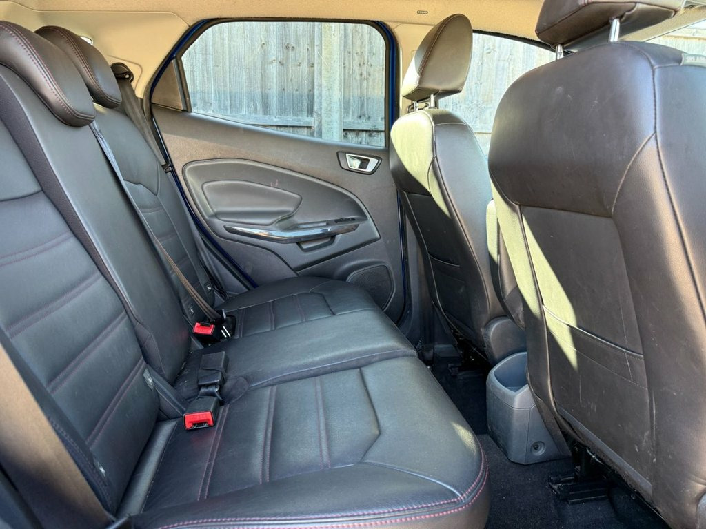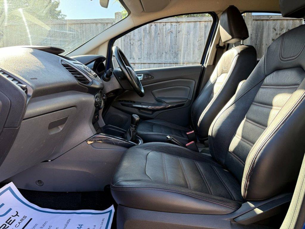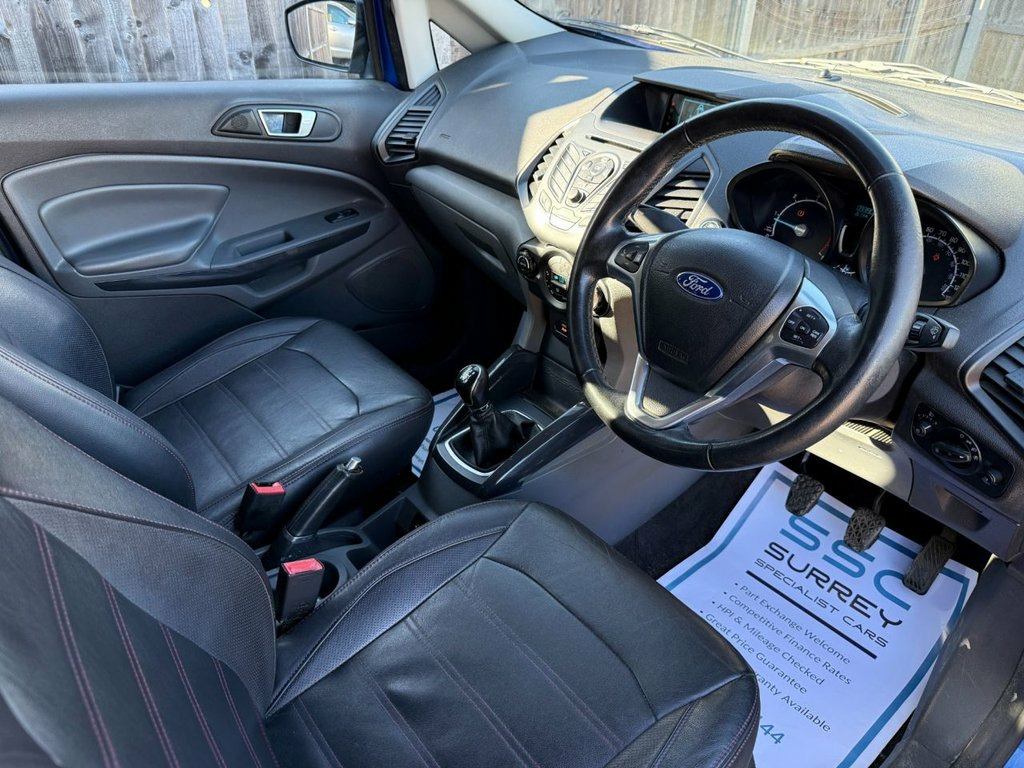 Surrey Specialist Cars are proud to present our lovely Ford Ecosport Titanium TDCI. This amazing car comes with Service History, finished in stunning metallic blue with full leather seats. The car has a Long MOT until September 2026 so it is ready to go. The 1.5L Diesel engine offers superb economy at over 62 MPG on combined cycle. Features Include Multifunction Steering Wheel, Trip Computer, Parking Sensors Heated Windscreen, Cruise Control, Stereo/Phone Control, Bluetooth Audio, AUX Input, USB Input, FM Radio, CD Player, Climate Control, 12V Charging Socket, 5 Speed Manual Gearbox, Electric Windows, Fog Lights, 17 Inch Alloy Wheels and one Remote Control Key to name a few. 16in Alloy Wheels - 6 Spoke, ABS - Anti-lock Braking System, AUX Connection, Airbag - Front Passenger, Airbags - Curtain, Airbags - Passenger Deactivation, Airbags - Side Impact, Card Holder, Central Locking - Keyless Entry, Chrome Grille - Large, DDS - Deflation Detection System, Daytime Running Lamps, Door Handle Integrated in Rear Light, Drivers Airbag, EATC - Electronic Automatic Temperature , Electric Windows - Front and Rear, Floor Mats - Carpet - Front and Rear, Ford Power Starter Button, Front Fog Lights, Front Skid Plates, Glovebox - Cooled, Handbrake Cover - Leather, Power Assisted Steering, Radio CD Player MP3 Compatible, Rake Adjustable Rear Seat, Rake and Reach Steering Adjustab