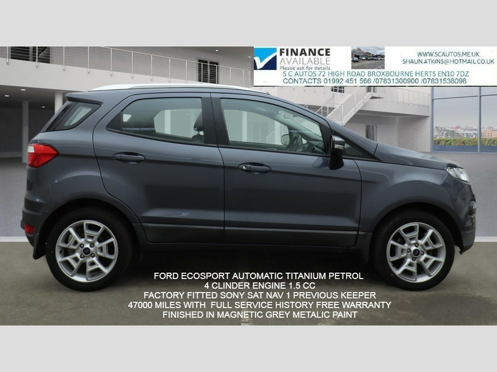 This 2016 Ford EcoSport 1.5 Titanium SUV 5dr Petrol Powershift 2WD Euro 5 (112 ps) is currently available for £7,695 in Broxbourne Hertfordshire with Petrol engine and Automatic gearbox. For more information or to arrange a viewing, click here to send us an email using form below.