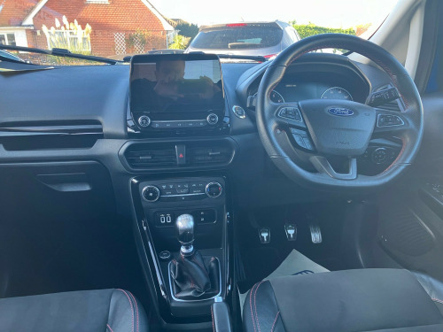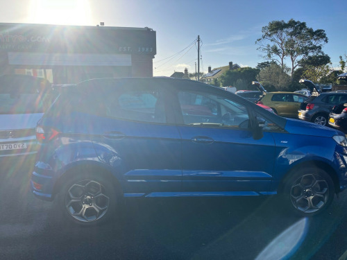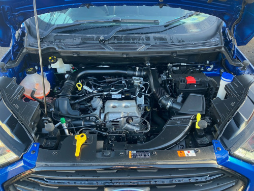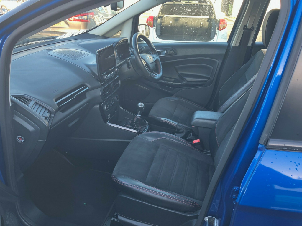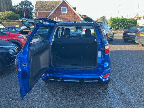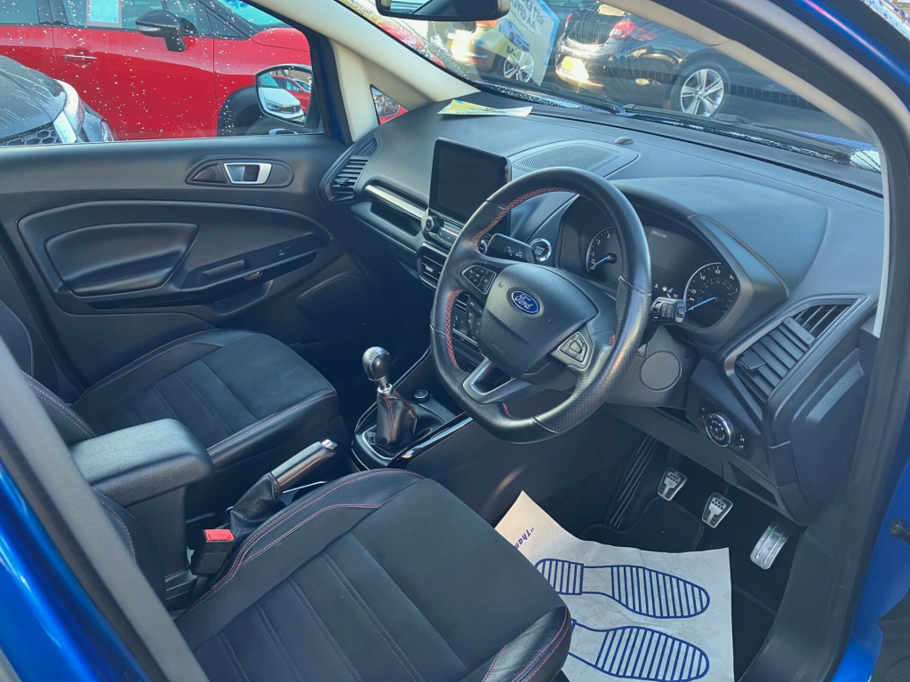 2018 Ford Ecosport 125 ST-Line 1.0 EcoBoost 5 Dr [6] finished in the stunning colour Lightning Blue with only 29,900 miles from & just 1 previous keeper from new. ST-Line trim: Features cruise control, easy fuel capless refuelling system, rear parking sensors & a rear view camera for added safety. The SYNC 3 nav system with DAB radio, 8'' touch screen, emergency assistance, Apple CarPlay/Android Auto & 2x USB sockets make for a modern & convenient driving experience. The Ford EcoSport ST-Line 2018 is a good option for those seeking a compact SUV with sporty styling & a fun driving experience., uise control, easy fuel capless refuelling system, pas, rear parking sensors and rear view camera, sync 3 nav system with dab radio, 8'' touch screen, emergency assistance, apple car play/android auto,2x usb sockets, trip computer, voice control system, sports suspension, steering wheel mounted audio controls, 'quickclear' heated windscreen/heated washer jets, auto dimming rear view mirror, automatic headlights, black roof rails, body colour door handles, body coloured bumpers, body styling kit, electric heated door mirrors, front fog lights, headlight levelling control, high gloss black front grille surround, large rear spoiler, led daytime running lights, rain sensor windscreen wipers, rear wiper, 12v socket in front and rear, 60/40 split rear seats, ambient interior lighting, ambient light, centre console with sliding front armrest, cooled glovebox, courtesy lights with map reading light, driver, driver/passenger sunvisors and lidded vanity mirrors, eatc - electronic auto temperature control, folding grab handles, footwell ambient lighting, front head restraints, front seat back map pockets, front/rear floor mats, height adjustable drivers seat with lumbar support, illuminated glovebox, illuminated luggage compartment, isofix system on outer rear seats, leather steering wheel/gearshift/handbrake lever with red stitching, luggage compartment carpet, overhead console with sunglasses holder, part leather upholstery, rake adjustable rear seats, reach + rake adjustable steering column, rear headrests, stainless steel sports pedals, steering wheel with chrome inserts, storage drawers under front seats, tie down hooks, variable boot floor, 17'' Alloys
