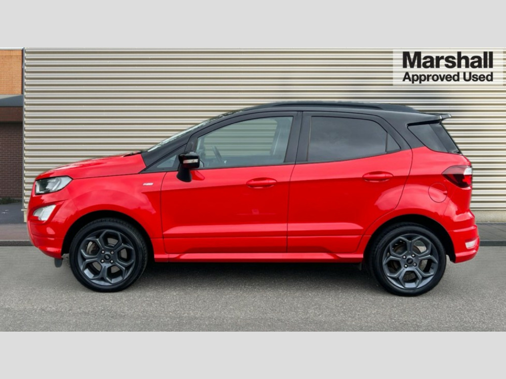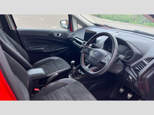 Ford Ecosport 1.0 EcoBoost 125 ST-Line 5dr 'Ford Power' starter button, Cruise control + speed limiter, Easy fuel capless refuelling system, PAS, Rear parking sensors and rear view camera, Trip computer, Voice control system, Sports suspension, Steering wheel mounted audio controls, 'Quickclear' heated windscreen/heated washer jets, Auto dimming rear view mirror, Automatic headlights, Black roof rails, Body colour door handles, Body coloured bumpers, Body styling kit, Electric heated door mirrors, Front fog lights, Headlight levelling control, High gloss black front grille surround, Large rear spoiler, LED daytime running lights, Rain sensor windscreen wipers, Rear wiper, 12V socket in front and rear, 60/40 split rear seats, Ambient interior lighting, Ambient light, Centre console with sliding front armrest, Cooled glovebox, Courtesy lights with map reading light, Driver's side glovebox, Driver/passenger sunvisors and lidded vanity mirrors, EATC - Electronic Auto Temperature control, Folding grab handles, Footwell ambient lighting, Front head restraints, Front seat back map pockets, Front/rear floor mats, Height adjustable drivers seat with lumbar support, Illuminated glovebox, Illuminated luggage compartment, Isofix system on outer rear seats, Luggage compartment carpet, Overhead console with sunglasses holder, Part leather upholstery, Perforated leather steering wheel with red stitching + gear knob, Rake adjustable rear seats, Reach + rake adjustable steering column, Rear headrests, Stainless steel sports pedals, Steering wheel with chrome inserts, Storage drawers under front seats, Tie down hooks, Variable boot floor, 3x3 point rear seatbelts, ABS, Child locks on rear doors, Curtain airbags, Driver airbag, Drivers knee airbag, Electronic Stability Programme, Emergency brake assist, Front passenger airbag deactivation, Front side airbags, Hill launch assist, Passenger airbag, Seatbelt reminder for driver and front passenger, Traction control, Tyre pressure monitoring system, Immobiliser, MyKey system, Remote central locking, Thatcham 1 volume sensing alarm, Tyre repair kit