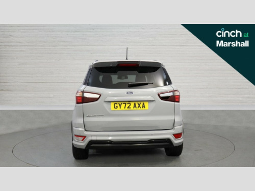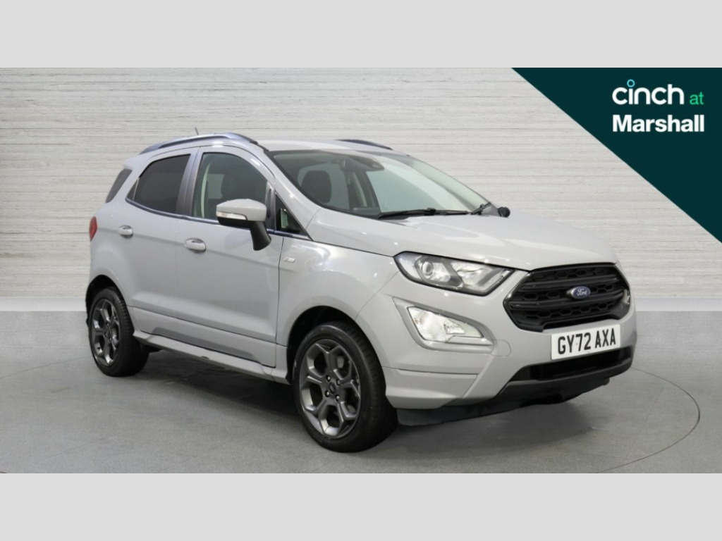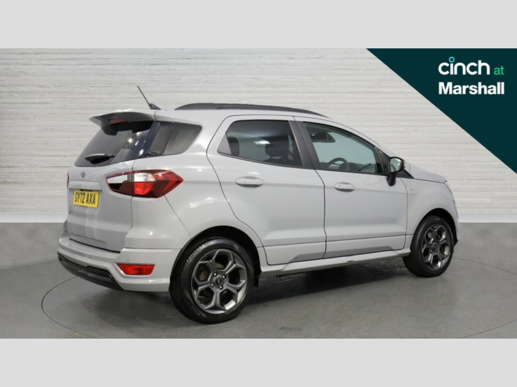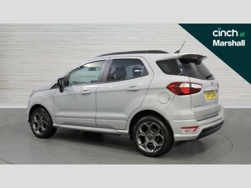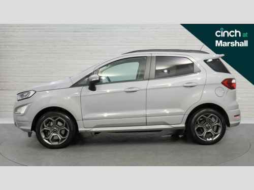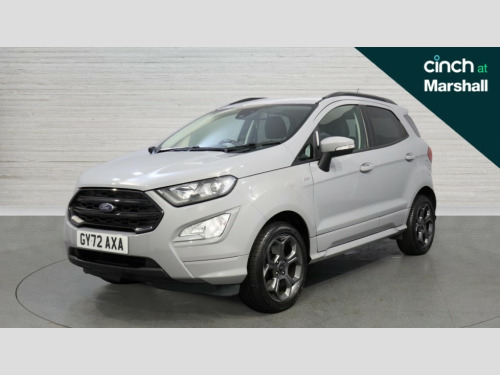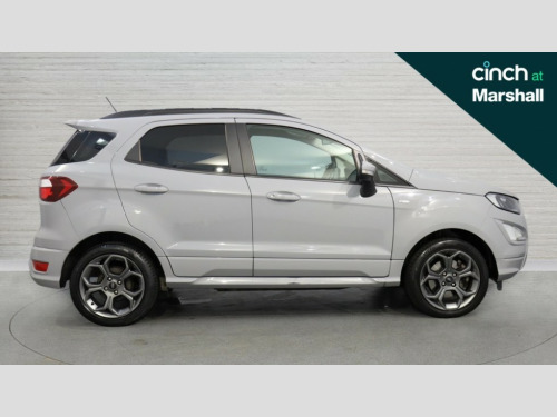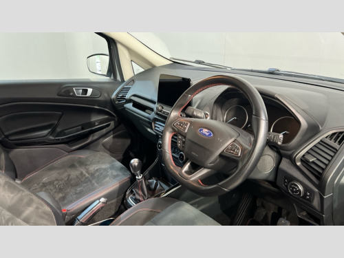 Ford Ecosport 1.0 EcoBoost 125 ST-Line 5dr Cruise control, e-Call (emergency call), Easy fuel capless refuelling system, Ford SYNC 3 nav system with DAB radio,8" screen, emergency assistance,Apple car play/Android auto, 2x USB, 6 speakers, Ford pass connect, Intelligent speed limiter, PAS, Rear parking sensors, Rear view camera, Traffic sign recognition, Trip computer, Sports suspension, Steering wheel mounted audio controls, Auto dimming rear view mirror, Automatic front wipers, Automatic headlights, Black roof rails, Body colour door handles, Body coloured bumpers, Chrome lower window surround, Electrically adjustable and heated door mirrors, Front fog lights, Front grille bars and surround in black, Headlight levelling control, Large rear roof spoiler, LED day running lights, LED third brake light, Power front and rear windows, Puddle lights, Quick-clear heated windscreen, Rear side wing doors, Rear wiper, ST Line body styling kit - Black headlamp bezel, front and rear sport bumpers, body colour lower door claddings, 12V socket in front and rear, 3 seat bench in 2nd row, 60/40 split rear seats, Ambient lighting, Centre console with sliding front armrest, Cooled glovebox, Courtesy lights with map reading light, Driver seat height/lumbar adjust, Driver's side glovebox, Driver/passenger sunvisors and lidded vanity mirrors, EATC - Electronic Auto Temperature control, Folding grab handles, Front head restraints, Front seat back map pockets, Illuminated glovebox, Illuminated luggage compartment, Isofix system on outer rear seats, Luggage compartment carpet, Neosuede/Partial sensico leather upholstery, Overhead console with sunglasses holder, Rake adjustable rear seats, Reach + rake adjustable steering column, Rear headrests, Sensico trimmed steering wheel, handbrake and gearshift gaiter with red stitching, Single front passenger seat, ST-Line Front floor mats with red stitching, Stainless steel sports pedals, Storage drawers under front seats, Tie down hooks, Variable boot floor, 3x3 point rear seatbelts, ABS, Autonomous emergency braking, Child locks on rear doors, Curtain airbags, Driver airbag, Drivers knee airbag, Electronic Stability Programme with hill launch assist, Front passenger airbag deactivation, Front side airbags, Passenger airbag, Pre collision assist system with AEB, Seatbelt reminder for driver and front passenger, Traction control, Tyre pressure monitoring system, Immobiliser, MyKey system, Remote central locking, Thatcham 1 volume sensing alarm, Low rolling resistance tyres, Tyre inflation kit
