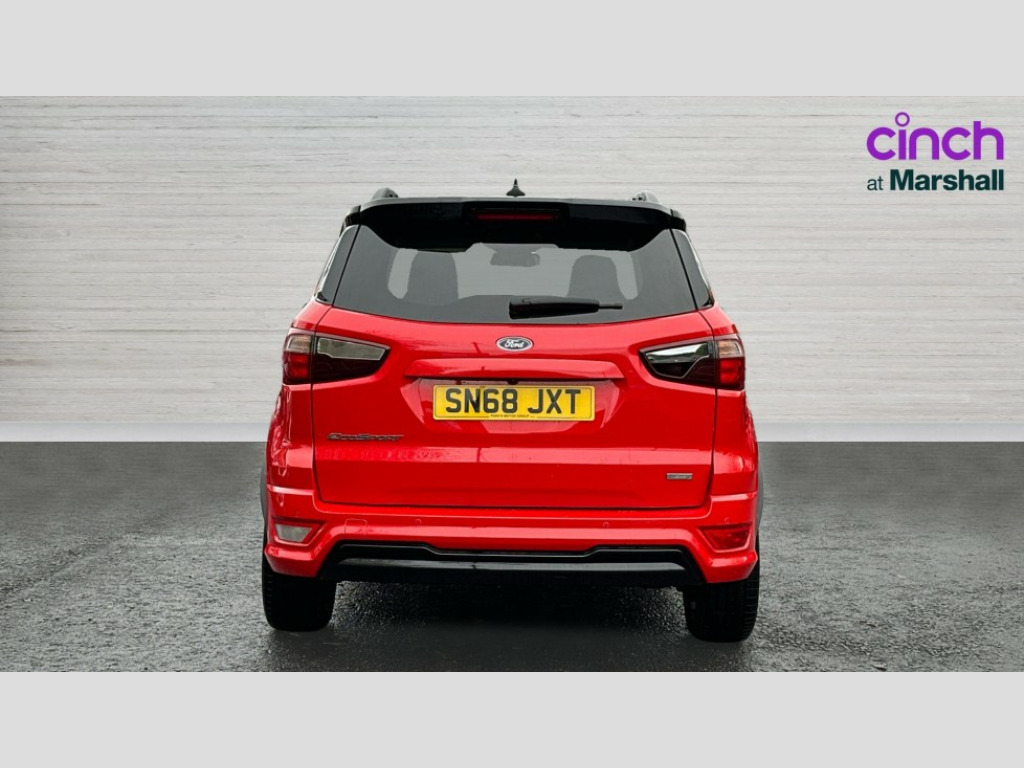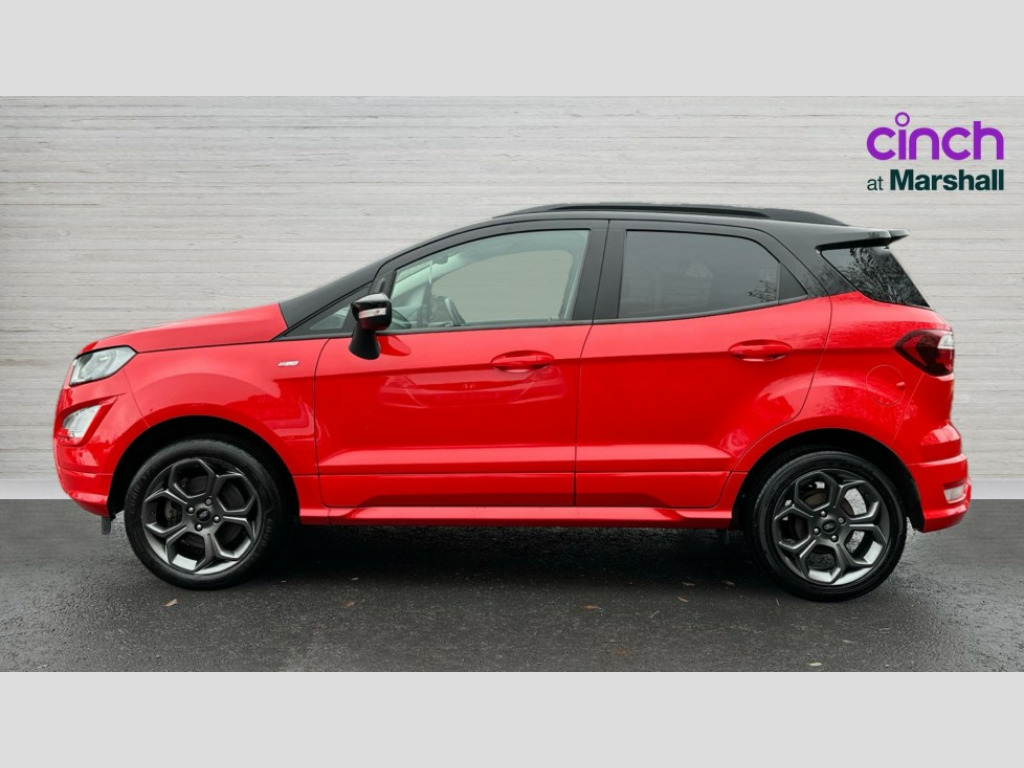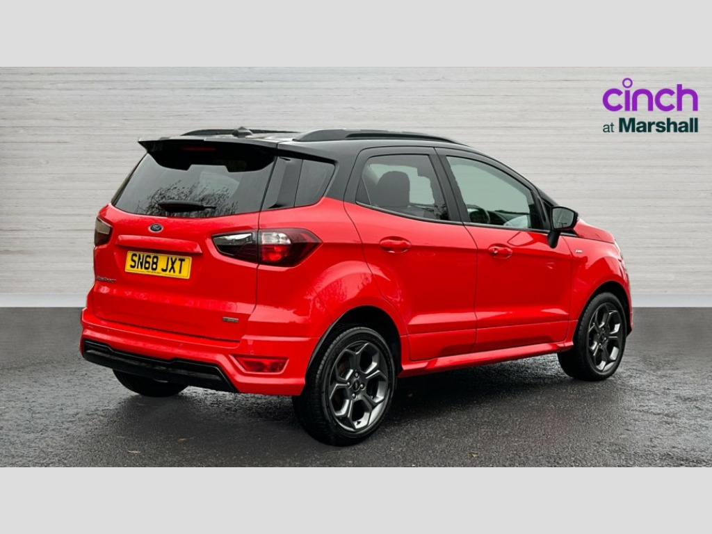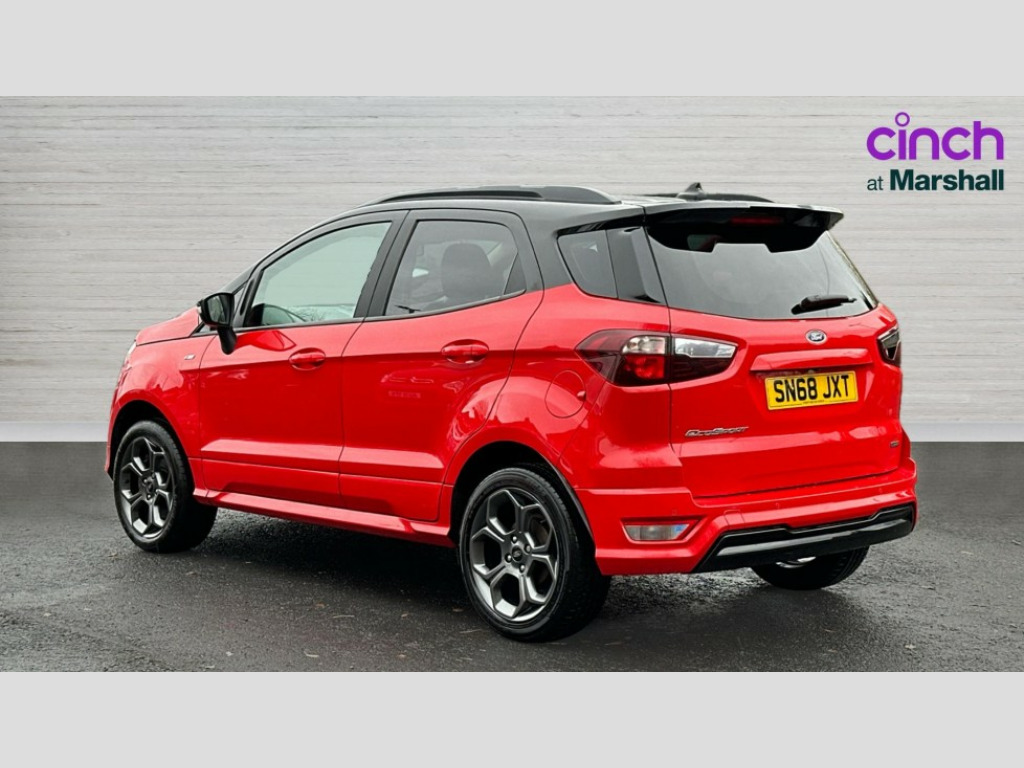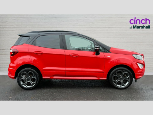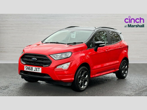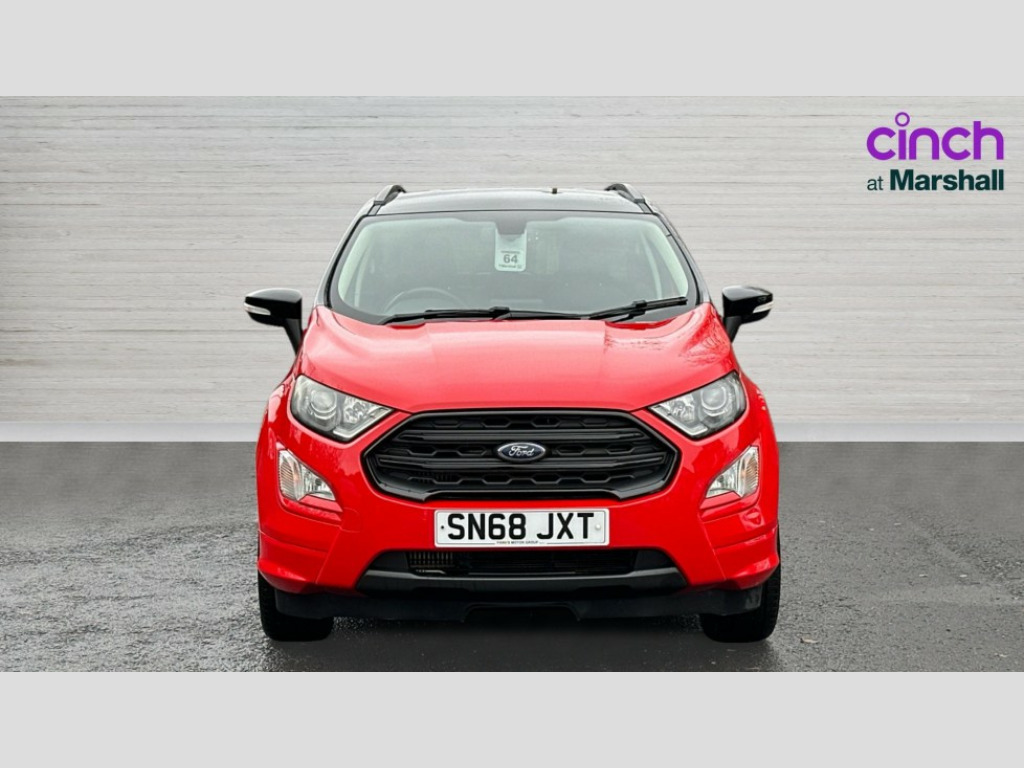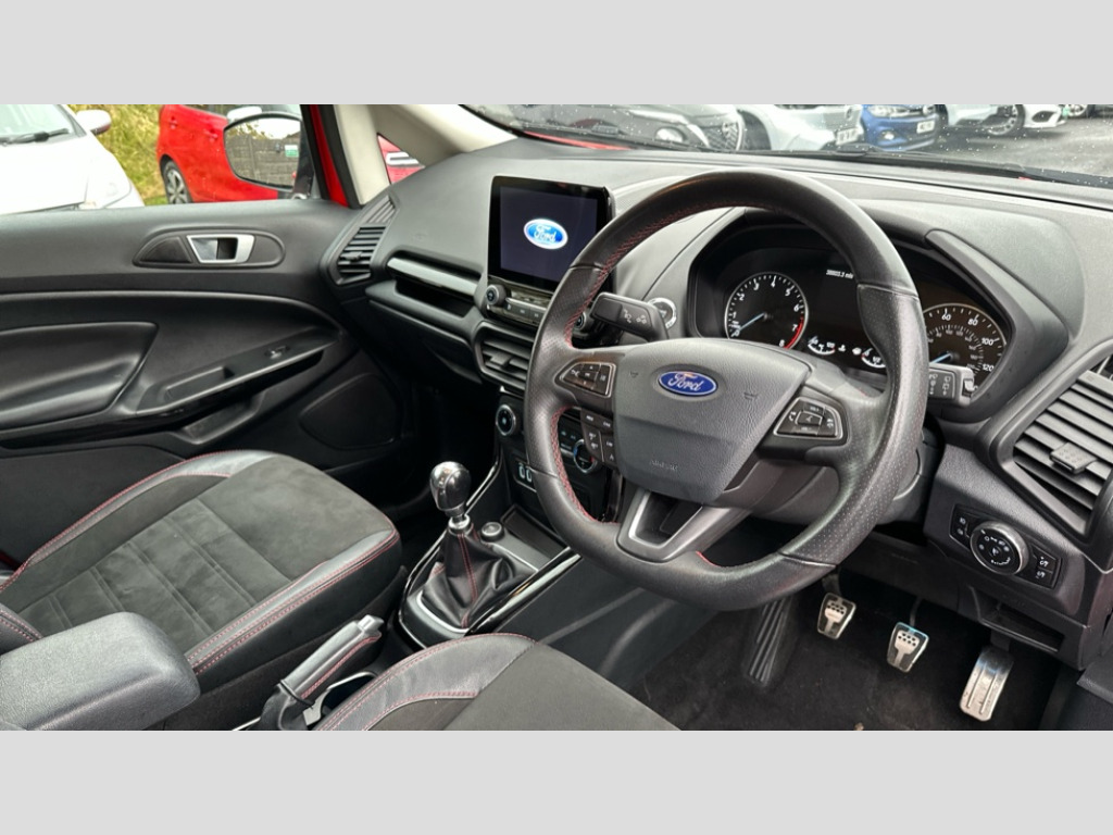 Ford Ecosport 1.0 EcoBoost 125 ST-Line 5dr Cruise control, Easy fuel capless refuelling system, PAS, SYNC 3 nav system with DAB radio, 8" screen, voice control, emergency assistance, Apple car play/Android auto, 2x USB, Ford pass connect, Trip computer, Sports suspension, Steering wheel mounted audio controls, 'Quickclear' heated windscreen/heated washer jets, Auto dimming rear view mirror, Automatic headlights, Black roof rails, Body colour door handles, Body coloured bumpers, Electrically adjustable and heated door mirrors, Front door threshold plates with ST-Line logo, Front fog lights, Headlamps with LED day running lights, Headlight levelling control, Large rear spoiler, Power foldable door mirrors with puddle lights, Power front and rear windows with global opening/closing, Rain sensing front wipers, Rear wiper, ST-Line body styling kit, ST-Line front grille, 12V socket in front and rear, 60/40 split rear seats, 7 shade adjustable ambient lighting, Centre console with sliding front armrest, Cooled glovebox, Courtesy lights with map reading light, Driver seat height/lumbar adjust, Driver's side glovebox, Driver/passenger sunvisors and lidded vanity mirrors, EATC - Electronic Auto Temperature control, Folding grab handles, Footwell ambient lighting, Front head restraints, Front seat back map pockets, Front/rear floor mats, Illuminated glovebox, Illuminated luggage compartment, Isofix system on outer rear seats, Leather steering wheel/gearshift/handbrake lever with red stitching, Luggage compartment carpet, Overhead console with sunglasses holder, Partial leather upholstery, Rake adjustable rear seats, Reach + rake adjustable steering column, Rear headrests, Stainless steel sports pedals, Steering wheel with chrome inserts, Storage drawers under front seats, Tie down hooks, Variable boot floor, Rear view camera pack - Ecosport, 3x3 point rear seatbelts, ABS, Child locks on rear doors, Curtain airbags, Driver airbag, Drivers knee airbag, Electronic Stability Programme with hill launch assist, Emergency brake assist, Front passenger airbag deactivation, Front side airbags, Passenger airbag, Seatbelt reminder for driver and front passenger, Traction control, Tyre pressure monitoring system, Immobiliser, MyKey system, Remote central locking, Thatcham 1 volume sensing alarm, Tyre inflation kit