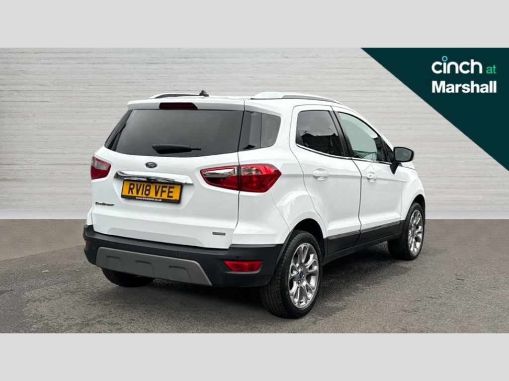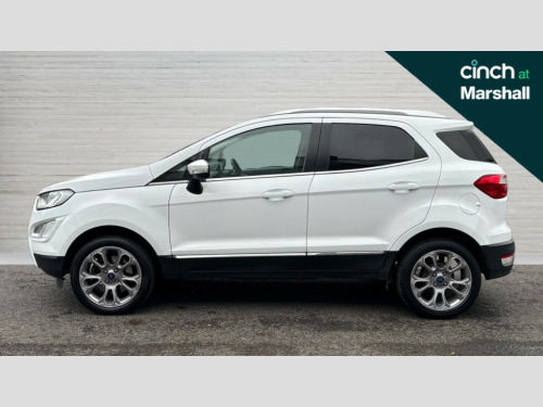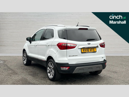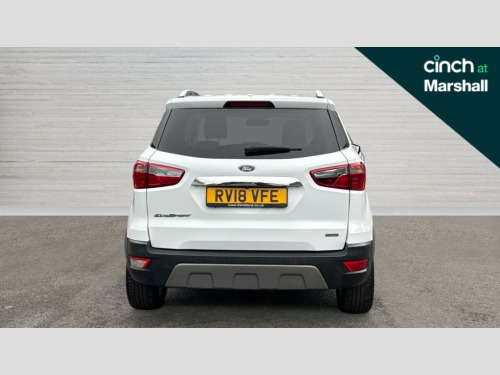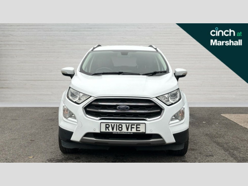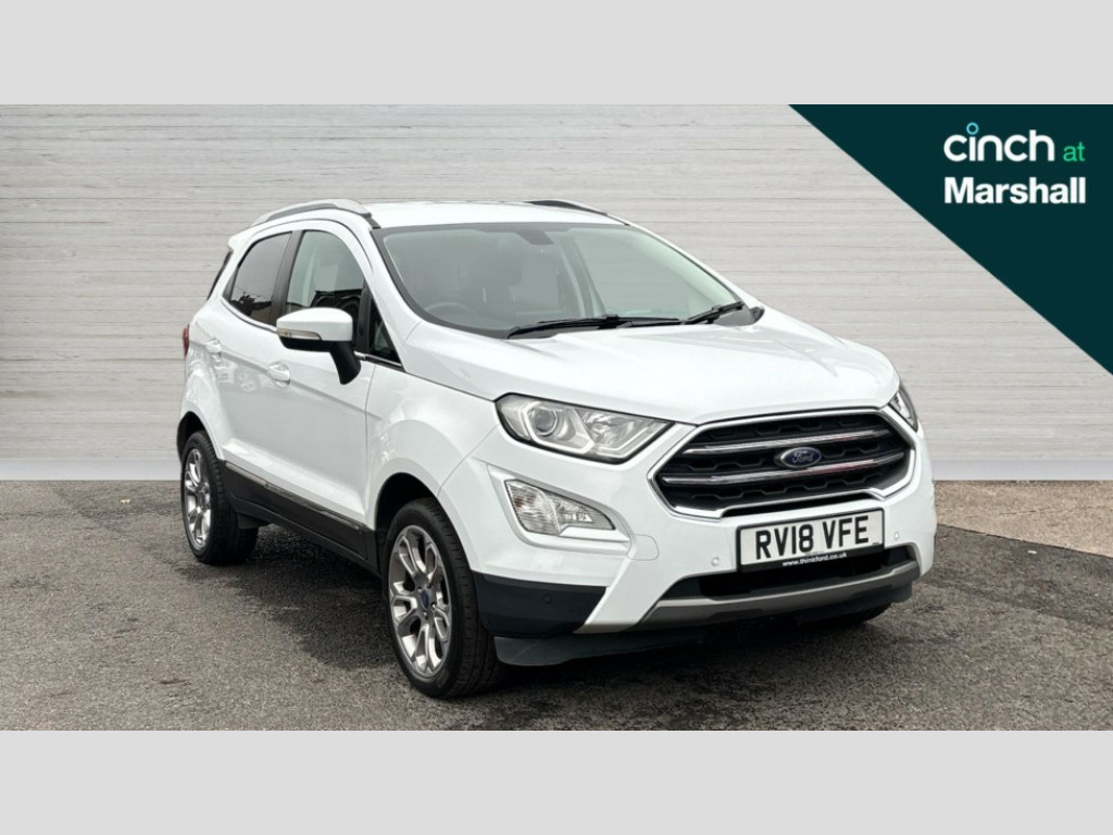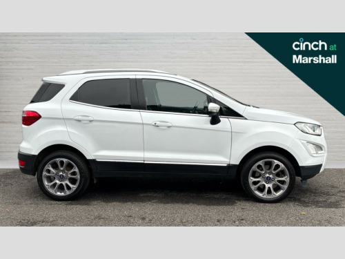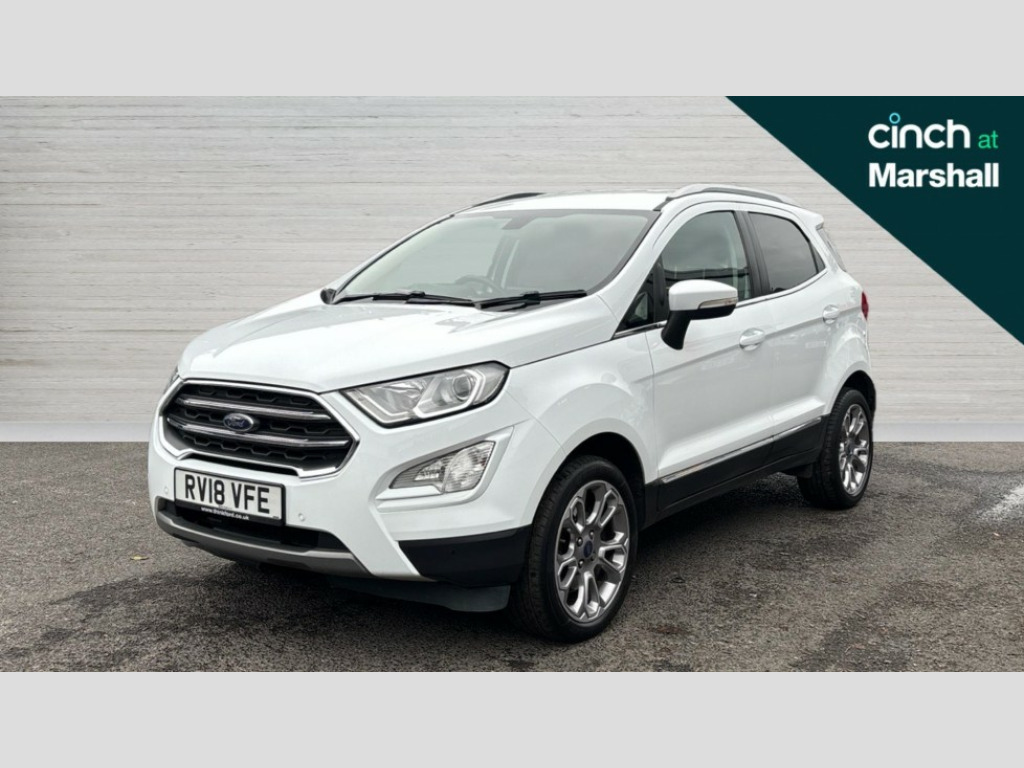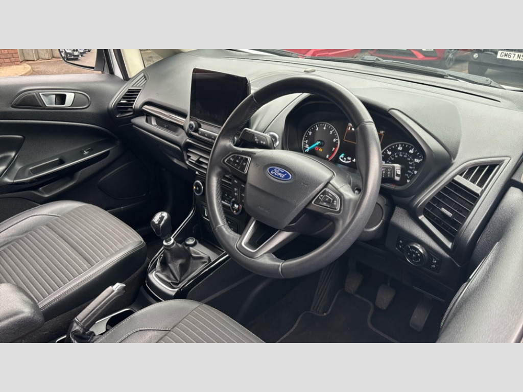 Ford Ecosport 1.0 EcoBoost 125 Titanium 5dr 'Ford Power' starter button, Cruise control + speed limiter, Easy fuel capless refuelling system, PAS, Rear parking sensors and rear view camera, Trip computer, Voice control system, 'Quickclear' heated windscreen/heated washer jets, Auto dimming rear view mirror, Automatic headlights, Body colour door handles, Body coloured bumpers, Electric heated door mirrors, Front fog lights, Front grille with chrome trim surround, Headlight levelling control, LED daytime running lights, Rain sensor windscreen wipers, Rear wiper, Silver roof rails, 12V socket in front and rear, 60/40 split rear seats, Ambient interior lighting, Ambient light, Centre console with sliding front armrest, Cooled glovebox, Courtesy lights with map reading light, Driver's side glovebox, Driver/passenger sunvisors and lidded vanity mirrors, EATC - Electronic Auto Temperature control, Folding grab handles, Footwell ambient lighting, Front head restraints, Front seat back map pockets, Front/rear floor mats, Height adjustable drivers seat with lumbar support, Illuminated glovebox, Illuminated luggage compartment, Isofix system on outer rear seats, Leather gear knob and handbrake grip, Leather steering wheel with audio controls, Luggage compartment carpet, Overhead console with sunglasses holder, Part leather upholstery, Rake adjustable rear seats, Reach + rake adjustable steering column, Rear headrests, Steering wheel with chrome inserts, Storage drawers under front seats, Tie down hooks, Variable boot floor, 3x3 point rear seatbelts, ABS, Child locks on rear doors, Curtain airbags, Driver airbag, Drivers knee airbag, Electronic Stability Programme, Emergency brake assist, Front passenger airbag deactivation, Front side airbags, Hill launch assist, Passenger airbag, Seatbelt reminder for driver and front passenger, Traction control, Tyre pressure monitoring system, Immobiliser, MyKey system, Remote central locking, Thatcham 1 volume sensing alarm, Tyre repair kit