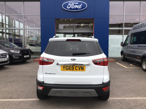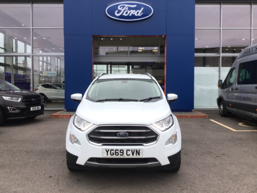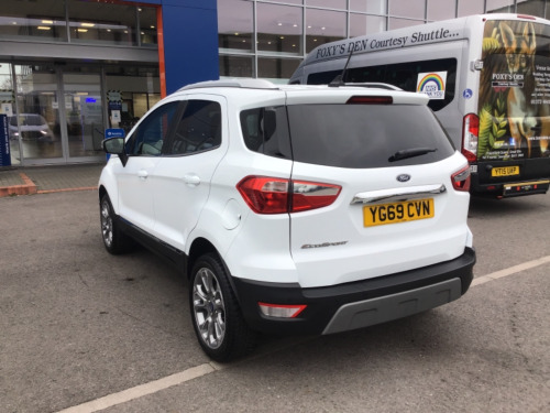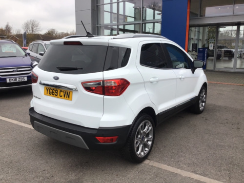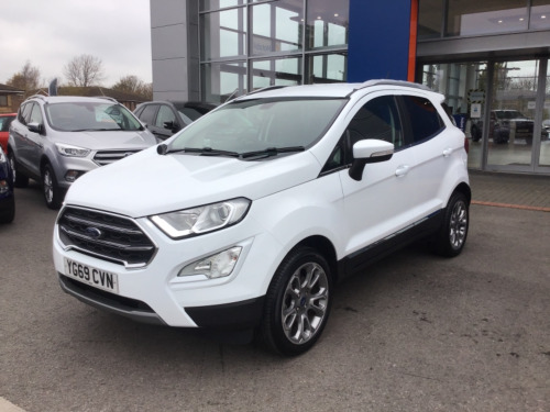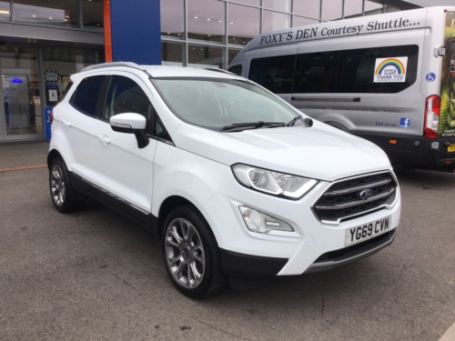 Ford Ecosport 1.0 EcoBoost 125 Titanium 5dr Cruise control, Easy fuel capless refuelling system, PAS, SYNC 3 nav system with DAB radio, 8" screen, voice control, emergency assistance, Apple car play/Android auto, 2x USB, Ford pass connect, Trip computer, 'Quickclear' heated windscreen/heated washer jets, Auto dimming rear view mirror, Automatic headlights, Body colour door handles, Body coloured bumpers, Electrically adjustable and heated door mirrors, Front door threshold plates, Front fog lights, Front grille with chrome trim surround, Headlamps with LED day running lights, Headlight levelling control, Power foldable door mirrors with puddle lights, Power front and rear windows with global opening/closing, Rain sensing front wipers, Rear wiper, Silver roof rails, 12V socket in front and rear, 60/40 split rear seats, 7 shade adjustable ambient lighting, Centre console with sliding front armrest, Cooled glovebox, Courtesy lights with map reading light, Driver seat height/lumbar adjust, Driver's side glovebox, Driver/passenger sunvisors and lidded vanity mirrors, EATC - Electronic Auto Temperature control, Folding grab handles, Front head restraints, Front seat back map pockets, Front/rear floor mats, Groove cloth/leather upholstery, Illuminated glovebox, Illuminated luggage compartment, Isofix system on outer rear seats, Leather gear knob and handbrake grip, Leather steering wheel with audio controls, Luggage compartment carpet, Overhead console with sunglasses holder, Rake adjustable rear seats, Reach + rake adjustable steering column, Rear headrests, Steering wheel with chrome inserts, Storage drawers under front seats, Tie down hooks, Variable boot floor, Rear view camera pack - Ecosport, 3x3 point rear seatbelts, ABS, Child locks on rear doors, Curtain airbags, Driver airbag, Drivers knee airbag, Electronic Stability Programme with hill launch assist, Emergency brake assist, Front passenger airbag deactivation, Front side airbags, Passenger airbag, Seatbelt reminder for driver and front passenger, Traction control, Tyre pressure monitoring system, Immobiliser, MyKey system, Remote central locking, Thatcham 1 volume sensing alarm, Tyre inflation kit