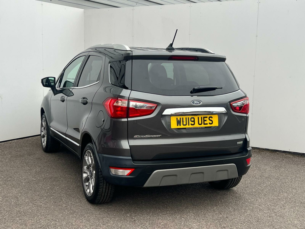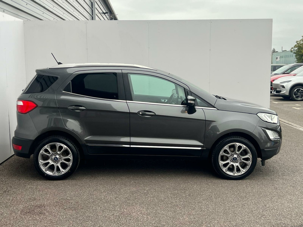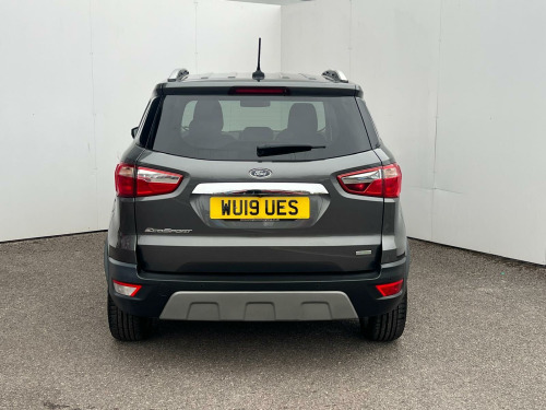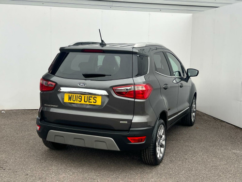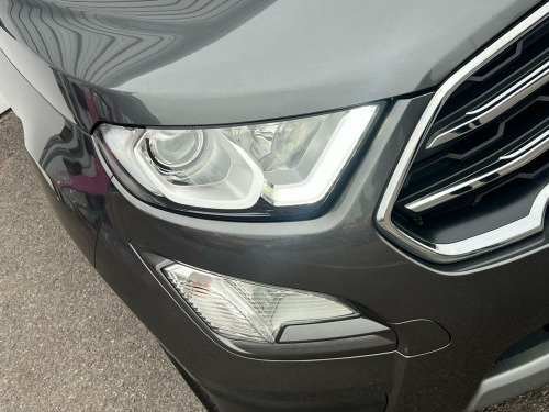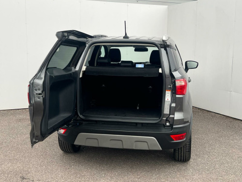 17in Alloy Wheels - 10 Spoke Flash Grey Machined, Adjustable Boot Load Floor, Air Conditioning - Electronic Automatic Temperature Control - EATC, Airbags - Curtain, Airbags - Driver and Front Passenger, Airbags - Drivers Knee, Airbags - Front Passenger De-Activation Switch, Alarm - Thatcham Category 1 with Volume Sensing and Perimeter, Ambient Lighting - Instrument Panel and Footwell, Analogue Instrument Cluster, Anti-Lock Braking System - ABS with Electronic Stability Control - ESC, Auto-Dimming Electrochromic Rear-View Mirror, Automatic Headlights, Centre Console Cup Holder with Chrome Accent, Centre Console with Covered Bin and Sliding Armrest, Child Locks, Chrome Headlight Bezel, Courtesy Light - Front with Two Map Lights, Courtesy Light - Rear, Cruise Control, Door Frame Beltline - Chrome, Door Handles - Body Colour, Door Mirrors - Body Colour Housing, Door Mirrors - Power-Foldable Heated with Integrated Side Indicator and Puddle Lights, Driver Seat Manual Height- Fore/Aft and Seatback Angle Adjustment and Recliner, Driver Seat Manual Rotary Knob Lumbar Support Adjustment, Driver and Passengers Sun Visor with Covered Vanity Mirror and Ticket Strip on Drivers Side, Drivers Stowage Glovebox, EPAS - Electric Power Assisted Steering, ESP - Electronic Stability Programme with Hill Launch Assist, Emergency Assistance, Engine Immobiliser, Ford Easy Fuel - Capless Refuelling System, Ford SYNC 3 Navigation with 8in Touchscreen, Front Fog Lights and Turn Indication Light Bezel - Body Colour, Front Fog Lights with Combined Turn Indication Light, Front Grille - Chrome, Front Seat - Passenger Manual - Fore-Aft and Recline Adjustment, Front Seat - Under Passenger Seat Stowage, Front Seats - 2-Way Head Restraint Up-Down, Front Seats - 3 Point Seat Belts with Load Limiter and Seatbelt Height Adjust, Front Seats - Seat-Back Map Pockets, Front Suspension - Independent with MacPherson Struts and Anti-Roll Bar, Front and Rear Bumper - Body Colour with Dark Insert, Front and Rear Floor Mats, Front and Rear Folding Grab Handles, Front and Rear Power Points - 12V, Full Length Overhead Console with Sunglasses Holder, Gear Shift Indicator, Gearshift Knob - Black Insert and Chrome-Finish Ring, Glovebox with Cool Bin - Lid and Illumination, Halogen Rear Lights, Handbrake Grip - Leather-Trimmed, Headlights - Courtesy Delay, Headlights - Levelling Control, Headlights - Projector Beam Headlight with LED Daytime Running Lights, Height Lumbar Adjustment on Drivers Seat, High Mounted Brake Light, IPS - Intelligent Protection System, Keyless Start with Ford Power Start Button, Leather Handbrake and Gearknob, Load Compartment - Lights, Load Compartment Carpet, Load Compartment Side Trim Incorporating Shopping Hooks, Lower Body Side - Door Claddings - Black with Chrome Insert, Manual Parking Brake, MyKey, Power Front and Rear Windows with Global Opening-Closing, Quickclear Heated Front Windscreen with Heated Washer Jets, Rake Adjustable Rear Seat, Rear Seat - 60-40 Split Folding Seats, Rear Seats - 2-Way Head Restraint Up-Down, Rear Seats - Centre Head Restraint - Up-Down, Rear Seats - Retractable Rear Seat Belt - 3-Point All Positions, Rear Suspension - Semi-Independent Twist Beam with Twin Gas and Oil-Filled Shock Absorbers, Rear View Camera Pack, Remote Central Locking, Rocker Panel and Side Cladding - Black, Seat Belt Reminder System - Drivers and Front Passengers, Seats - ISOFIX Mounting Provision for Child Seats - Outer Seats Only, Side Impact Door Beams, Silver Roof Rails, Soft Instrument Panel Cover, Steering Column - Rake and Reach Adjustment, Steering Wheel - Leather-Trimmed with Chrome Inserts, Suspension - Front Stabiliser Bar, Tailgate Handle - Chrome, Threshold Plates - Front - Stainless Steel with EcoSport Logo, Tie-Down Hooks, Trip Computer, Tyre Inflator Kit, Tyre Pressure Monitoring System, Tyre Repair Kit, Wipers - Front - Automatic with Rain Sensor, Wipers - Rear Wash-Wipe - Intermittent
