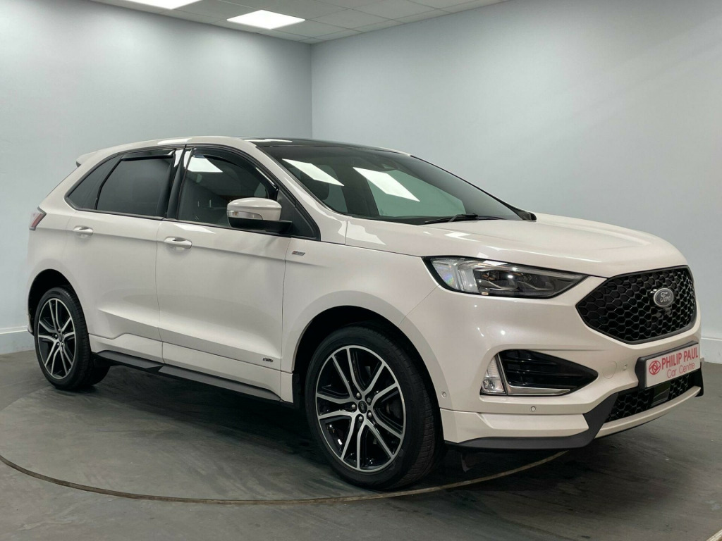 Here we have a stunning example of the Ford Edge EcoBlue AWD ST-Line, with the automatic 2.0 diesel engine. This model has been finished in a gorgeous Pearlescent White metallic, with a beautifully presented part leather interior. The Edge has a great service history (5x stamps in the book) and the condition is excellent throughout. We have put the vehicle through our comprehensive 125 multipoint check, completed by one of our fully qualified technicians. This high spec example has been hand picked by our highly experienced buyer, who has a very keen eye for the highest quality vehicles. The features on this model include, Cruise control, Satellite navigation, Climate control, Heated seats (Front & rear), Steering wheel mounted controls, Automatic headlights, Front and rear parking sensors, Front and rear Cameras, Quick-clear heated windscreen, Key-less start & entry, USB input, Bluetooth connectivity, APP Connect, B&O Audio, Automatic open/close tailgate, Electric windows, Electric mirrors and 20'' Alloy wheels. At Philip Paul car centre, we have many options available, including finance, part exchange, nationwide delivery, guaranteed asset protection and Williams paint protection. All of our vehicles come with a 3 month warranty, with options to extend cover for up to 2 years.. Blind Spot Information System, Panorama Roof.