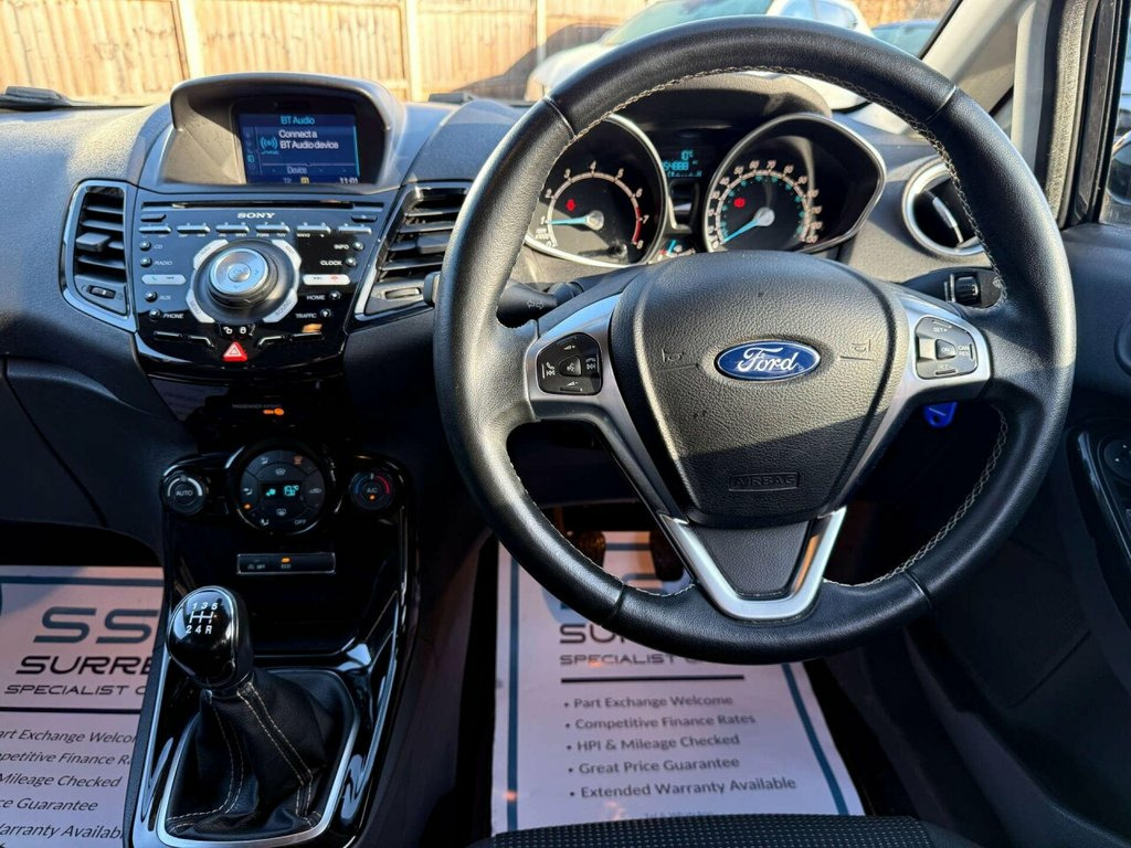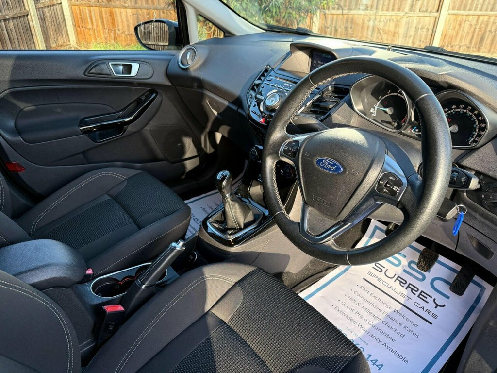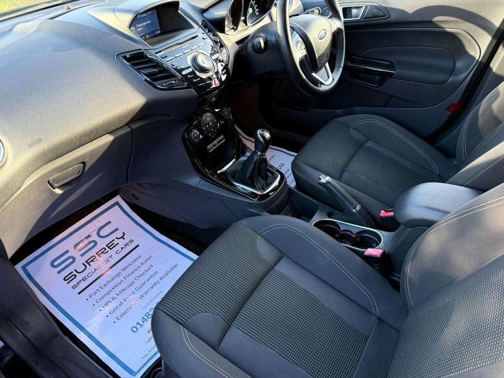 Introducing the Ford Fiesta 1.0 Fiesta Titanium T 5dr, a stylish and reliable hatchback that is sure to impress. With only 54810 miles on the clock and 2 previous owners, this Ford Fiesta is in excellent condition and ready to hit the road. Finished in sleek Black, this Fiesta Titanium T model exudes sophistication and modernity. Whether you're cruising through the city streets or embarking on a weekend adventure, this Ford Fiesta is the perfect companion. Don't miss out on the opportunity to own this fantastic Ford Fiesta. With its impressive mileage, limited ownership, and striking Black finish, it's a car that is sure to turn heads wherever you go. Upgrade your driving experience with the Ford Fiesta 1.0 Fiesta Titanium T 5dr today. We are open 7 days a week, and prepare all of our cars to the highest standards. We have a Click & Collect option available, and can also arrange delivery on request. All cars are HPI clear and a full history report is provided with every car. We welcome any inspection and viewing is highly recommended. All cars are available with our AA warranty. Debit and credit card facilities are available and we offer competitive finance packages. If you have any questions or would like to view any of our cars give us a call or drop us a message on whatsapp 01483 363 144 to arrange an appointment with one of our team. We also offer full bespoke walkaround videos on request. We are always on the lookout for high quality stock, if you have a car we ar Tyre Pressure Monitoring System, Tyre Repair Kit, Trip Computer, Tailgate Wash-Wipe, Tailgate Handle - Body Colour with Chrom, Suspension - Front Stabiliser Bar, Steering Wheel - 3 Spoke - Leather Trimm, Steering Column - Rake and Reach Adjustm, Sony CD Radio with DAB and Ford Sync, Seats - Drivers 4-Way Manual Adjustment, Removable Package Tray, Remote Central Locking with Two Flip Key, Rear Spoiler - Body Colour, Rear Privacy Glass, Drivers Seat Lumbar Support, Ford Easy Fuel Capless Refuelling System, Footwell Lights - Driver and Passenger, Floor Mats - Front and Rear - Velour, First Aid Kit and Warning Traingle Stora, Engine Immobiliser - Passive Anti-theft , Emergency Brake Warning - Au
