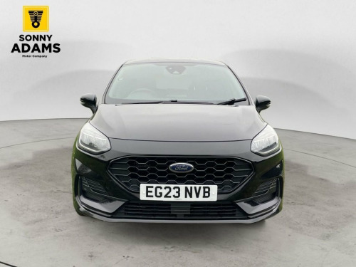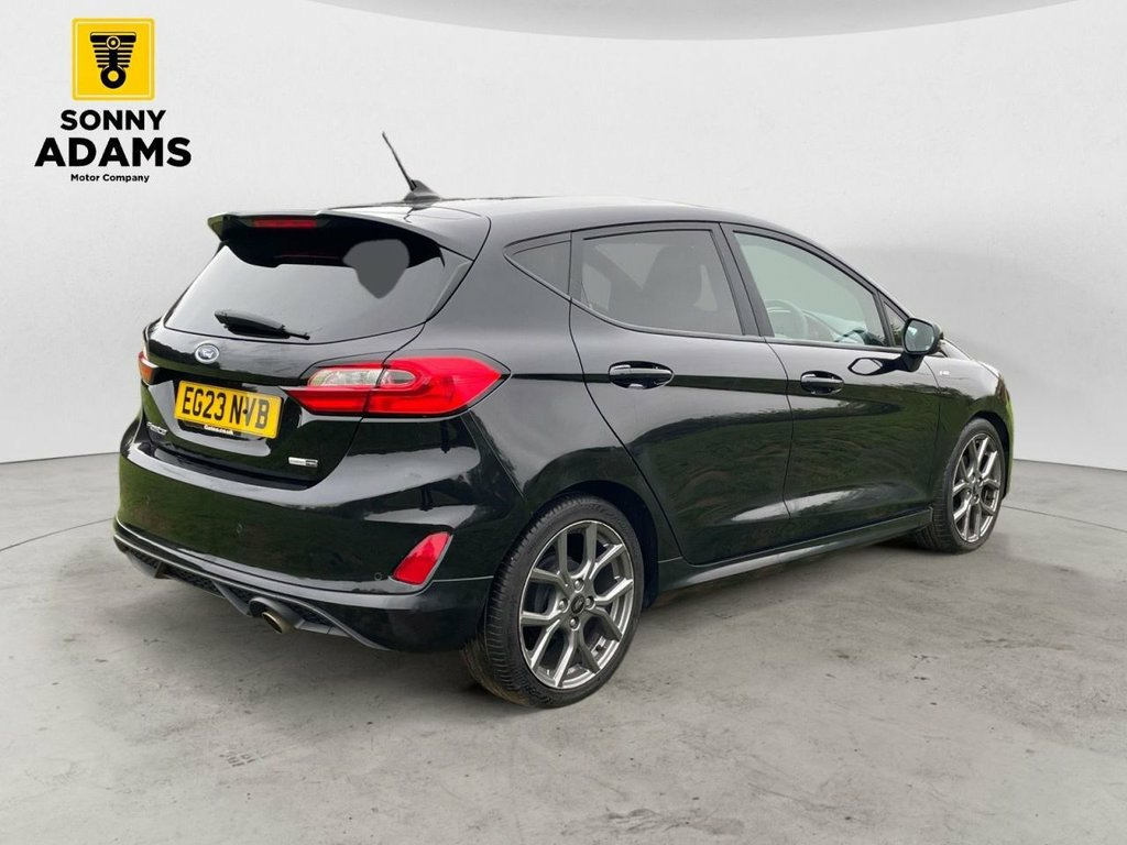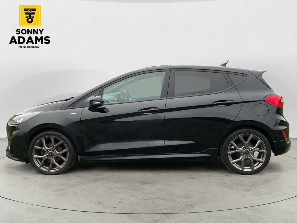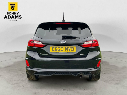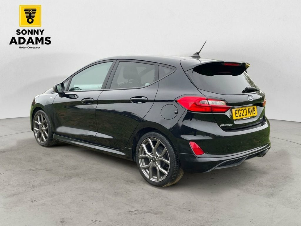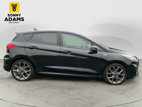 Now available is this sporty and efficient Ford Fiesta ST-Line Edition, finished in sleek Agate Black with eye-catching 17" ST-Line Rock Metallic alloy wheels and full ST-Line bodystyling. Powered by a 1.0L EcoBoost mild hybrid petrol engine producing 125ps and paired with a responsive manual gearbox, this hatchback delivers both spirited performance and excellent fuel economy, all while meeting Euro 6 emissions standards. The ST-Line trim gives the car a bold, athletic look with features like a unique ST-Line grille, large rear spoiler, sports suspension, and body-coloured side skirts. Inside, you'll find sports-style front seats, a flat-bottomed leather steering wheel, black headlining, and premium finishes including chrome door levers and a leather gearknob and handbrake. Technology and convenience are well catered for with Ford's SYNC 3 infotainment system featuring built-in navigation, Apple CarPlay, Android Auto, Bluetooth, and FordPass Connect with an embedded modem. Other highlights include cruise control, rear parking sensors, keyless start, automatic headlights, rain-sensing wipers, and selectable drive modes. For comfort and practicality, the Fiesta includes manual air conditioning, electric front and rear windows, a centre armrest with illuminated cupholders, Quickclear heated windscreen, and a 60/40 split-folding rear seat. Safety features include multiple airbags, Electronic Stability Control, Hill Start Assist, Emergency Brake Assist, ISOFIX c 17in Alloy Wheels - ST-Line 5-spoke - Ro, Air Conditioning - Manual, Airbags - Driver and Front Passenger, Airbags - Front Side Impact, Airbags - Front and Rear Side Curtain, Anti-Lock Braking System - ABS with Elec, Automatic Rain Sensing Wipers and Auto-D, Black Belt Line Finisher, Black Interior Headlining, Body Colour Bumpers, Cargo Area Cover, Centre Console with Armrest and Illumina, Chrome Finish Exhaust Pipe, Courtesy Light - Front Map Light and Rea, Cruise Control, Door Handles - Body Colour, Door Lever - Chrome Finish, Door Mirrors - Electrically-Operated and, Driver Seat with Manual Height Adjust, EPAS - Electric Power Assisted Steering, Electric Windows - Front, Electric Windows