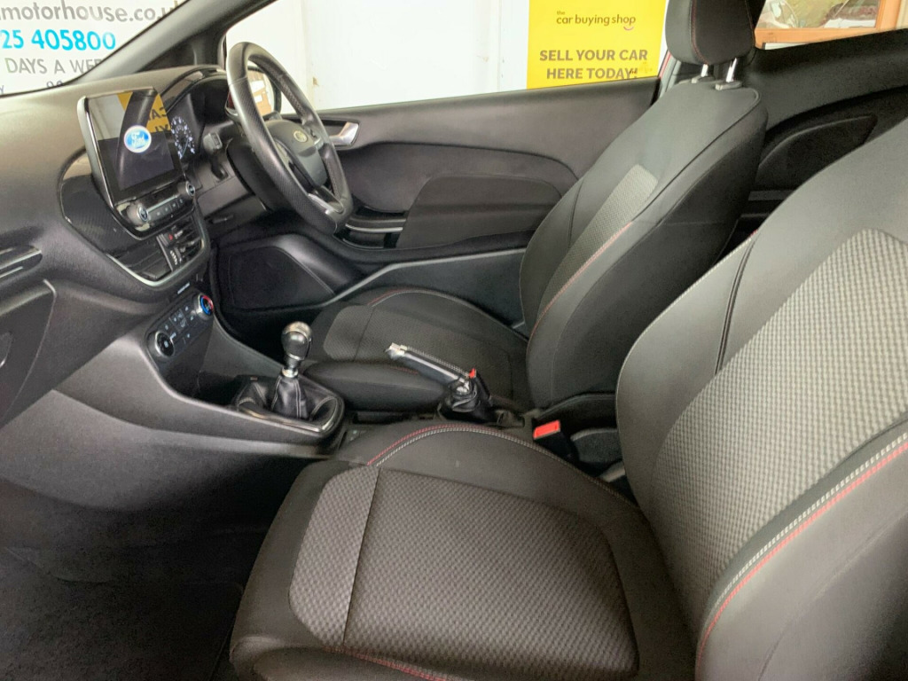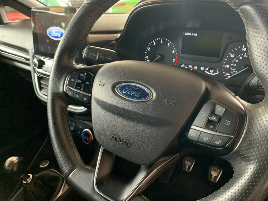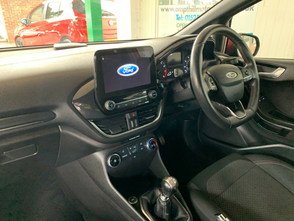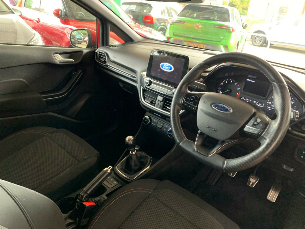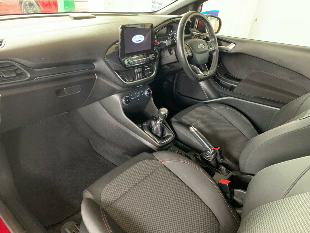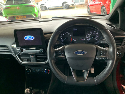 Satellite Navigation, Two Keys, HPI Clear, Fully Inspected, ST-Line, Two Keys, HPI Clear, Fully Inspected, This 2019 Ford Fiesta T ST Line boasts a full service history and a clear vehicle history check, offering peace of mind for its next owner. This Euro 6 compliant 1.0 litre petrol model comes with manual air conditioning and automatic headlights for added convenience. Inside, you'll find the Ford SYNC system, complete with a touchscreen, DAB radio, and seamless integration for Apple CarPlay and Android Auto, keeping you connected and entertained on every journey.The Fiesta T ST Line is designed for an engaging drive, accelerating from 0 to 62mph in just 10.0 seconds. Its low CO2 emissions highlight its efficiency, making it a more economical choice compared to similar vehicles. With MOT valid until September 2026, this well maintained Ford Fiesta is ready for its next adventure. in alloy wheels - 5x2-spoke - rock metallic, air conditioning - manual, airbags - driver and front passenger, airbags - front side impact, airbags - front and rear side curtain, anti-lock braking system - abs with electronic brake force distribution - ebd, black belt line finisher, centre console with two cupholders and 12v power point, courtesy light - front map light and rear - overhead led, door handles - body colour, door lever - chrome finish, door mirrors - heated - electric - integrated side indicators - body coloured, epas - electric power assisted steering, emergency brake warning - automatic hazard warning lights, enhanced electronic stability control - esc with traction control - emergency brake assist - eba - hill start assist - hsa and trailer sway control, ford easy-fuel capless refuelling system, ford sync with touchscreen - dab radio - apple carplay and android auto, front bumper - unique st-line, front door threshold plates - st-line, front seat - drivers manual height and fore-aft adjustment, front seats - sports style, gearshift knob - leather-trimmed with aluminium insert, glovebox - illuminated, headlights - automatic on-off, headlights - halogen projector with black bezel and dedicated led daytime running lights, headliner - black woven, headliner - woven-dark, ips - intelligent protection system, keyless start with ford power start button, large rear spoiler - body colour with centre high mounted stop light, leather-trimmed handbrake, mykey, ncap pack, overhead console - sunglasses holder, quickclear heated windscreen, rear bumper - unique st-line, rear fog lamps, rear lights - non-led, rear seat - 60-40 split back and cushion, remote central locking and engine immobiliser, st-line front fog lamps with cornering lights, st-line side skirt body mouldings - body colour, seats - isofix mounting provision for child seats, sports pedals, sports tuned suspension, steering column - rake and reach adjustment, steering wheel - st-line 3-spoke leather trimmed flat bottomed, tailgate wash-wipe, thatcham category 1 alarm, trip computer, tyre pressure monitoring system - tpms, tyre repair kit, unique st-line upper grille and full bodystyling kit with st-line wing badges, warning triangle storage, windows - electrically operated front with one touch lowering-closing on drivers side, wipers - standard with 6 speed interval settings
