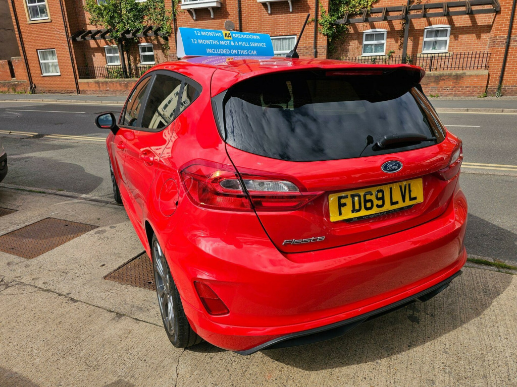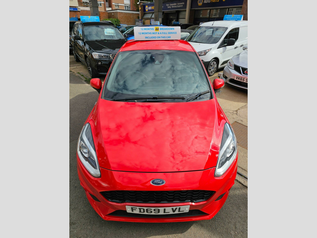 This Ford Fiesta, registered in 2019, is a stylish and practical hatchback that's perfect for navigating city streets and beyond. As a Fiesta T ST-Line with the ST-Line trim, it combines sporty aesthetics with everyday usability.Under the bonnet is a responsive 1.0L petrol engine, adhering to Euro 6 emission standards. The car comes equipped with the NCAP Pack, including automatic headlights for enhanced safety and convenience. Stay connected and entertained on the move with Ford SYNC, featuring a touchscreen display, DAB radio, Apple CarPlay, and Android Auto, all easily accessible via Bluetooth. Manual air conditioning ensures a comfortable cabin environment, whatever the weather.The low CO2 emissions of this vehicle mean it is kinder to the environment and potentially cheaper to run than similar cars with higher emissions. Furthermore, acceleration from 0-62mph in just 9.0 seconds means that this car is quicker than other similar vehicles.. 17in Alloy Wheels - 5x2-Spoke - Rock Metallic, Air Conditioning - Manual, Airbags - Driver and Front Passenger, Airbags - Front Side Impact, Airbags - Front and Rear Side Curtain, Anti-Lock Braking System - ABS with Electronic Brake Force Distribution - EBD, Black Belt Line Finisher, Centre Console with Two Cupholders and 12V Power Point, Courtesy Light - Front Map Light and Rear - Overhead LED, Door Handles - Body Colour, Door Lever - Chrome Finish, Door Mirrors - Heated - Electric - Integrated Side Indicators - Body Coloured, EPAS - Electric Power Assisted Steering, Emergency Brake Warning - Automatic Hazard Warning Lights, Enhanced Electronic Stability Control - ESC with Traction Control - Emergency Brake Assist - EBA - Hill Start Assist - HSA and Trailer Sway Control, Ford Easy-Fuel Capless Refuelling System, Ford SYNC with Touchscreen - DAB Radio - Apple CarPlay and Android Auto, Front Bumper - Unique ST-Line, Front Door Threshold Plates - ST-Line, Front Seat - Drivers Manual Height and Fore-Aft Adjustment, Front Seats - Sports Style, Gearshift Knob - Leather-Trimmed with Aluminium Insert, Glovebox - Illuminated, Headlights - Automatic On-Off, Headlights - Halogen Projector with Black Bezel and Dedicated LED Daytime Running Lights, Headliner - Black Woven, Headliner - Woven-Dark, IPS - Intelligent Protection System, Keyless Start with Ford Power Start Button, Large Rear Spoiler - Body Colour with Centre High Mounted Stop Light, Leather-Trimmed Handbrake, MyKey, NCAP Pack, Overhead Console - Sunglasses Holder, Quickclear Heated Windscreen, Rear Bumper - Unique ST-Line, Rear Fog Lamps, Rear Lights - Non-LED, Rear Seat - 60-40 Split Back and Cushion, Remote Central Locking and Engine Immobiliser, ST-Line Front Fog Lamps with Cornering Lights, ST-Line Side Skirt Body Mouldings - Body Colour, Seats - ISOFIX Mounting Provision for Child Seats, Sports Pedals, Sports Tuned Suspension, Steering Column - Rake and Reach Adjustment, Steering Wheel - ST-Line 3-Spoke Leather Trimmed Flat Bottomed, Tailgate Wash-Wipe, Thatcham Category 1 Alarm, Trip Computer, Tyre Pressure Monitoring System - TPMS, Tyre Repair Kit, Unique ST-Line Upper Grille and Full Bodystyling Kit with ST-Line Wing Badges, Warning Triangle Storage, Wipers - Standard with 6 Speed Interval Settings. Part service history