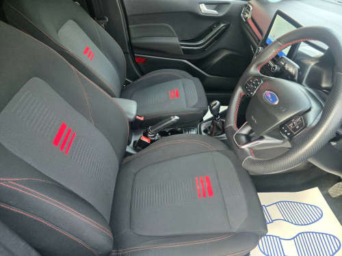 This 2022 Ford Fiesta T ST-Line is a superb example, having had only one owner since new. It boasts a responsive 1.0L petrol engine, meeting the Euro 6 emissions standard. Inside, you'll find the user friendly SYNC 3 system, complete with navigation, Android Auto, and Apple CarPlay, ensuring seamless connectivity. For added convenience and safety, this Fiesta is equipped with rear parking distance sensors and manual air conditioning. The exterior is enhanced by LED headlights, which include daytime running lights and integrated fog lights, along with automatic headlight activation for effortless driving.The performance of this Fiesta is highlighted by its 0-62mph acceleration time of 10.8 seconds, demonstrating its agile nature. These features collectively indicate how this particular Ford Fiesta T ST-Line offers a superior driving experience compared to other vehicles in its class, providing a blend of modern technology, comfort, and efficient performance.. 17in Alloy Wheels - 5x2-Spoke - Rock Metallic, 4.2in TFT Ice Blue Illumination Analogue Cluster with Trip Computer, Air Conditioning - Manual, Airbags - Driver and Front Passenger, Airbags - Front Side Impact, Airbags - Side Curtain, Anti-Lock Braking System - ABS with Electronic Brake Force Distribution - EBD, Automatic Rain Sensing Wipers and Auto-Dimming Rear View Mirror, Black Belt Line Finisher, Black Interior Headlining, Body Colour Bumpers, Cargo Area Cover, Centre Console - Premium with Openable Stowage Area with USB Connectivity - 2 Cupholders and 12v Power Point, Chrome Finish Exhaust Pipe, Courtesy Light - Front LED with Map-reading Light, Cruise Control includes Speed Limiter and Intelligent Speed Assistance, Door Handles - Body Colour, Door Lever - Chrome Finish, Door Mirrors - Heated - Electric - Integrated Side Indicators - Body Coloured, EPAS - Electric Power Assisted Steering, Electric Windows - Rear, Electrically-Operated Front Windows with One Touch Drivers, Emergency Brake Warning - Automatic Hazard Warning Lights, Enhanced Electronic Stability Control - ESC with Traction Control - Emergency Brake Assist - EBA - Hill Start Assist - HSA and Trailer Sway Control, Floor Mats - Front Deluxe Carpet, Ford Easy-Fuel Capless Refuelling System, Front Bumper - Unique ST-Line, Front Fog Lamps with Cornering Lights, Front Seat - Driver 4-Way Manual Adjust, Headlights - Automatic, IPS - Intelligent Protection System, Interior Ambient LED Lighting, Keyless Start, LED Headlights with Daytime Running Lights and Integrated Fog Lights, Lane-Keeping Aid with Lane-Keeping Assist, Large Rear Spoiler - Body Colour with Centre High Mounted Stop Light, Locking Wheel Nuts, MyKey, Overhead Console - Sunglasses Holder, Parking Distance Sensors - Rear, Quickclear Heated Windscreen, Rear Bumper - Unique ST-Line, Rear Fog Lamps, Rear Privacy Glass, Rear Seat - 60-40 Split Back and Cushion, Remote Central-Double Locking, ST-Line Badge, SYNC 3 with Navigation, Seats - Front Passenger 2-Way Adjustment, Seats - ISOFIX Mounting Provision for Child Seats, Selectable Drive Modes, Side Panel - Bodyside Mouldings - Body Colour, Sports Tuned Suspension, Steering Column - Rake and Reach Adjustment, Steering Wheel - ST-Line 3-Spoke Sensico-trimmed Flat-bottomed with Red Stitching, Tailgate Wash-Wipe, Thatcham Category Alarm with Power Door Deadlocks, Traffic Sign Recognition, Auto High Beam and Driver Alert, Trip Computer, Tyre Pressure Monitoring System - TPMS, Tyre Repair Kit, Unique ST-Line Grille - Full Bodystyling Kit, and Large Body Coloured Rear Spoiler, SYNC 3 with Navigation, Cloth - Black-Red with Red Stitching.