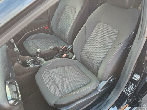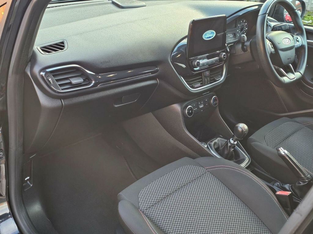 THIS LATE MODEL FIESTA ST-LINE IS PRESENTED IN METALLIC BLACK WITH DE-CHROMED BLACK ACCENTS WITH THE ST-STYLING PACK (INCLUDING FRONT/REAR BUMPERS, SILL MOULDINGS AND FRONT GRILLE) COMPLEMENTED BY 17 INCH MULTI-SPOKE ROCK METALLIC ALLOY WHEELS. THE RELIABLE 1.0 ECOBOOST ENGINE IS CONNECTED TO A MANUAL GEARBOX MAKING THIS CAR A COMFORTABLE AND ECONOMICAL DRIVE WHETHER AROUND TOWN OR ON THE MOTORWAY. THE FACELIFT INTERIOR CONTAINS COMFORTABLE SEATS (THE FRONT ARE SPORTS STYLE) IN CONTRASTING CHARCOAL GREY/MEDIUM GREY CLOTH WITH THE REST OF THE CABIN BENEFITING FROM GREY AND GLOSS BLACK ACCENTS. THE GENEROUS EQUIPMENT LIST INCLUDES A 4.2 INCH SCREEN IN THE INSTRUMENT CLUSTER PLUS A LARGE CENTRAL COLOUR TOUCH SCREEN GIVING ACCESS TO THE FORD SYNC SCREEN WITH,DAB RADIO/MEDIA STREAMING, BLUETOOTH TELEPHONE AND MORE. THERE IS ALSO AIR-CONDITIONING, LEATHER-TRIMMED MULTI-FUNCTION ST FLAT BOTTOMED STEERING WHEEL, AUTO HEADLIGHTS, KEYLESS START, HEATED WINDSCREEN AND EVEN MORE YET TO BE DISCOVERED. WE HAVE FULLY INSPECTED AND SERVICED THIS CAR, SO THE ONLY ISSUE FOR ITS NEW OWNER WILL BE WHERE THE NEXT TRIP SHOULD BE. PLEASE CALL 0161 761 3452 (OPTION 2) TO ARRANGE A VIEWING, TO RESERVE THE CAR OR FOR MORE INFORMATION. WHILST EVERY EFFORT HAS BEEN MADE TO ENSURE THAT THE STATED SPECIFICATION IS ACCURATE, PLEASE CHECK WITH A MEMBER OF THE SALES TEAM IF A PARTICULAR SPECIFICATION/FEATURE IS IMPORTANT TO YOU.