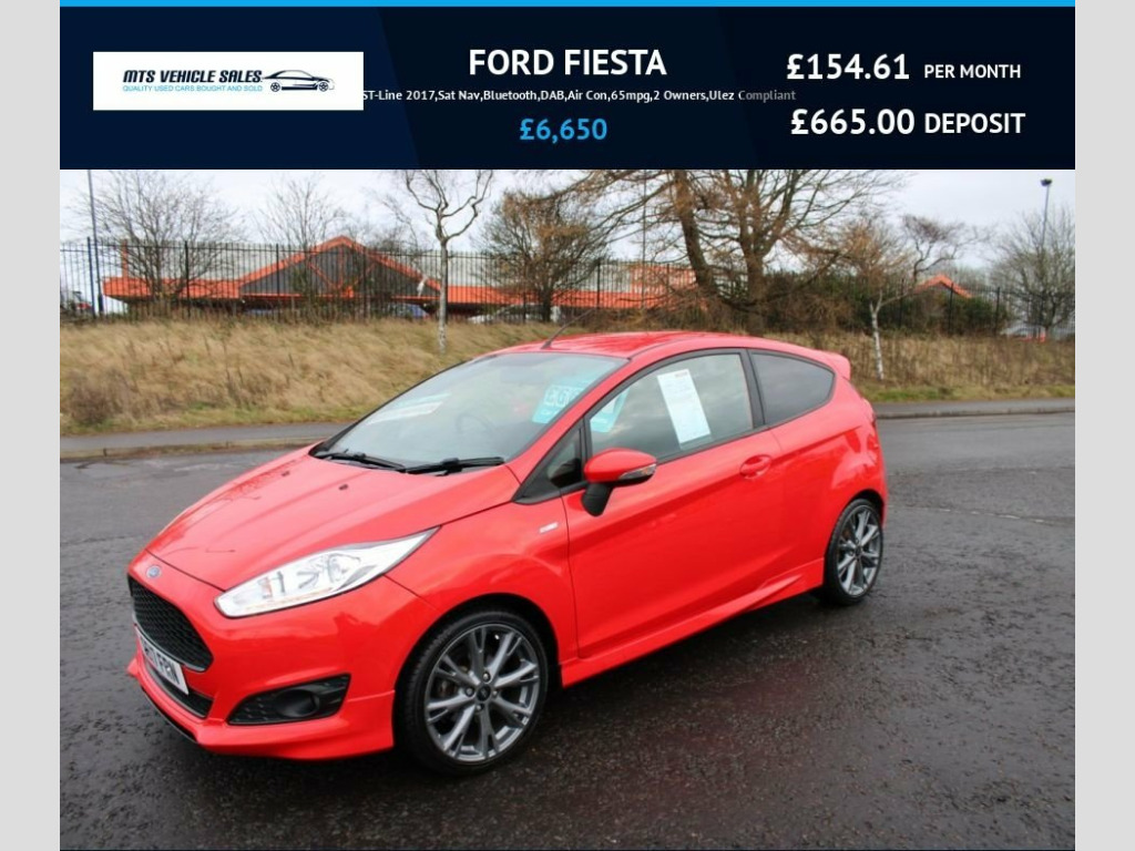 Very Clean Example of Fiesta ST-Line, Comes with 17*Graphite Alloy Wheels,Sat Nav,Privacy Glass,Remote Central Locking(2 keys)DAB,Bluetooth,Air Con,,usb/aux ports,Heated Front Screen,Very Economical Returns Average 65mpg ,2 Owners,Superb Looking&Driving Car,Finished in Gleaming Race Red,Ulez Compliant 17in Alloy Wheels - 8-Spoke - Rock Metal, Bumpers - Front and Rear Body Colour, Centre Console, Courtesy Light - Front with Map Reading , Courtesy Light - Overhead with Theatre-S, Courtesy Light - Rear, Door Handles - Body Colour, Door Mirrors - Electrically-operated and, Double Locking, Dress Up Kit - Full, Drivers Seat Lumbar Support, Electrically-Operated Front Windows with, Emergency Brake Warning - Automatic Haza, Engine Immobiliser - Passive Anti-theft , EPAS - Electric Power Assisted Steering, ESP - Electronic Stability Programme, First Aid Kit and Warning Traingle Stora, Footwell Lights - Driver and Passenger, Ford DAB with Ford SYNC, Ford Easy Fuel Capless Refuelling System, Front F