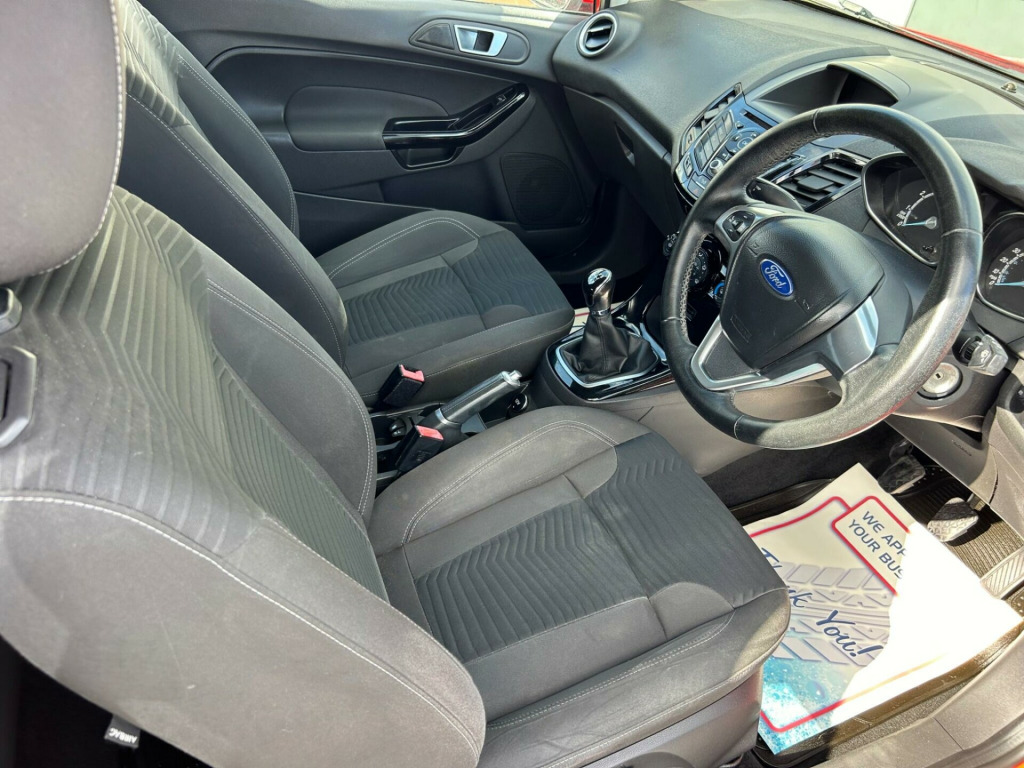 Finished In Bright Red This 2015 Ford Fiesta offers an appealing option for those seeking a reliable and stylish hatchback. As a Zetec trim, this Fiesta is equipped with a 1.25L petrol engine and complies with Euro 6 emission standards. The car includes desirable features such as 16in multi-spoke alloy wheels, manual air conditioning, and Bluetooth hands-free phone connectivity.One of the key advantages of this particular Fiesta is its low insurance group, which can lead to significant savings on insurance premiums. The inclusion of air conditioning enhances the driving experience, ensuring comfort during warmer months. The Bluetooth connectivity allows for safe and convenient hands-free phone use while on the move. This Ford Fiesta Zetec combines practicality with modern features, making it a smart choice for a variety of drivers., in alloy wheels - multi-spoke, 12v power socket - front, 15in alloy wheels - 5x2 spoke, abs - anti-lock braking system, aux connection, aesthetic lighting package, air conditioning - manual, airbags - curtain, airbags - driver side knee, airbags - front passenger, airbags - head and thorax, airbags - passenger deactivation, bluetooth hands-free phone, body colour exterior mirrors, brake warning lights - automatic flashing of brake lights under heavy braking, bumpers - front and rear - body colour, centre console - with trinket tray - two cup holders, chrome belt line finisher, courtesy light - overhead with theatre-style dimming, courtesy lights with map reading lights, dds - deflation detection system, daytime running lamps, door handles - body colour, door mirrors - electrically operated and heated, drivers airbag, eba - emergency brake assist, ebd - electronic brakeforce distribution, ecomode, epas - electric power assisted steering, esp - electronic stability programme, electric windows - front with one touch lowering drivers, emergency assistance, emergency brake warning - automatic hazard warning lights, engine immobiliser, flow through centre console, ford am-fm cd audio system, ford easy fuel capless refuelling system with misfuel inhibitor, ford sync, front fog lights - chrome bezel rings, front lower grille insert and surround - black, front seatback map pockets - driver and passenger, front upper grille - chrome finish surround, front upper grille insert - chrome bars, gear knob - leather, gearshift indicator light, gearshift knob - leather-trimmed with chrome finish bezel, glovebox - illuminated, head restraints - 2-way adjustment, head restraints - rear 2-way adjustment, headlights - follow me home, headlights - halogen projector with silver bezel, headliner - woven, heated front windscreen, high-mounted rear brake light, hill start assist, ips - intelligent protection system, interior door lever - chrome finish, led ambient courtesy lighting, leather-trimmed handbrake, loadspace compartment light, loadspace floor carpet, locking wheel nuts, mykey, pollen filter, rake and reach steering adjustable, rear courtesy lights, rear spoiler - body colour, remote central locking, removable package tray, seats - 60-40 split folding back and fixed cushion, seats - drivers 4-way adjustment, seats - front comfort style, seats - isofix mounting brackets for child seats, speakers - x6, steering wheel - 3-spoke - leather trimmed with bezel, steering wheel - multifunction, stowage pockets - driver and front passenger seatbacks, tailgate handle - body colour with chrome finisher, tinted glass, traction control - tc, trip computer, tyre inflator kit, tyre pressure monitoring system, usb connection, voice control - audio