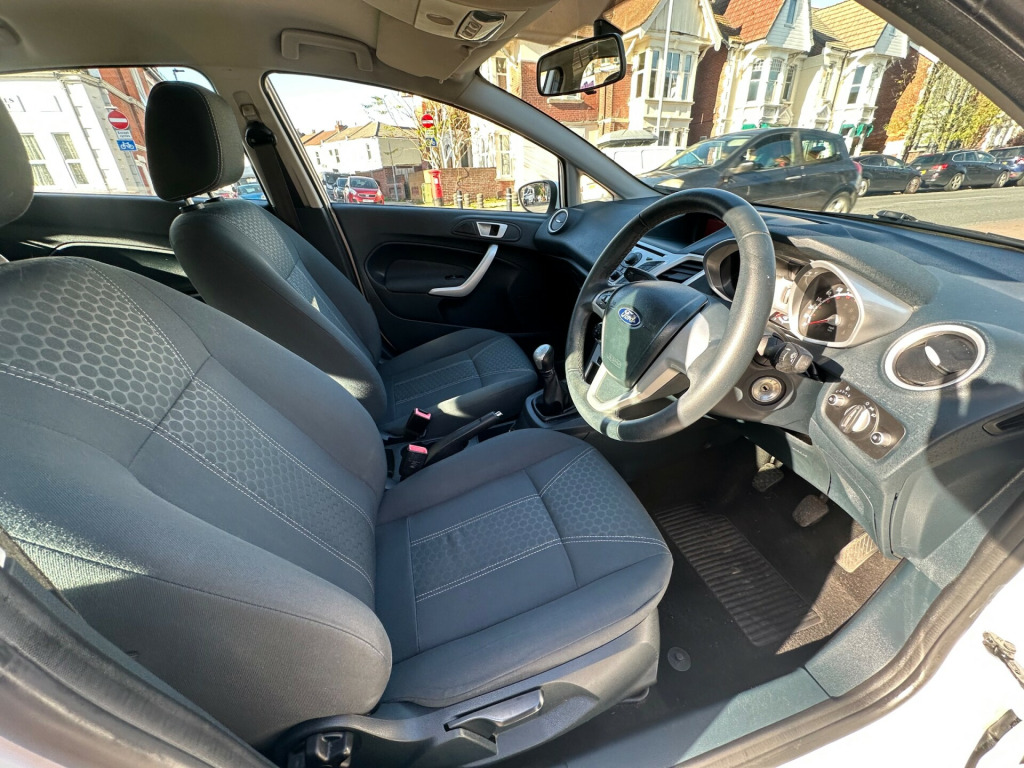 Introducing the 2012 Ford Fiesta 1.25 Zetec, a white hatchback featuring a petrol engine and manual transmission. With 78,500 miles, this car is ULEZ compliant and comes with a full service history and a new service. The MOT is valid until 5th November 2026, making it a great choice for efficient and reliable driving. in alloy wheels (195/50 tyres) with locking wheel nuts, body coloured bumpers, body coloured rear spoiler, electrically - operated/heated door mirrors with integrated side indicators, 60/40 split folding back and fixed cushion, centre console, electrically - operated front windows with one - touch lowering/closing on drivers side, four front speakers, leather gear knob, leather trimmed 3 - spoke steering wheel, manual 4 - way driver seat adjust, manual air-conditioning, quickclear heated windscreen, radio/cd, mp3 compatible, multifunctional 2 - line display, aux connection, rake and reach adjustable steering column, remote audio controls, trip computer, two cup holders, upholstery cloth, accessory power socket (12v), anti-lock brakes, emergency brake assist (eba), centre high - mounted rear brake light, centre rear seat belt, drivers airbag, drivers knee airbag, electric power assisted steering (epas), electronic brake - force distribution (ebd), electronic stability programme (esp), front fog lights with chrome bezel rings, front side airbag (head and thorax), front and rear head restraints, isofix mounting brackets for child seat (rear outer seats only), immobiliser, passengers airbag, remote central locking with two keys, seat buckle pre-tensioners on front seat belts, traction assist, tyre mobility kit