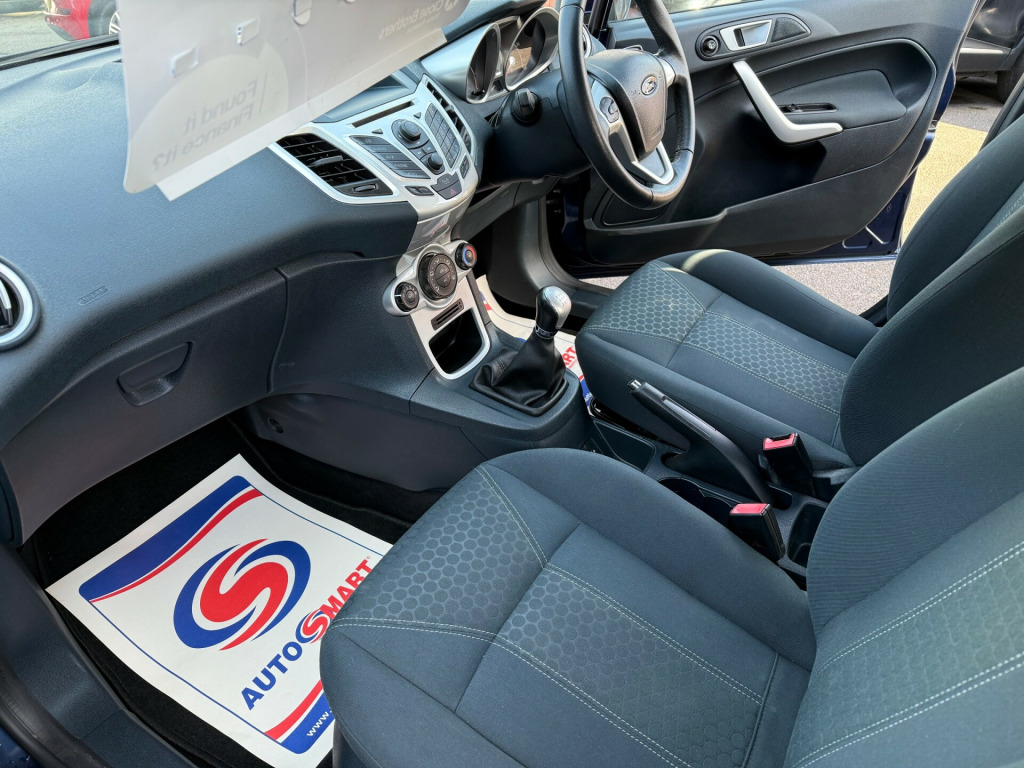 Lovely Ford fiesta comes with 12 months mot and service in alloy wheels (195/50 tyres) with locking wheel nuts, body coloured bumpers, body coloured rear spoiler, electrically - operated/heated door mirrors with integrated side indicators, 60/40 split folding back and fixed cushion, centre console, electrically - operated front windows with one - touch lowering/closing on drivers side, four front speakers, leather gear knob, leather trimmed 3 - spoke steering wheel, manual 4 - way driver seat adjust, manual air-conditioning, quickclear heated windscreen, radio/cd, mp3 compatible, multifunctional 2 - line display, aux connection, rake and reach adjustable steering column, remote audio controls, trip computer, two cup holders, upholstery cloth, accessory power socket (12v), anti-lock brakes, emergency brake assist (eba), centre high - mounted rear brake light, centre rear seat belt, drivers airbag, drivers knee airbag, electric power assisted steering (epas), electronic brake - force distribution (ebd), electronic stability programme (esp), front fog lights with chrome bezel rings, front side airbag (head and thorax), front and rear head restraints, isofix mounting brackets for child seat (rear outer seats only), immobiliser, passengers airbag, remote central locking with two keys, seat buckle pre-tensioners on front seat belts, traction assist, tyre mobility kit