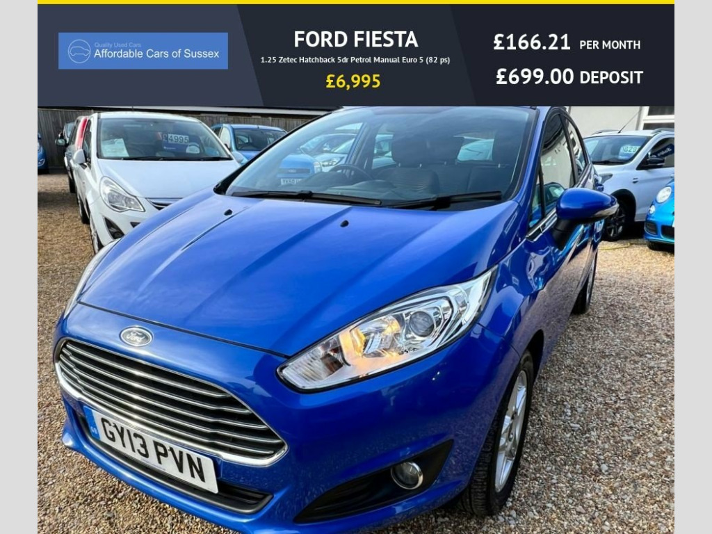 This 2013 Ford Fiesta 1.25 Zetec Hatchback 5dr Petrol Manual Euro 5 (82 Hatchback is currently available for £6,995 in Peacehaven East Sussex with Petrol engine and Manual gearbox. For more information or to arrange a viewing, click here to send us an email using form below.