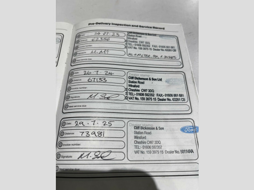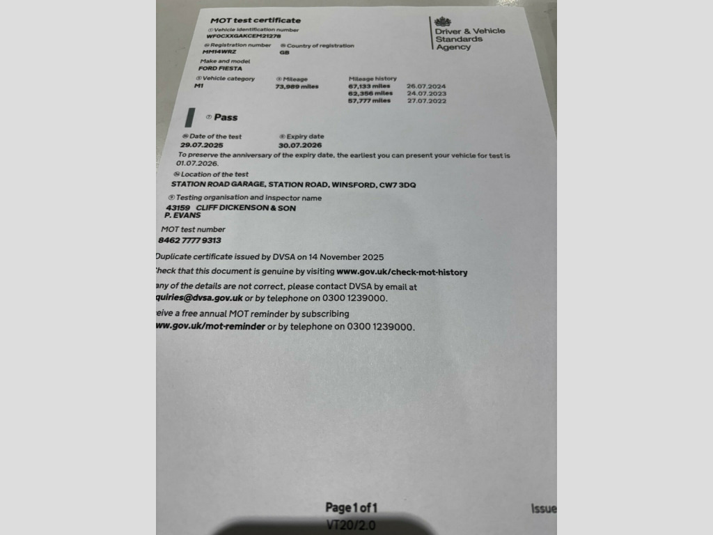 Cam Belt changed 67134 miles 26/07/2024 & Serviced by Main Ford supplying dealer. This 2014 Ford Fiesta TDCi Zetec offers exceptional value, having been owned by just one careful keeper from new. With a modest 76,889 miles on the clock, this popular hatchback is in great condition for its age. It features a responsive 1.5 litre diesel engine and comes equipped with manual air conditioning to keep you comfortable on every journey.The Fiesta TDCi Zetec stands out with its impressive fuel economy, achieving an outstanding 76 miles per gallon, which is significantly better than many other vehicles in its class. Furthermore, its low CO2 emissions and low insurance group rating mean that running costs are kept to a minimum, making this a very economical choice for everyday driving.. 12V Power Socket - Front, 15in Alloy Wheels - 5x2 Spoke, ABS - Anti-lock Braking System, Aesthetic Lighting Package, Air Conditioning - Manual, Airbags - Curtain, Airbags - Driver Side Knee, Airbags - Front Passenger, Airbags - Head and Thorax, Airbags - Passenger Deactivation, Brake Warning Lights - Automatic Flashing of Brake Lights Under Heavy Braking, Bumpers - Front and Rear - Body Colour, Centre Console - with Trinket Tray - Two Cup Holders, Chrome Belt Line Finisher, Courtesy Light - Overhead with Theatre-Style Dimming, Courtesy Lights with Map Reading Lights, Door Handles - Body Colour, Door Mirrors - Electrically Operated and Heated, Drivers Airbag, EBA - Emergency Brake Assist, EBD - Electronic Brakeforce Distribution, ECOmode, EPAS - Electric Power Assisted Steering, ESP - Electronic Stability Programme, Electric Windows - Front with One Touch Lowering Drivers, Emergency Brake Warning - Automatic Hazard Warning Lights, Ford AM-FM CD Audio System, Ford Easy Fuel Capless Refuelling System with Misfuel Inhibitor, Front Fog Lights - Chrome Bezel Rings, Front Lower Grille Insert and Surround - Black, Front Seatback Map Pockets - Driver and Passenger, Front Upper Grille - Chrome Finish Surround, Front Upper Grille Insert - Chrome bars, Gear Knob - Leather, Gearshift Indicator Light, Gearshift Knob - Leather-Trimmed with Chrome Finish Bezel, Glovebox - Illuminated, Handbrake Release Knob - Chrome, Head Restraints - 2-way Adjustment, Head Restraints - Rear 2-Way Adjustment, Headlights - Courtesy Delay, Headlights - Follow Me Home, Headlights - Halogen Projector with Silver Bezel, Headliner - Woven, Heated Front Windscreen, High-Mounted Rear Brake Light, Hill Start Assist, IPS - Intelligent Protection System, Interior Door Lever - Chrome Finish, LED Ambient Courtesy Lighting, Leather-Trimmed Handbrake, Loadspace Compartment Light, Loadspace Floor Carpet, Locking Wheel Nuts, MyKey, Passenger Airbag Deactivation Indicator, Passengers seat manual 2-way adjustment, Pollen Filter, Rake and Reach Steering Adjustable, Rear Courtesy Lights, Rear Seats Back - Carpet, Rear Spoiler - Body Colour, Remote Central Locking, Removable Package Tray, Seats - 60-40 Split Folding Back and Fixed Cushion, Seats - Drivers 4-Way Adjustment, Seats - Front Comfort Style, Seats - ISOFIX Mounting Brackets for Child Seats, Second Remote Ignition Key, Steering Wheel - 3-Spoke - Leather Trimmed with Bezel, Steering Wheel - Multifunction, Stowage Pockets - Driver and Front Passenger Seatbacks, Suspension - Front Stabiliser Bar, Tailgate Handle - Body Colour with Chrome Finisher, Trip Computer, Tyre Inflator Kit, USB and AUX Connection for External Music Devices. Full service history