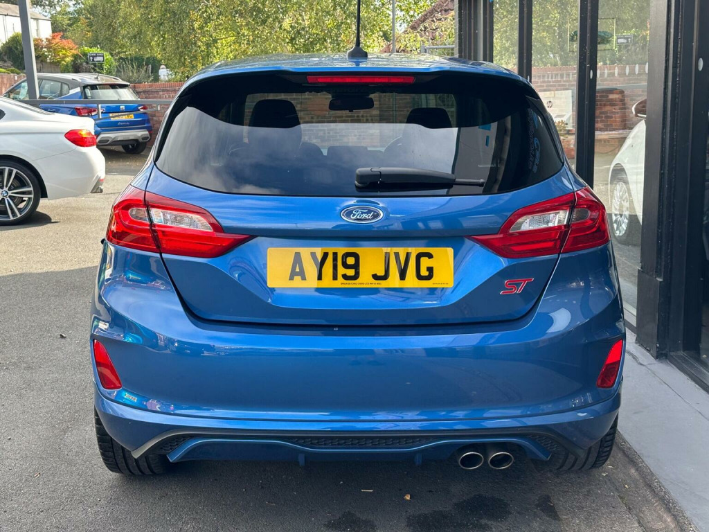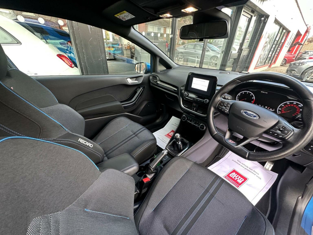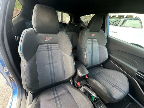 FULL SERVICE HISTORY. TOTALLY PRISTINE THROUGHOUT. CHARCOAL BLACK CLOTH RECARO with BLUE DETAIL. This 2019 Ford Fiesta ST-2 boasts exceptionally low mileage for its age, having covered just 40,000 miles, and comes with a clear vehicle history chec k. Under the bonnet, youll find a lively 1.5L Petrol Engine, compliant with Euro 6 emissions standards, offering an impressive 0-62mph acceleration in just 6.5 seconds. This ST-2 variant is equipped with desirable features including the B and O PLAY In-Car Audio Premium Sound System, complete with Android Auto, Apple CarPlay, and Bluetooth connectivity. For added convenience and safety, it includes the NCAP Pack with automatic headlights, and electronic automatic temperature control for the air conditioning. Experience enhanced comfort with heated driver and passenger seats, perfect for those colder mornings. The performance of this Fiesta ST-2, highlighted by its rapid acceleration, clearly sets it apart from other vehicles in its class. This combination of exhilarating performance, advanced technology, and comfort features makes this particular Ford Fiesta ST-2 a compelling choice for any driver seeking a dynamic and well equipped compact car.