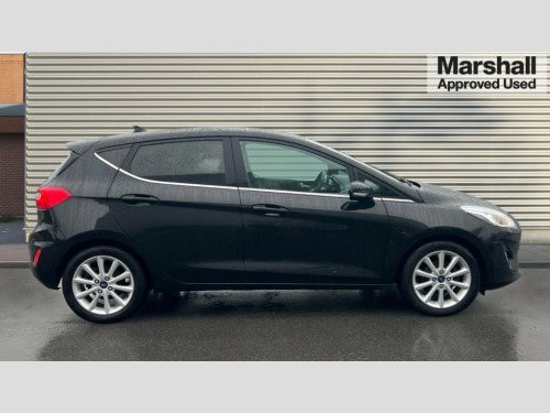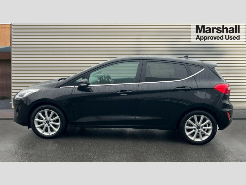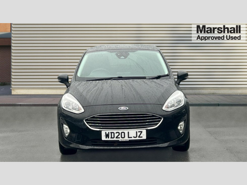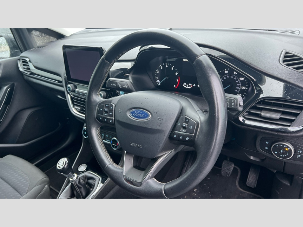 Ford Fiesta 1.0 EcoBoost 125 Titanium 5dr Bluetooth system, Electric power steering, Ford easy fuel, Ford SYNC 3 Navigation system incl 8" touchscreen, 7 speakers, FordPass connect, Apple carplay, android auto, voice control and emergency assistance, Rear parking distance sensors, Trip computer, 2 USB ports, Auxiliary input socket, DAB Digital radio, Steering wheel mounted controls, Body colour bumpers, Body colour door handles, Body colour rear spoiler, Body coloured electrically operated and heated door mirrors with side indicators, Chrome beltline trim, Chrome front grille, Chrome lower window surround, Cornering front fog lights, Electric front windows/one touch facility, Electric rear windows, LED Night signature to rear lights, Power foldable door mirrors with puddle lights, Quickclear heated windscreen, Rain sensing wipers and auto dimming rear view mirror, Rear privacy glass, Rear wiper, 12V Accessory socket in centre console, 3 spoke leather trimmed steering wheel with audio control, 60/40 split folding rear seat, Adjustable head restraints, Boot carpet, Centre console with armrest and illuminated cupholders, Chrome inner door handles, Cloth upholstery, Footwell illumination, Front and rear velour floor mats, Front map reading lights, Front seat and rear pockets, Height adjustable driver's seat, Illuminated glovebox, LED ambient lighting, Load area light, Luxury woven headliner, Manual air conditioning, Overhead console with sunglasses holder, Pollen filter, Rake/reach adjustable steering wheel, Sensico wrapped handbrake and gearknob, NCAP Pack - Fiesta, 3 point seatbelts on all rear seats, ABS+EBA, Curtain airbags, Driver and passenger airbags, Drivers knee airbag, Electronic stability control with hill start assist, Front passenger airbag deactivation, Front side airbags, Seatbelt warning, Two tone horn, Tyre pressure monitoring system, Keyless start with 'Ford Power' starter button, MyKey system, Remote central locking & engine immobiliser, Thatcham Cat.1 alarm, 16" 10 spoke alloy wheels